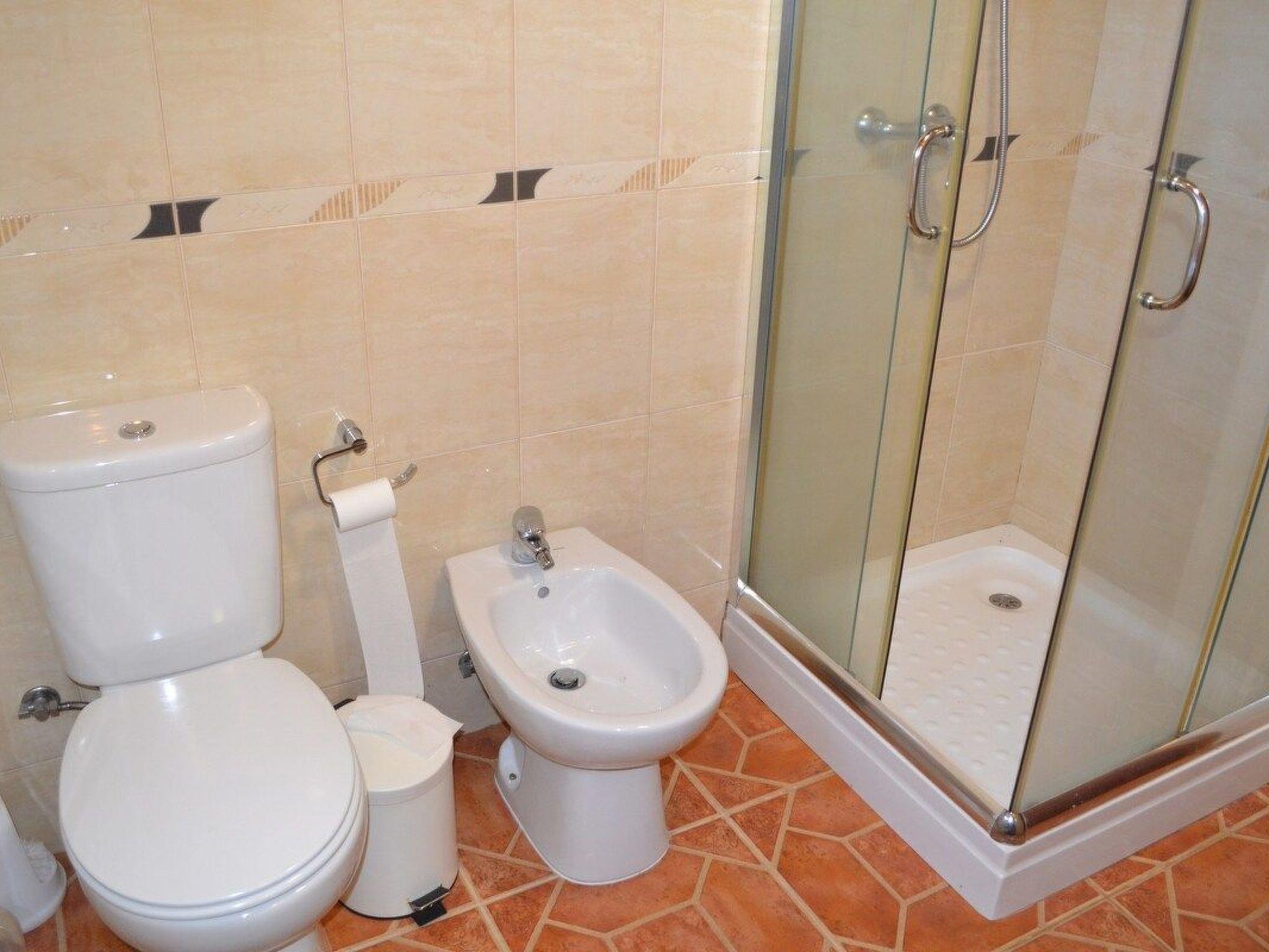 The bedroom has a double bed with bedside table and wardrobe. The bathroom has a shower, bidet and hand basin.