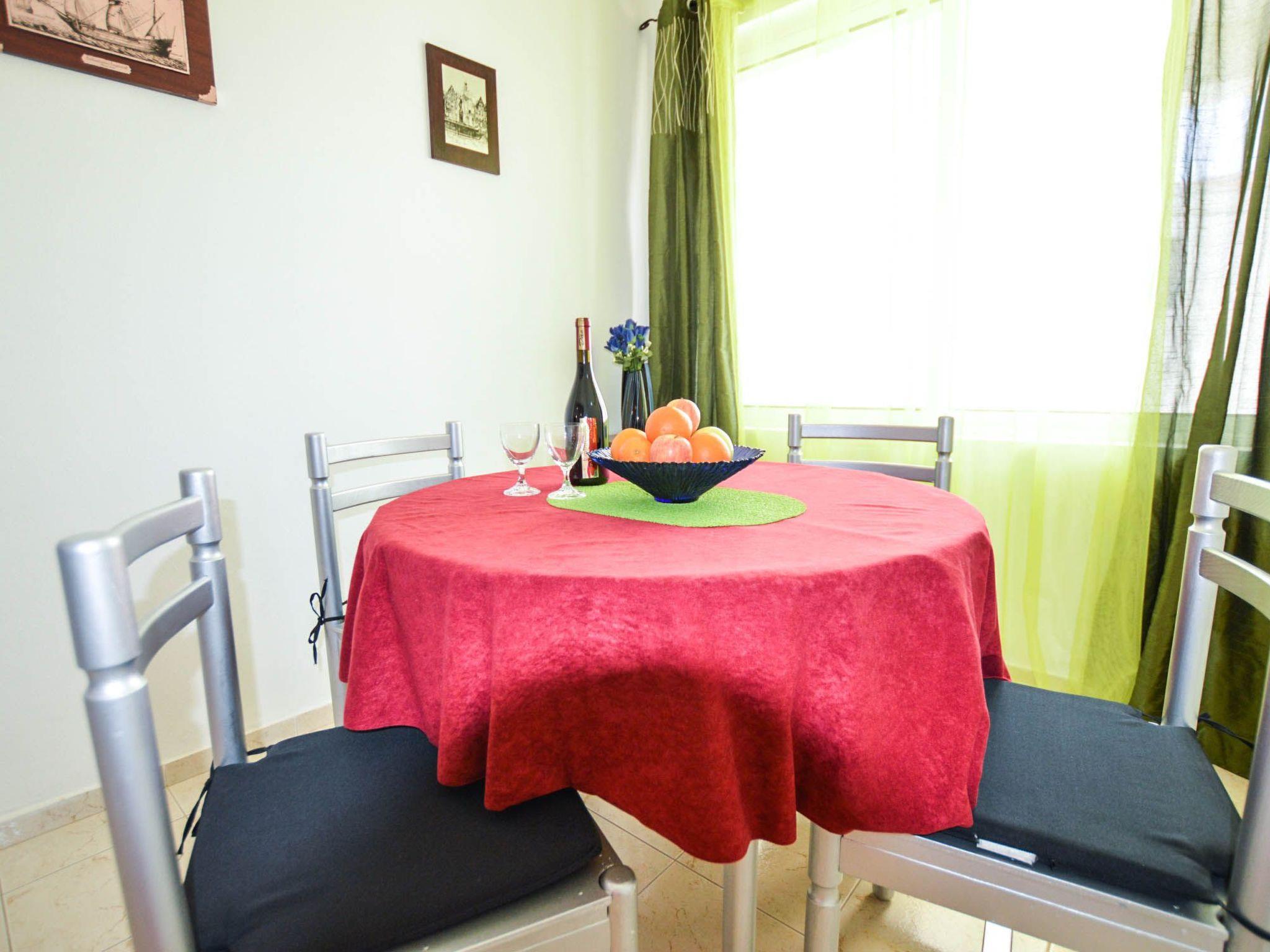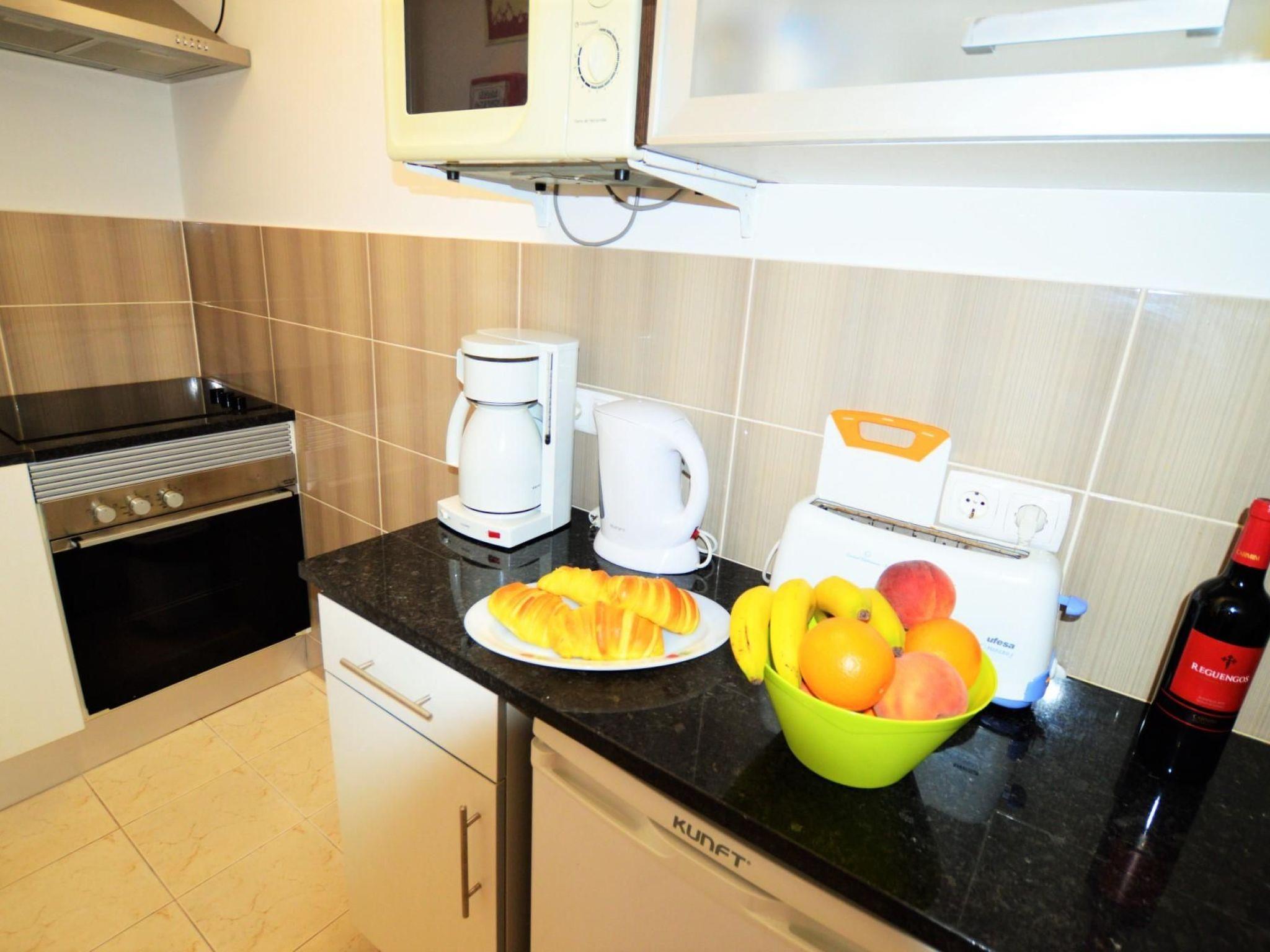 The 70m² apartment has two bedrooms, one with a double bed (160 x 190cm) and other with a sofa bed for a child (85 x 175cm). The spacious living room provides a sitting area with a big sofa and satellite TV, as well as a dining room with space for four people. The kitchen is equipped with a s