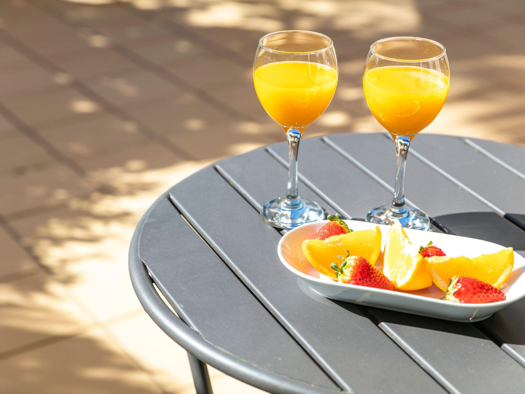 On the balcony adjacent to the living room, one can find a table with some chairs. Around the private pool there are 6 sun loungers.