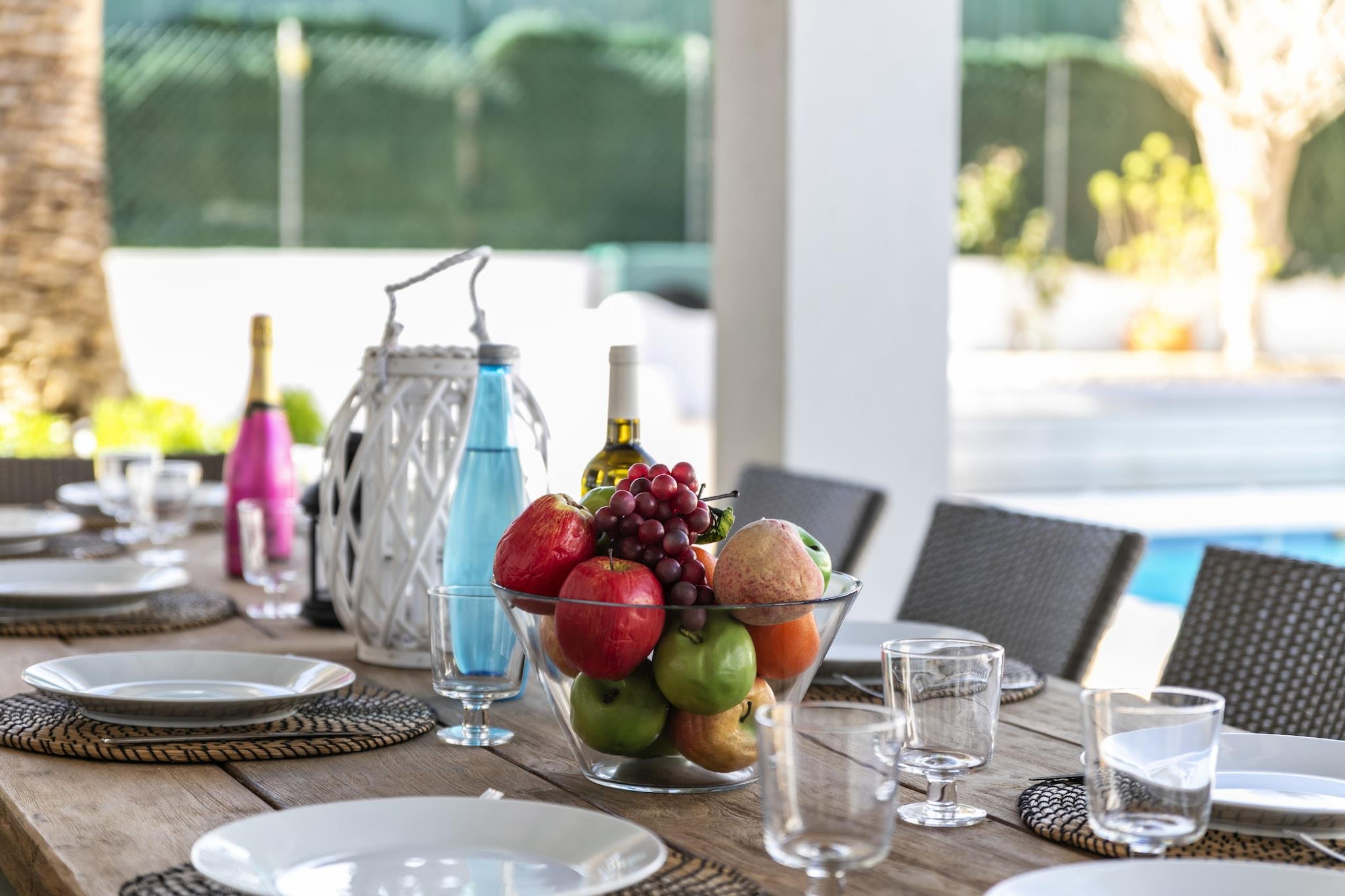 Køkken(elkedel, brødrister, kaffemaskine, ovn, mikrobølgeovn, opvaskemaskine , køle-fryseskab, Saftpresser, ), stue / spisestue(enkeltsovesofa, Fjernsyn(fladskærm, parabol, Smart-TV), spisebord, pejs, sofahjørne), soveværelse(dobbeltseng), soveværelse(dobbeltseng), soveværelse(enkeltseng, enkeltseng), soveværelse(enkeltseng, enkeltseng), soveværelse(king size-seng), badeværelse(bruser, føntørrer, , ), badeværelse(bruser, føntørrer, , ), badeværelse(bruser, føntørrer, , ), badeværelse(bruser, føntørrer, , ), badeværelse(toilet), Havemøbler, tørretumbler, bruser, vaskemaskine, balkon, varme(central), klimaanlæg, terrasse, have, solstole, grill, parkering, parkering, swimmingpool(privat, opvarmet), strygebræt, strygejern, føntørrer, , Wine glasses