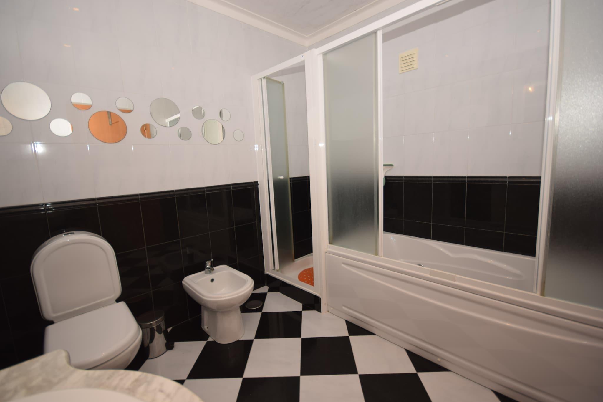Stueetage: (Køkken(elkedel, brødrister, komfur(Komfur med fire kogeplader, gas), kaffemaskine, ovn, grill, mikrobølgeovn, opvaskemaskine , køle-fryseskab, Saftpresser), stue / spisestue(Fjernsyn(fladskærm), pejs, DVD-afspiller, radio), soveværelse(dobbeltseng(150 x 190 cm)), soveværelse(2x enkeltseng(90 x 190 cm)), badeværelse(bruser, håndvask, toilet), badeværelse(badekar med bruser, håndvask, toilet, bidet), bryggers(vaskemaskine), havedøre) Kælderetage: (soveværelse(dobbeltseng(140 x 200 cm), toilet), Soveværelse med badeværelse(2x enkeltseng(90 x 200 cm), badekar med bruser, bruser, håndvask, toilet, bidet, balkon)) balkon, terrasse(privat), have(privat), havemøbler, solstole, grill, liggestole, swimmingpool(privat, 9 x 4 m., opened from Jan upto and including Dec), barneseng, barnestol