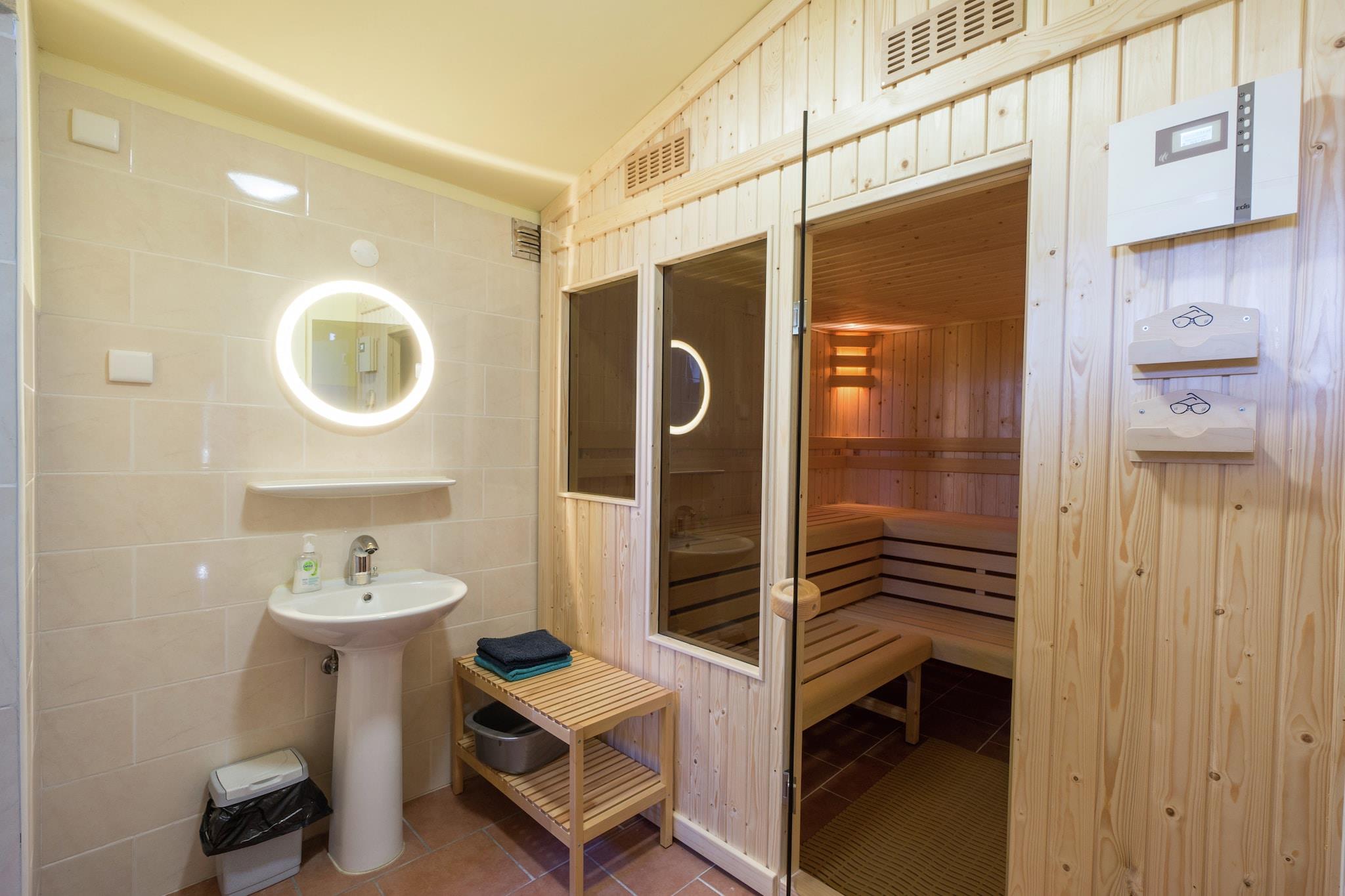 Stueetage: (åbent køkken(komfur(Komfur med fire kogeplader, gas), mikrobølgeovn, køle-fryseskab), stue / spisestue(dobbeltsovesofa, kakkelovn(træ), stereoanlæg, havedøre), soveværelse(dobbeltseng, køjeseng), badeværelse(bruser, håndvask), toilet, toilet, sauna(6 personer), havestue/veranda(havemøbler)) pulterkammer(på stedet)(vaskemaskine(deles med andre gæster, betalt)), parkering, trampolin(deles med andre gæster), swimmingpool(deles med andre gæster, 12 x 5 m.), sandkasse, legeredskaber, barneseng(på anmodning), barnestol(på anmodning)