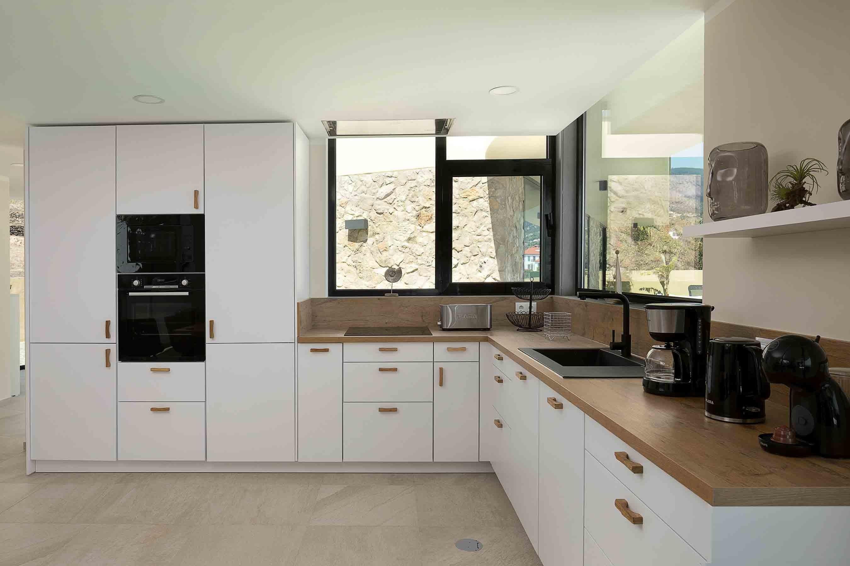 Im großen offenen Küche-Wohnbereich kommen alle zusammen. Eine riesige Fensterfront macht den Meerblick zum schönsten und natürlichsten Wandbild. In der Küche findet ihr alles, was ihr für euer Urlaubsglück benötigt. Wir waren selbst in unzähligen Ferienhäusern und wissen, wie wichtig es ist, auch mal scharfe Messer und vernünftige Pfannen und Töpfe zu haben. Für Kinder gibt es eigenes Geschirr, natürlich alles mikrowellen- und spülmaschinenfest. Die entsprechenden Elektrogeräte gibt es natürlich auch (Mikrowelle, Spülmaschine, Kühlschrank mit Gefrierfach, Herd + Backofen, Toaster, Wasserkocher, Mixer). Wir sind uns sicher, dass wir an alles gedacht haben. Wenn euch doch etwas fehlen sollte: dann meldet euch gern direkt bei uns oder bei unserem Kontakt für euch vor Ort. Wir geben alles, damit es für euch die besten Urlaubstage aller Zeiten werden.