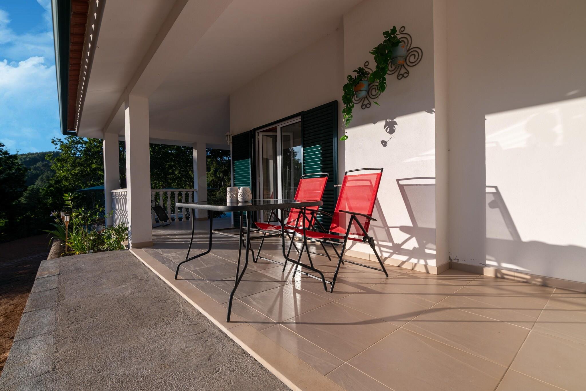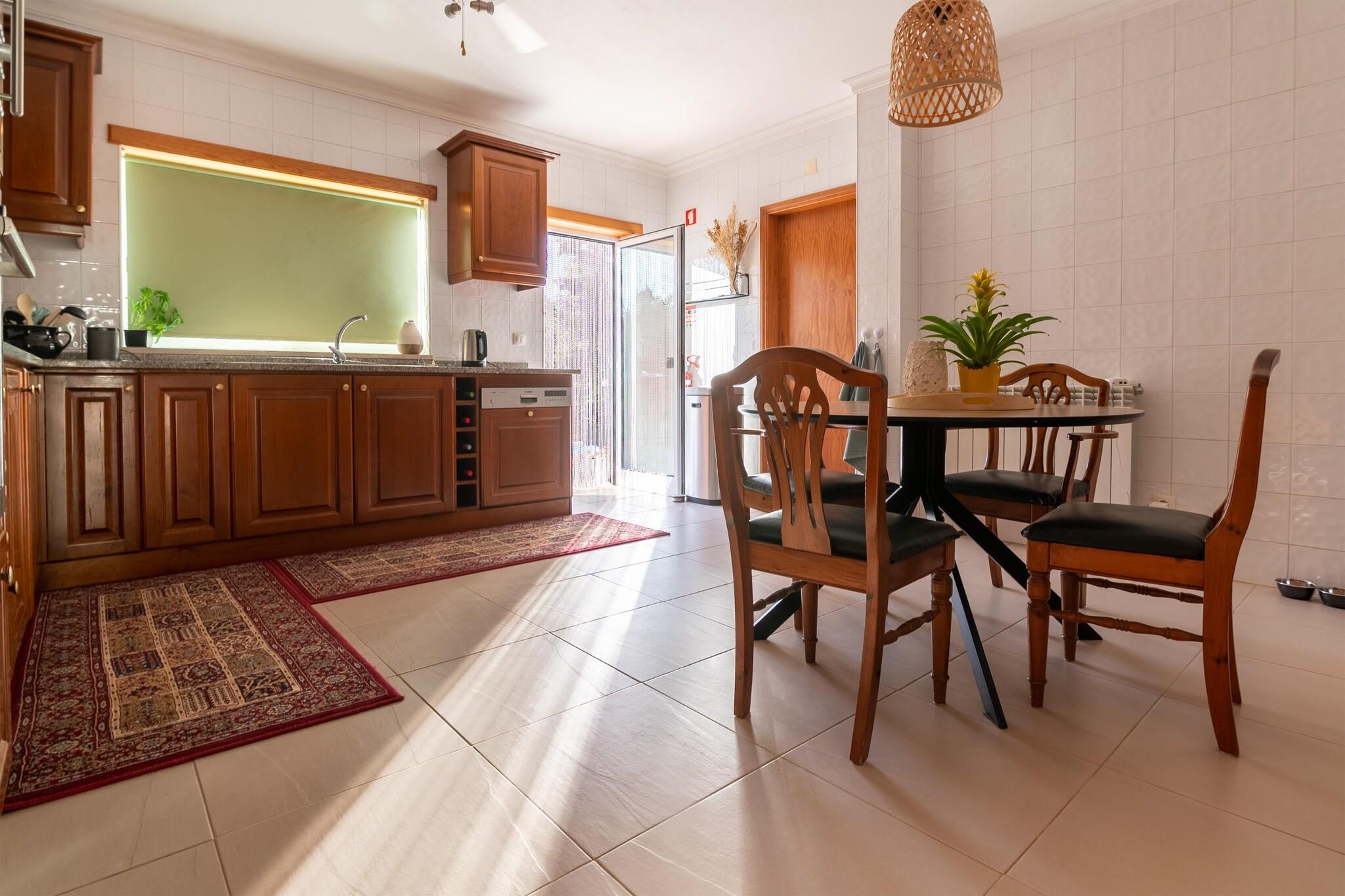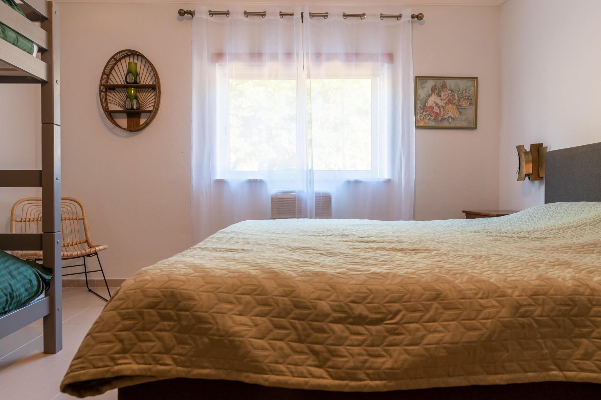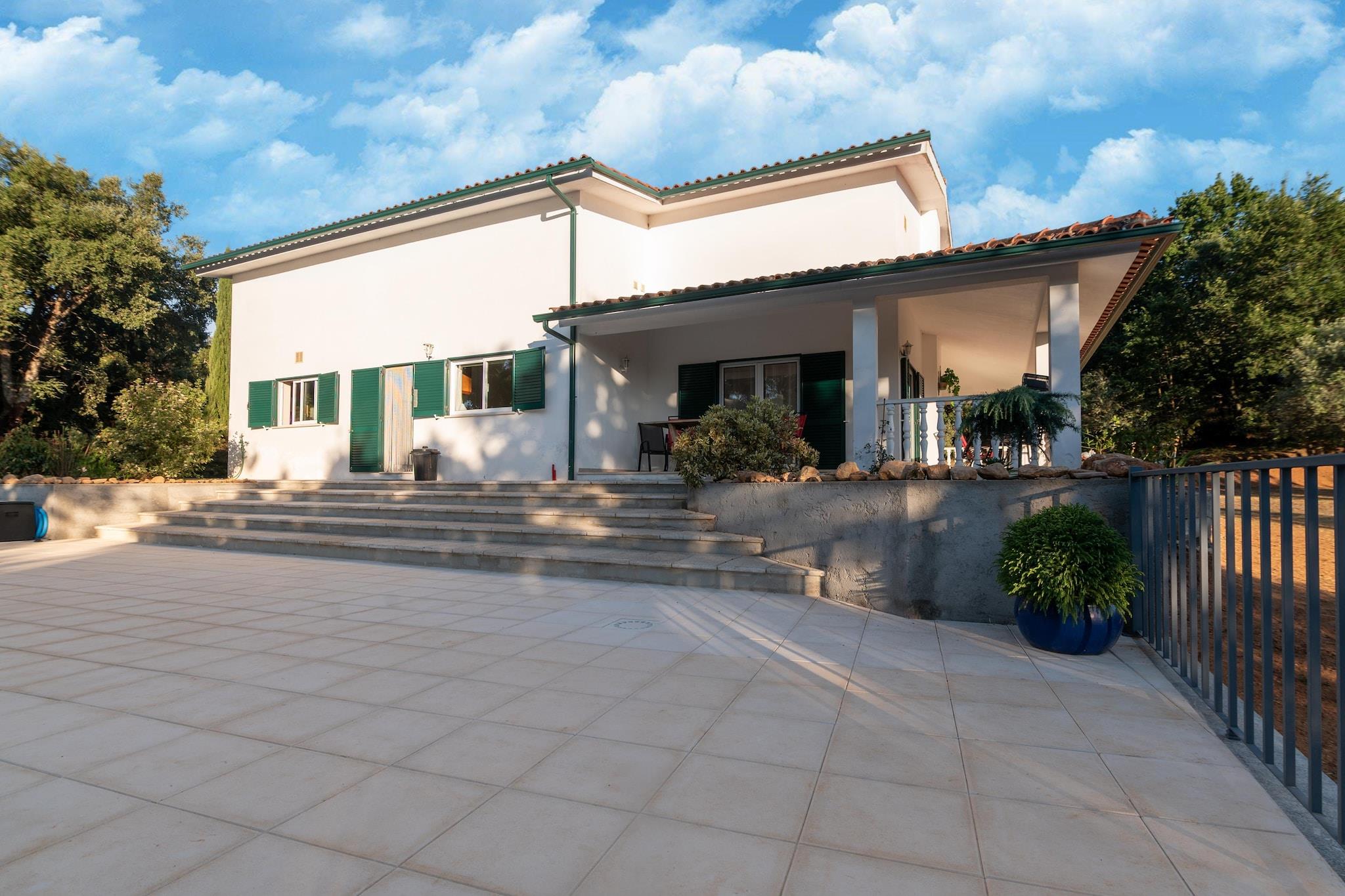 Stueetage: (Køkken(ovn, mikrobølgeovn, opvaskemaskine , køleskab, køle-fryseskab, vaskemaskine, elektriske kogeplader), stue / spisestue(Fjernsyn, kakkelovn, sofahjørne, radio), soveværelse(dobbeltseng, dobbelthøjseng), soveværelse(dobbeltseng, dobbelthøjseng), badeværelse(badekar eller bruser, håndvask, toilet, bidet), badeværelse(bruser, håndvask, toilet)) klimaanlæg, terrasse, have, havemøbler, grill, parkering, trampolin, swimmingpool(privat), legeredskaber, fodboldmål
