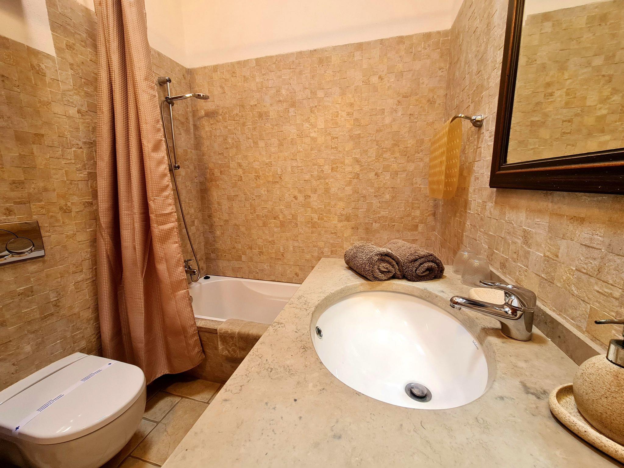 The interior of this exclusive villa leaves nothing to be desired. An open-plan living area, which flows seamlessly into the dining area and the well-equipped kitchen, creates an inviting living ambience. There are two elegant bedrooms with double beds and a further room with a double bed and a single bed with a pull-out guest bed - ideal for 2 adults or up to 4 children. Two bathrooms, one with a shower (en suite), the other with a bathtub, offer plenty of space and comfort. The comprehensive equipment also includes a washing machine, air conditioning and electric underfloor heating. Electric shutters and fly screens also guarantee maximum comfort.