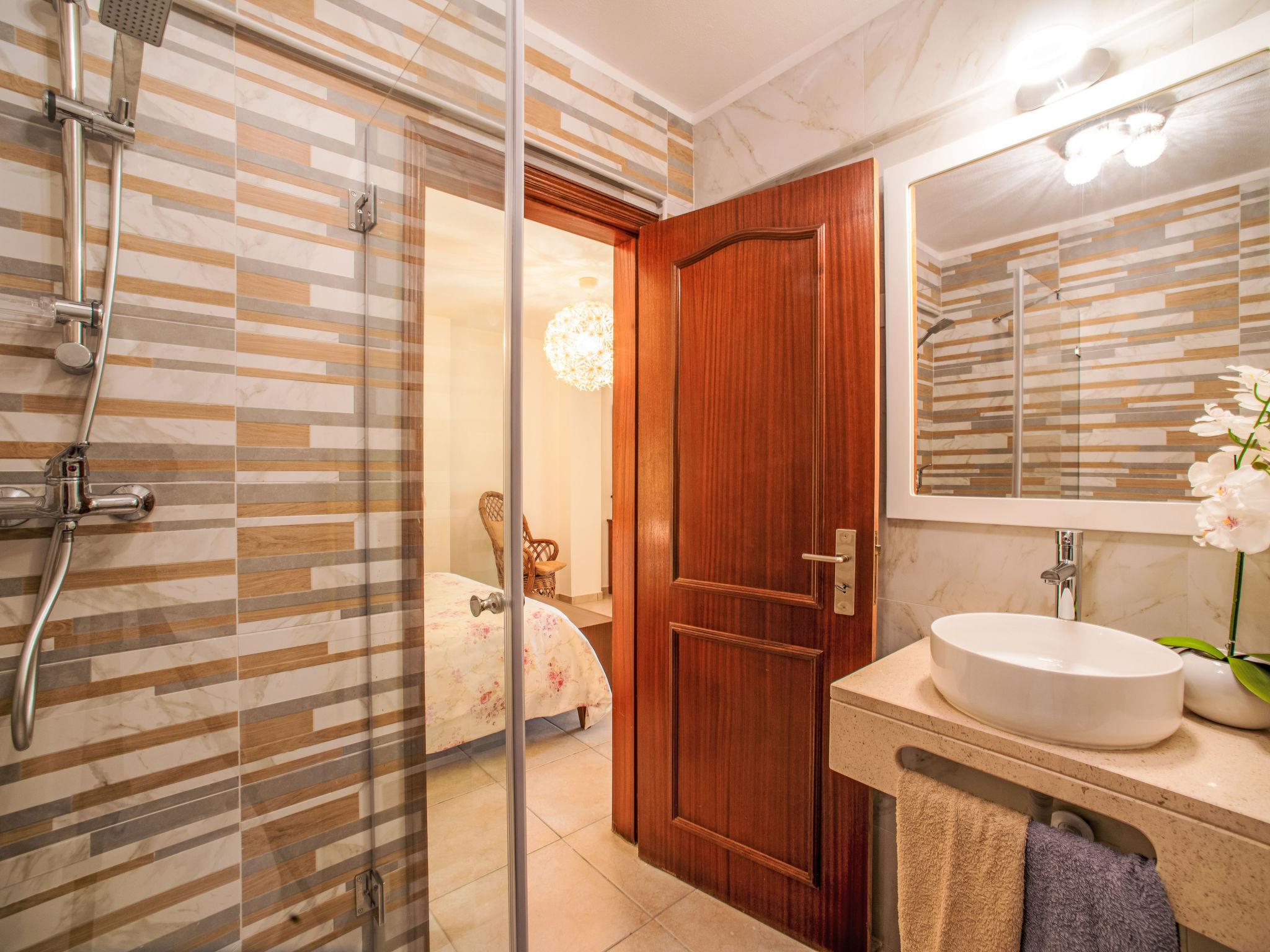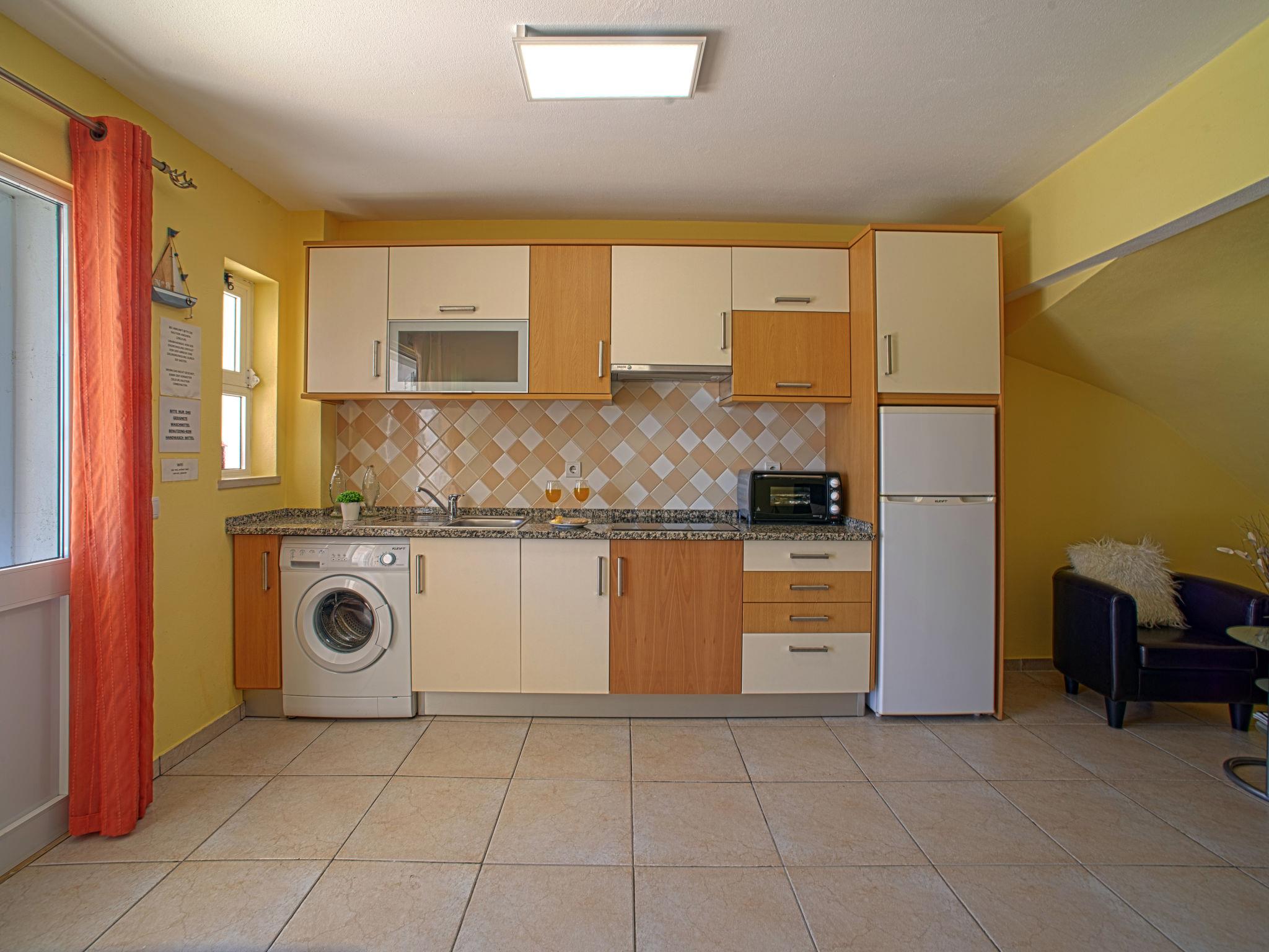 "Baia de Cristal 2", 2-room apartment 55 m2. Renovated in 2012, very practical and cosy furnishings: open living/dining room with dining table. Exit to the terrace. 1 room, without window with 1 french bed (160 cm, length 200 cm), shower/WC. Open kitchen (4 ceramic glass hob hotplates, toaster, kettle, microwave, freezer, electric coffee machine). Electric heating. Small terrace 50 m2. Terrace furniture, deck chairs (2). Facilities: washing machine, iron, hair dryer. Internet (WiFi, free). Please note: non-smokers only. Private entrance, fire extinguisher. No internal connecting door between the separated properties. 88915/AL
