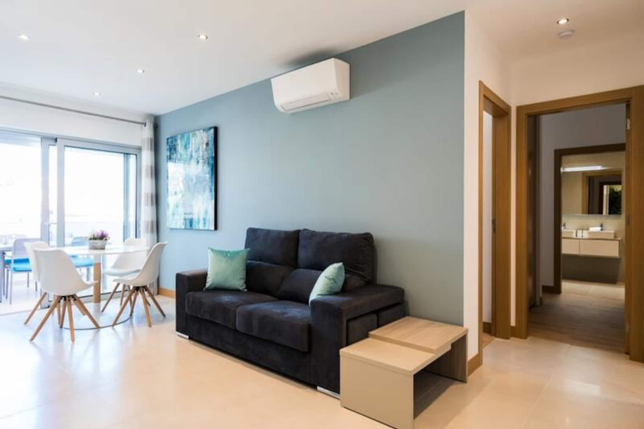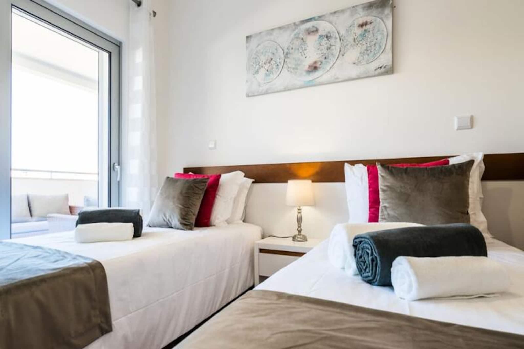 Denne moderne lejlighed med to soveværelser ligger blot 15 minutters gang fra Lagos' pulserende centrum og tilbyder den perfekte blanding af komfort og bekvemmelighed. Med de gyldne sandstrande Meia Praia og Batata inden for gåafstand kan dine dage tilbringes med at sole dig i Algarves sol eller udforske Lagos' historiske charme. Uanset om du søger afslapning eller eventyr, henvender denne beliggenhed sig til alle. Træd indenfor og bliv mødt af en lys, åben opholdsstue udsmykket med stilfulde møbler. Det fuldt udstyrede køkken kan prale af high-end apparater, hvilket gør det nemt at tilberede alt fra en hurtig morgenmad til en gourmetmiddag. Soveværelset har en luksuriøs kingsize-seng og et eget badeværelse med både badekar og bruser, mens det andet soveværelse tilbyder to enkeltsenge og adgang til et separat brusebad. Begge soveværelser åbner ud til en rummelig balkon, der strækker sig over hele lejligheden og er det perfekte sted at slappe af med en drink, mens solen går ned over byen. Gæsterne kan nyde den fælles tagterrassepool, ideel til at nyde den sydlige sol eller tage en forfriskende dukkert. Ejendommen er udstyret med aircondition, Wi-Fi og et tv for din komfort, og alt sengetøj og håndklæder er inkluderet. Selvom lejligheden ikke er egnet til børn under 12 år, og bygningen mangler elevator, lover den et roligt og sofistikeret tilflugtssted for voksne. Lagos er i sig selv en skattekiste af historie med sine bymure fra det 16. århundrede, brostensbelagte gader og travle marina. Fra vandlande og vandrestier til vinmarker og golfbaner tilbyder området et væld af aktiviteter. Lagos er let tilgængeligt fra Faro Lufthavn og er porten til Algarves fantastiske kystlinje og rige kulturarv. Uanset om du er her for at slappe af eller udforske, er denne lejlighed din perfekte base for et uforglemmeligt ophold.
