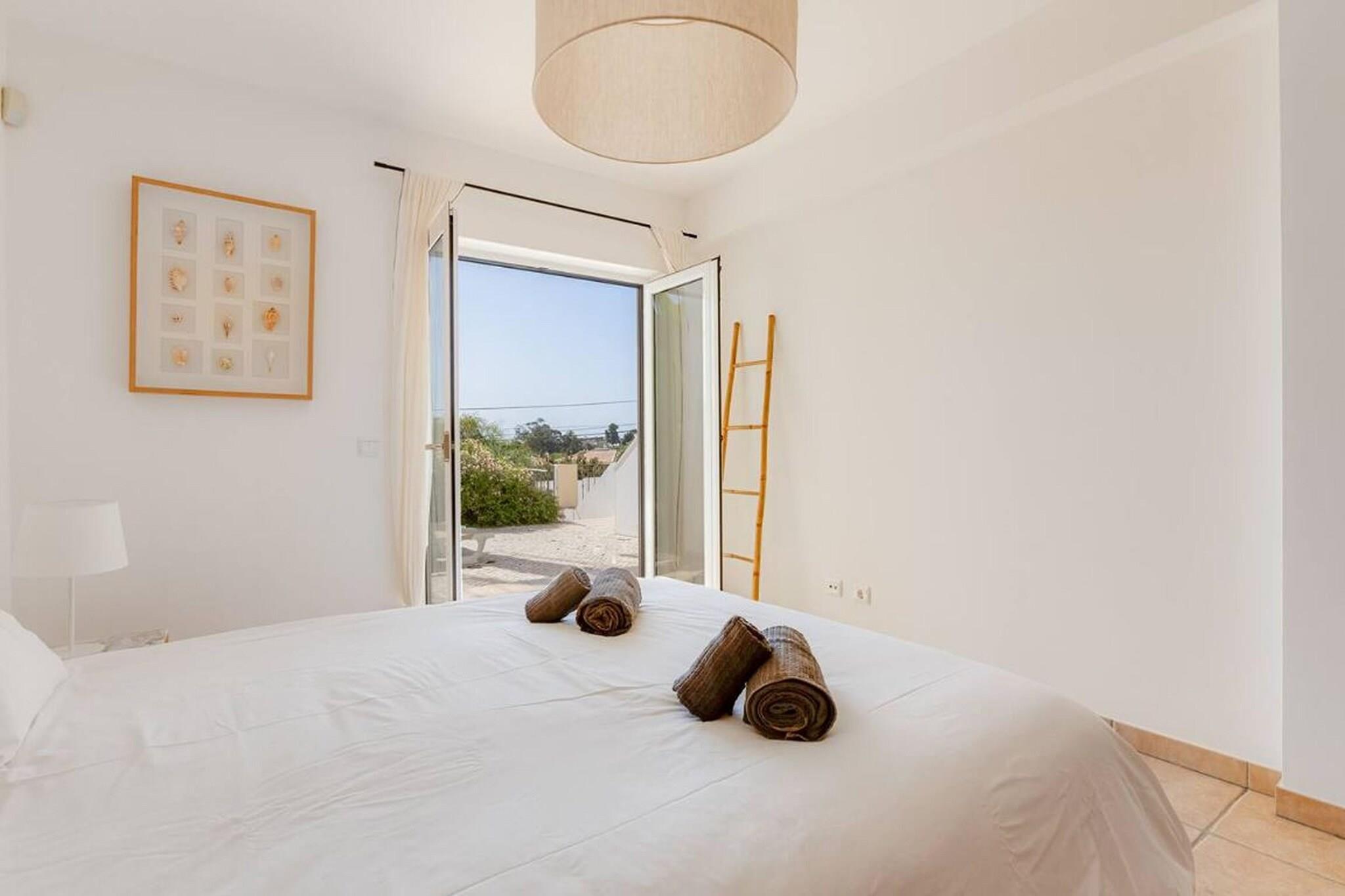 Helt fantastisk moderne dobbelthus villa med en utrolig panoramaudsigt over havet. Dette skønne hus består af 2 værelser, begge meget lyse og rummelige i stueetagen. Den ene er en suite, og den anden har et separat badeværelse. Begge værelser har adgang til en af terrasserne, hvor du kan slappe af på liggestolene og også har adgang til poolområdet. Poolen deles kun mellem de andre 5 huse i urbaniseringen. Indgangen til huset er fra øverste etage, hvor der er hovedkøkkenet, en stor stue, et gæstebadeværelse og en anden terrasse med udsigt over Meia Praia. Tagterrassen er storslået med fuldt udstyret køkken, spisestue og stue. Det er langt den bedste funktion i huset! Urbaniseringen er beliggende i et roligt boligområde, i kort afstand fra lystbådehavnen, centrum af Lagos og Meia Praia. En ferieindkvarteringsmulighed, du ikke vil fortryde!