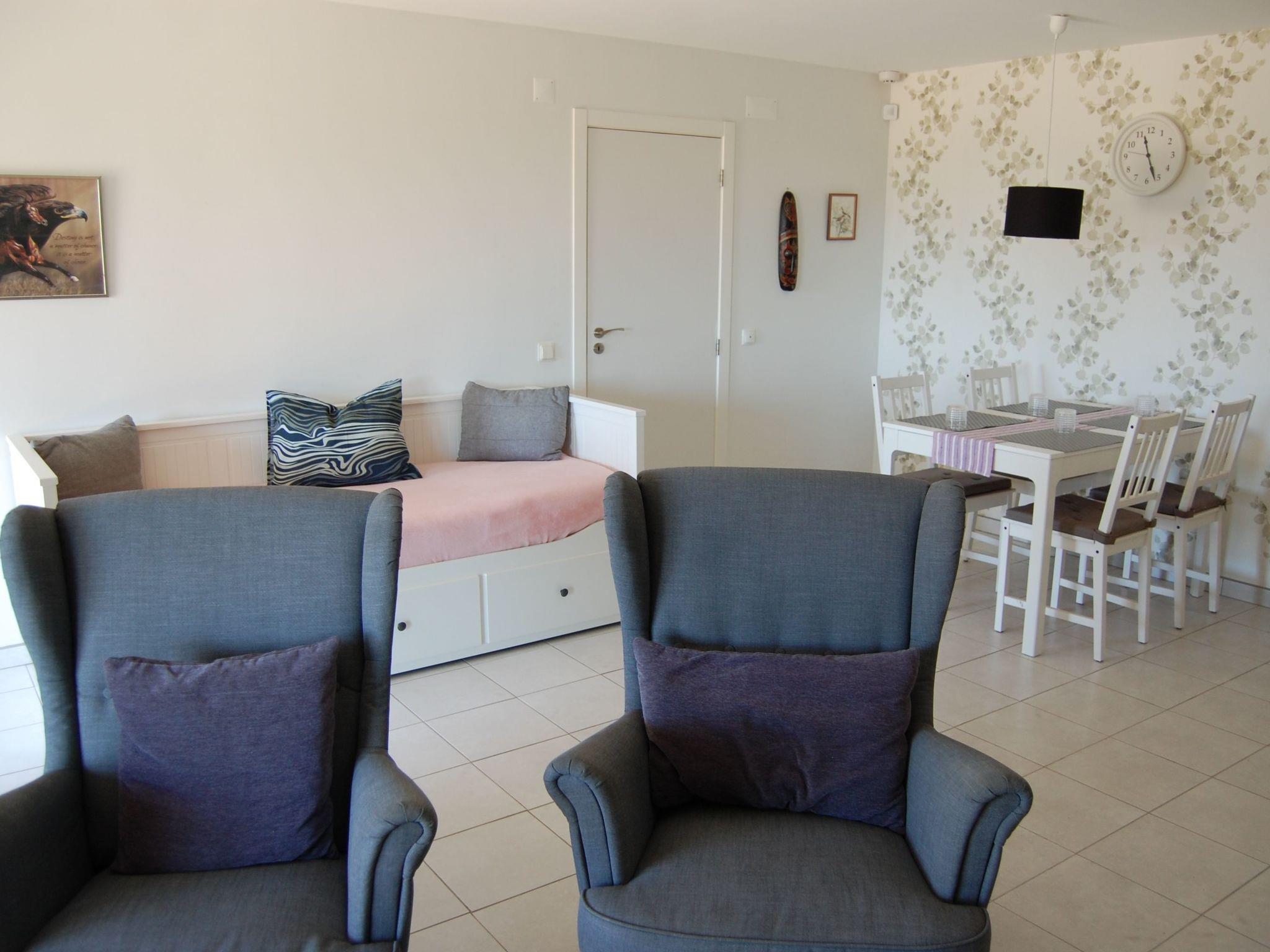 I am also pleased to inform you that there is another flat on the property. This is 50 m² in size and is furnished as an additional holiday flat for four people. I think this is a great option for a happy couple with two lovely children. The flat has a cosy bedroom with a comfortable double bed and a desk and chair, which is ideal for a home office. The lovingly designed eat-in kitchen is furnished with two comfortable armchairs and a cosy sofa bed for two people. A flat-screen TV with international programmes provides entertainment, while a dining table for four people allows for sociable get-togethers. The kitchen is also well equipped with a fridge, ceramic hob, oven and microwave to make your stay as comfortable as possible. The bathroom is equipped with a washbasin, WC and shower to make you feel at home. A large, shaded and covered terrace awaits you in front of the flat, inviting you to linger and offering a wonderful view of the sea. The flat is perfect for two families who want to spend a relaxing holiday together without sacrificing their privacy. The main house can accommodate up to six people, while the flat can accommodate up to four people. To make you feel at home, we ask you to open the flat by prior arrangement.