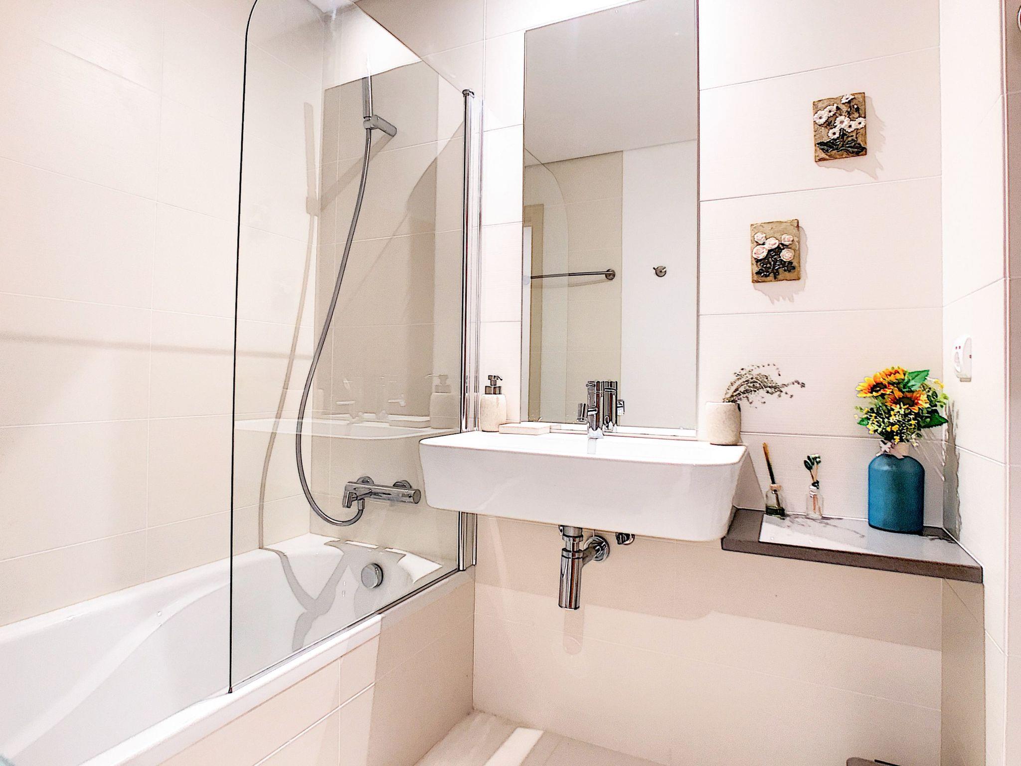 It has a lovely relaxed and comfortable décor. Two of the bedrooms are queen size beds and one has two single beds. It includes mattresses, bed linen, blankets, pillows and towels. It has two bathrooms, one full and one with a shower, both have a bidet. All bedrooms share a large terrace balcony and while the living room has it´s own separate balcony. The kitchen is well equipped and modern with all necessary kitchenware: fridge with freezer, oven, microwave, dishwasher, coffee maker, electric kettle, juicer. In the laundry room it has a washing machine, wall-mounted clothes dryers and portable dryer, iron, ironing board and a hair dryer. On the terrace there are two loungers, a comfortable rocking chair, a small coffee table with two chairs.