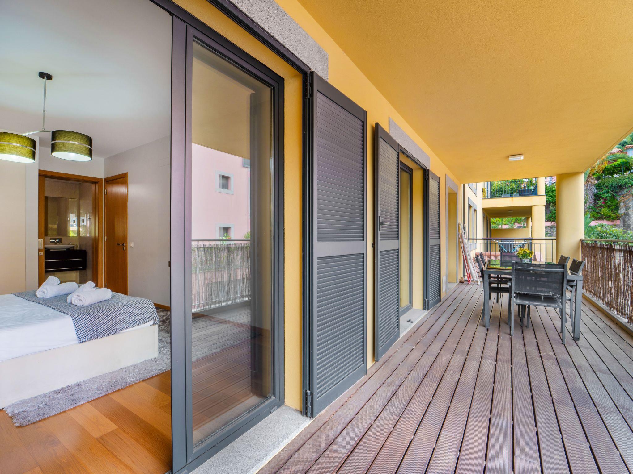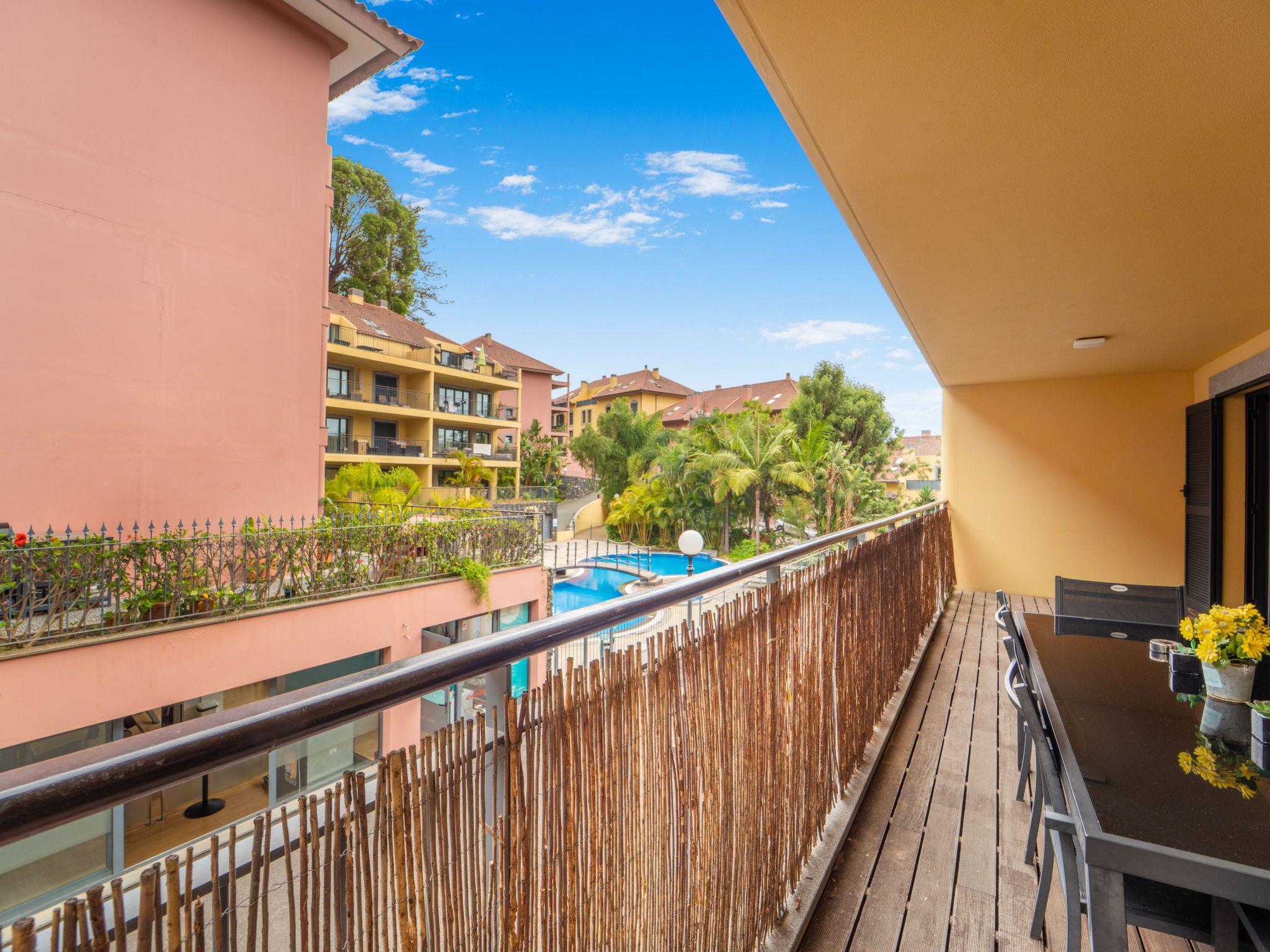 Step outside to the private balcony or wander into the communal garden to immerse yourself in Madeira's serene beauty. The outdoor pool area, shared with other residents, provides a perfect oasis for relaxation under the sun or a refreshing dip. The meticulously maintained garden and poolside loungers invite you to unwind and soak up the peaceful atmosphere.