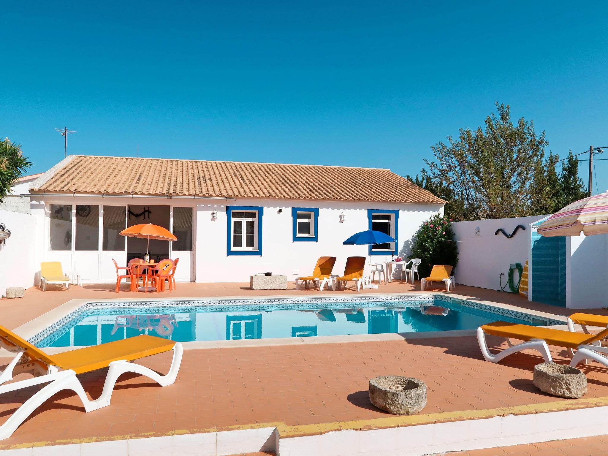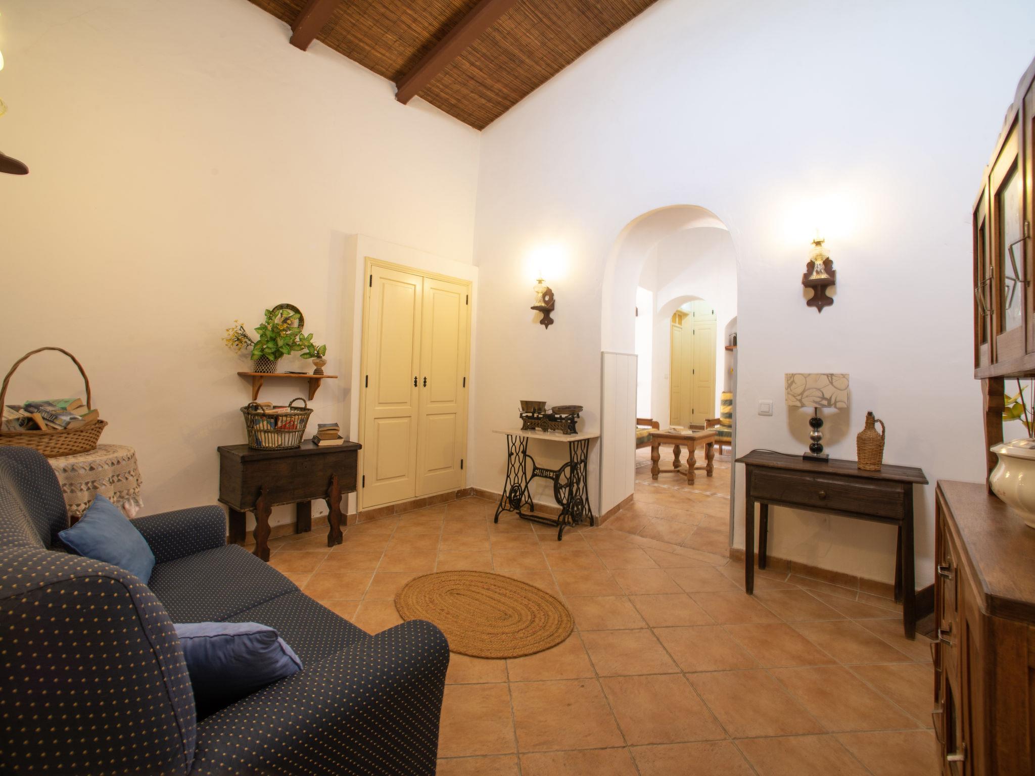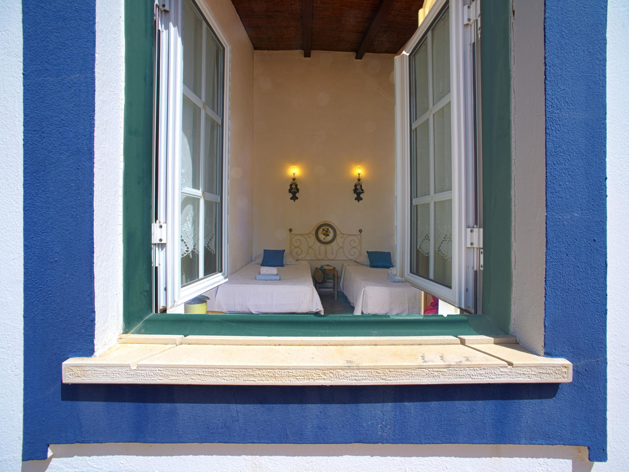 "Monte da Calma", 7-room house 130 m2. Rustic and cosy furnishings: living/dining room with dining table, cable TV, radio and CD-player. Exit to the garden. Open office. 1 room with 1 french bed (160 cm, length 200 cm), shower/WC and electric heater. 1 room with 1 french bed (160 cm, length 200 cm), electric heater. 2 rooms, each room with 2 beds (100 cm, length 200 cm), electric heater. Kitchen-/living room (oven, dishwasher, 4 gas rings, toaster, kettle, microwave, freezer, electric coffee machine) with dining table. Exit to the terrace. 2 baths/WC, shower/WC, sep. WC. Heating not available in all rooms. Terrace. Terrace furniture, barbecue, deck chairs (8). Facilities: washing machine, safe, iron, children's high chair, baby cot, hair dryer. Internet (WiFi, free). Please note: non-smokers only. Fire extinguisher. 141877/AL