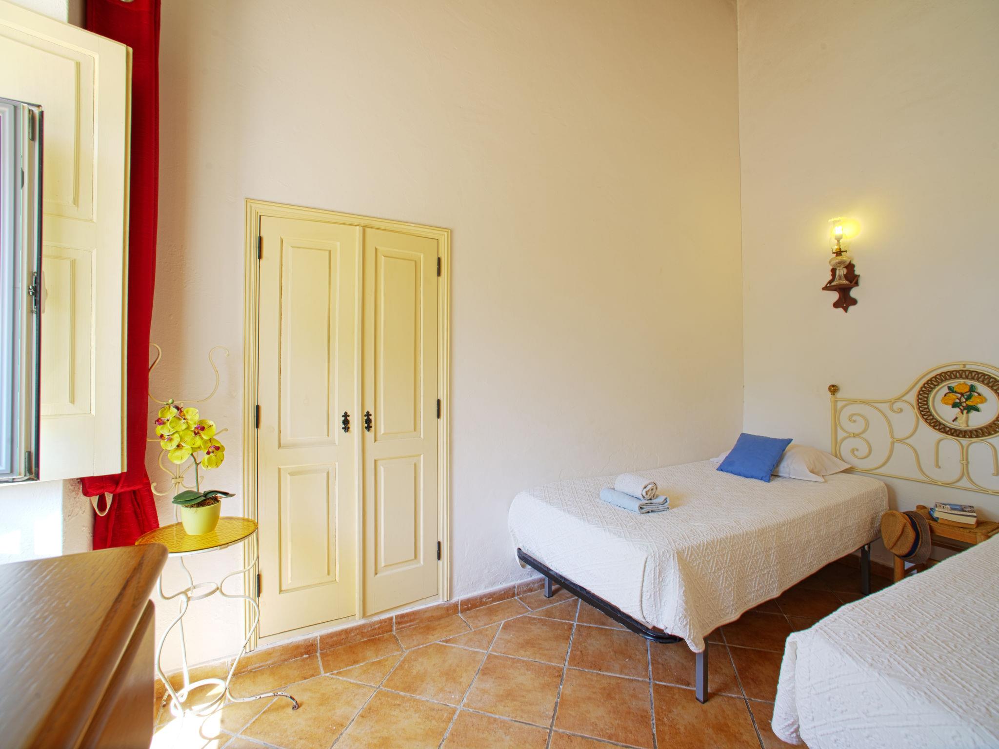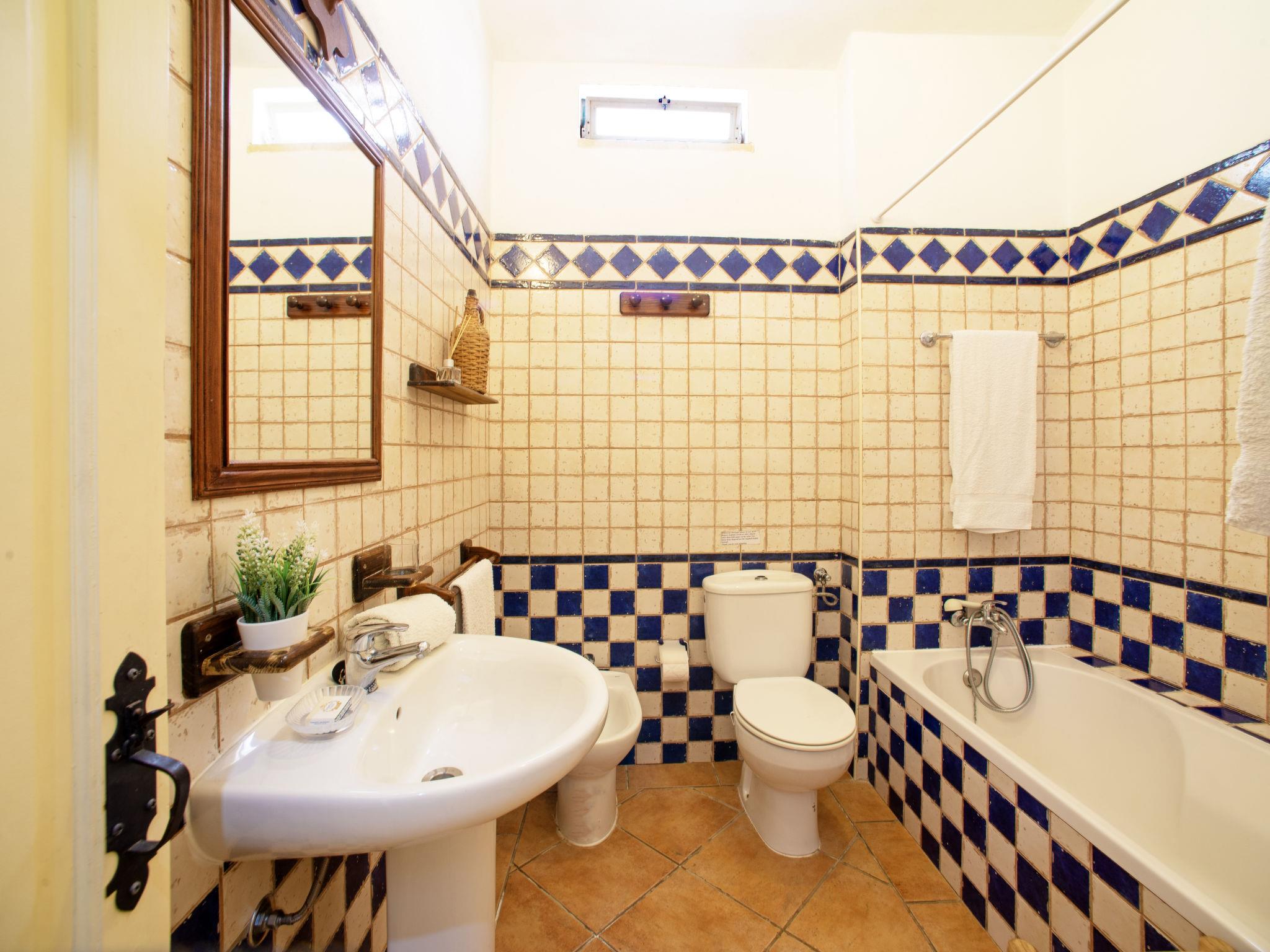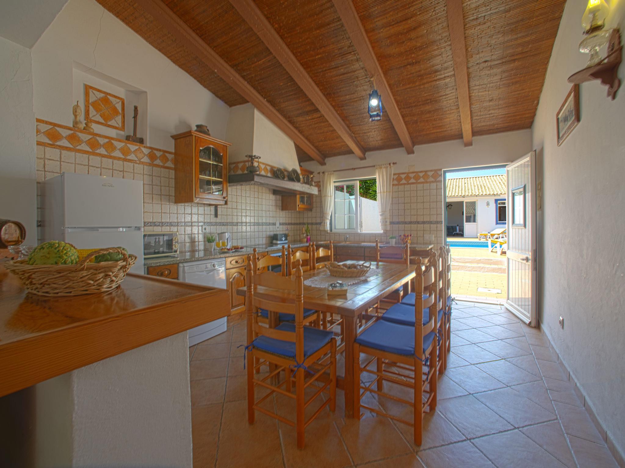 "Monte da Calma", 7-room house 130 m2. Rustic and cosy furnishings: living/dining room with dining table, cable TV, radio and CD-player. Exit to the garden. Open office. 1 room with 1 french bed (160 cm, length 200 cm), shower/WC and electric heater. 1 room with 1 french bed (160 cm, length 200 cm), electric heater. 2 rooms, each room with 2 beds (100 cm, length 200 cm), electric heater. Kitchen-/living room (oven, dishwasher, 4 gas rings, toaster, kettle, microwave, freezer, electric coffee machine) with dining table. Exit to the terrace. 2 baths/WC, shower/WC, sep. WC. Heating not available in all rooms. Terrace. Terrace furniture, barbecue, deck chairs (8). Facilities: washing machine, safe, iron, children's high chair, baby cot, hair dryer. Internet (WiFi, free). Please note: non-smokers only. Fire extinguisher. 141877/AL