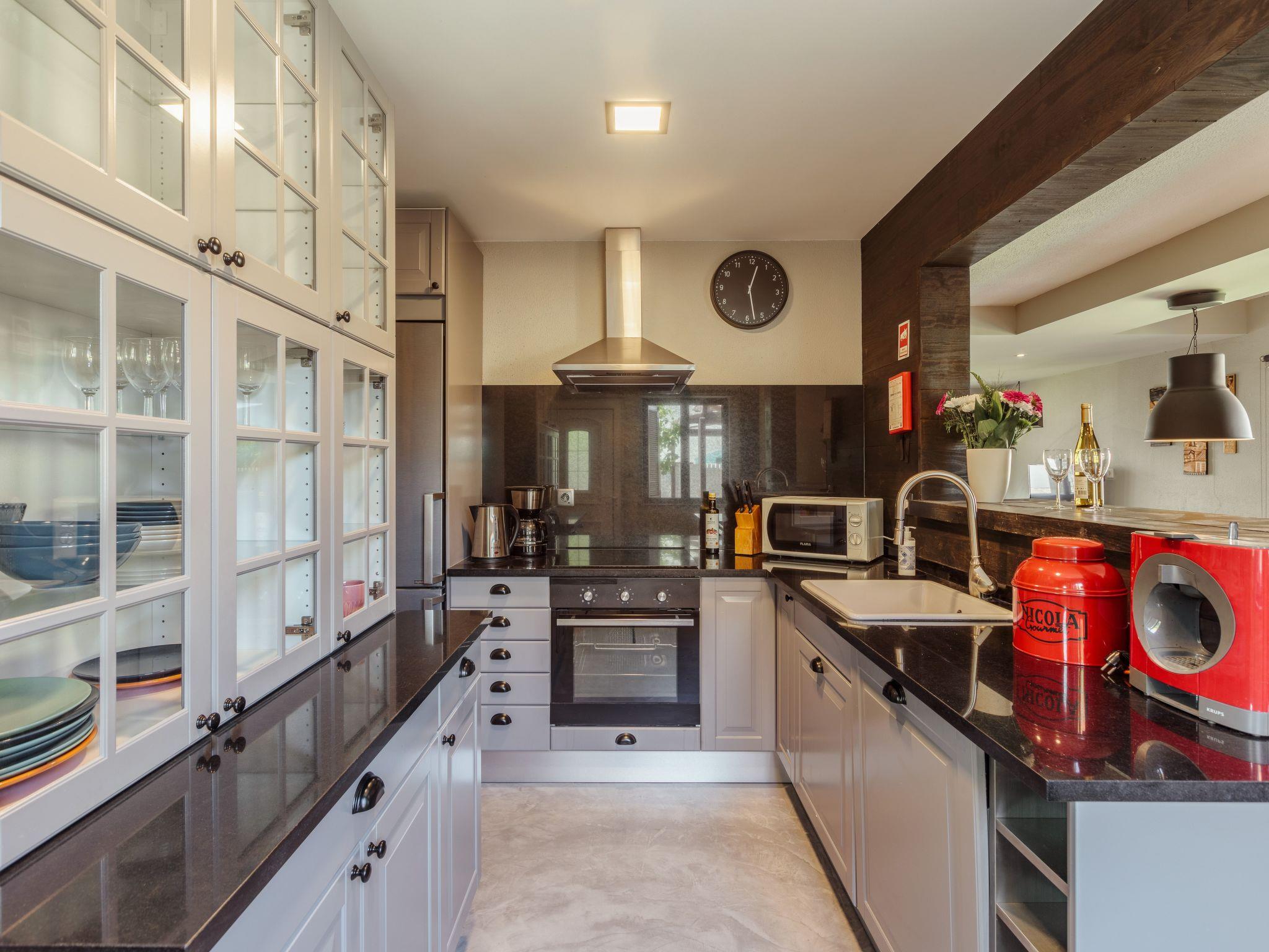The completely renovated kitchen area is equipped with a 4-ring ceramic hob, oven, microwave, toaster, fridge-freezer and dishwasher. The washing machine is located outside on the terrace.