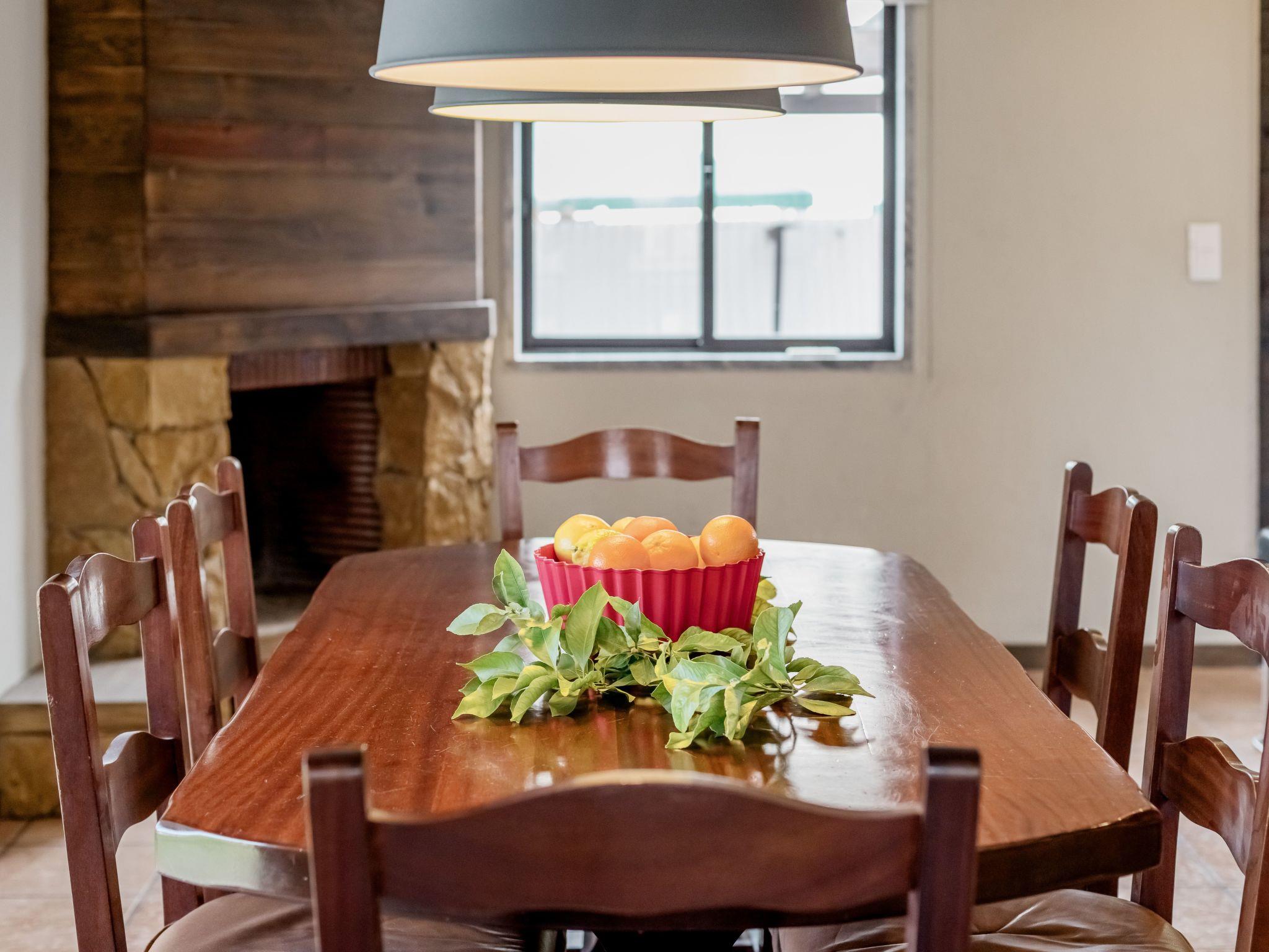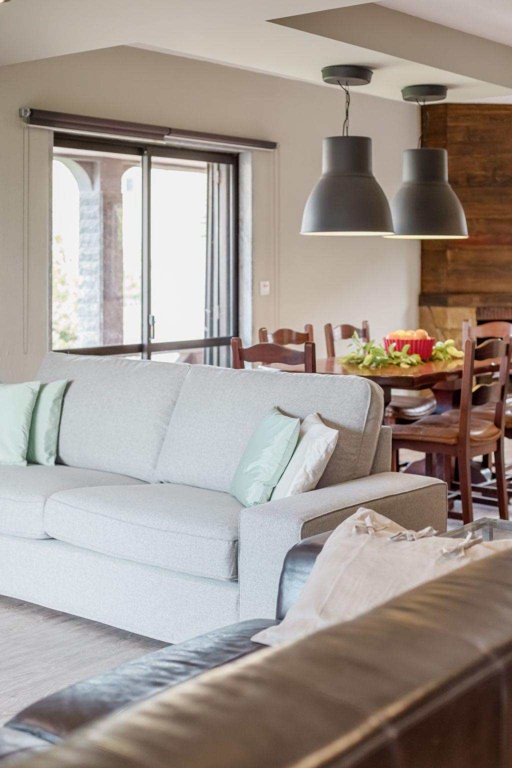 The living room is divided into 3 areas. A sofa area with 2 sofas and the flat screen TV, the dining area and the open-plan kitchen area. There is an open fireplace in the corner next to the dining table.