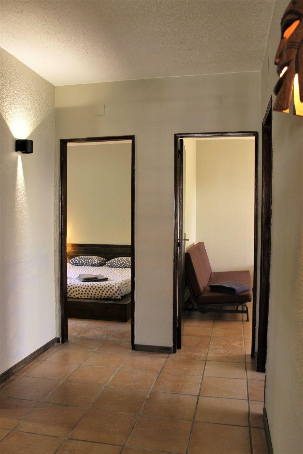 The holiday home has 5 bedrooms and 3 bathrooms. 3 bedrooms are located on the ground floor, 1 with a double bed, air conditioning and en-suite bathroom (shower), 1 with a double bed and direct access to the garden and 1 with two single beds and also direct access to the garden. There is a second bathroom (shower) in the corridor in front of the bedrooms.