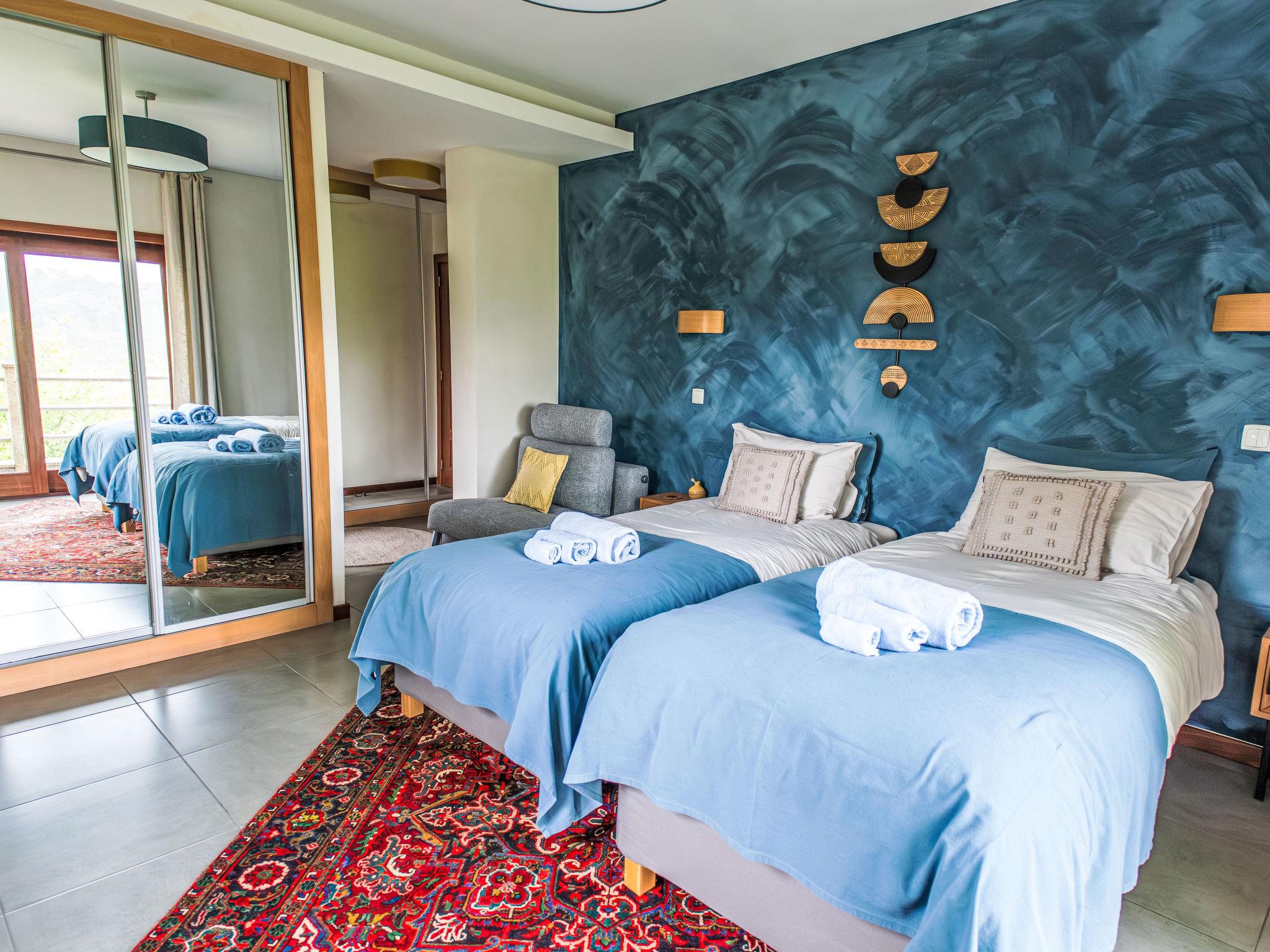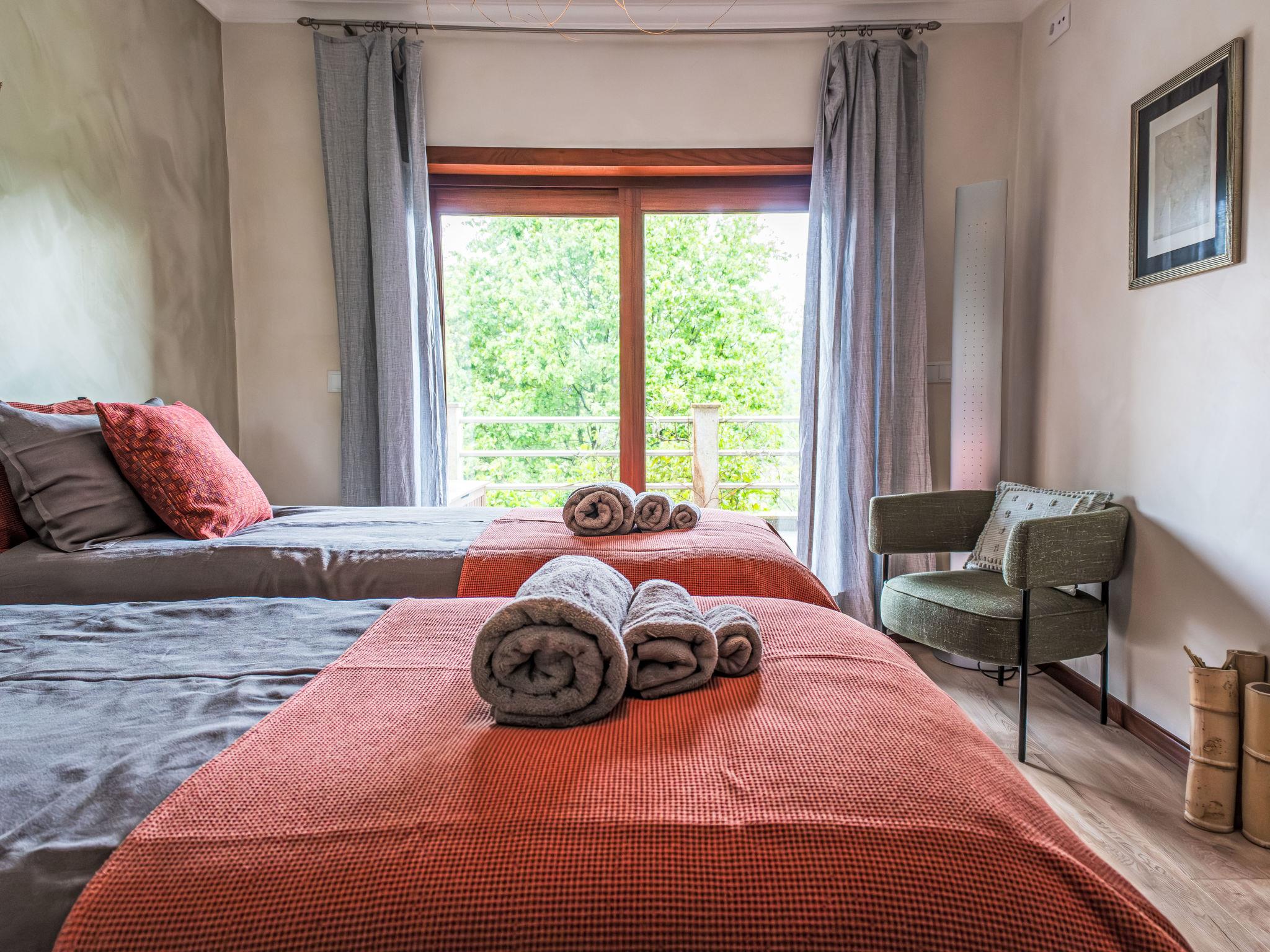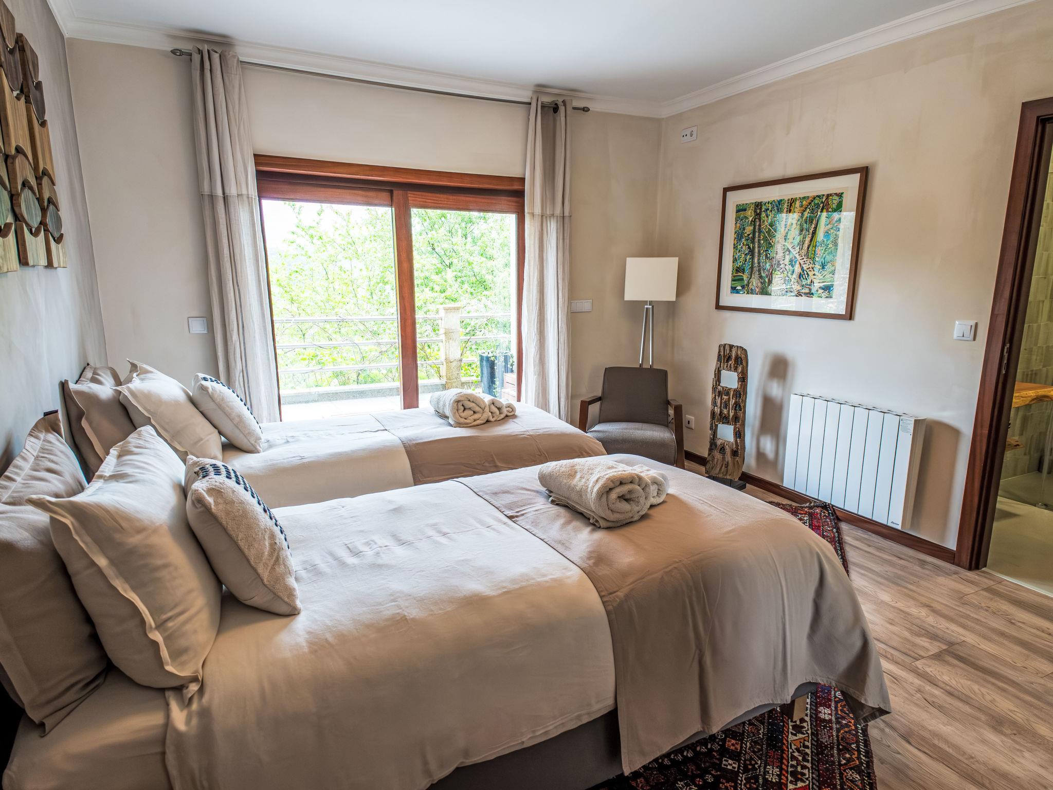 Very cosy, comfortable villa "Rio Lima Retreat", 2 storeys, detached, built in 2011, surrounded by trees and fields. Outside the resort, 6.6 km from the centre of Ponte de Lima, in a quiet position residential area (villas), 200 m from the river. Private: swimming pool angular (3 x 9 m, depth 80 - 150 cm, seasonal availability: 01.Apr. - 31.Oct.). Arbour, garden furniture. In the house: WiFi, washing machine. Parking at the house. Grocery 700 m, supermarket 5.6 km, shopping centre 9.5 km, restaurant, bakery 700 m, café 750 m, bicycle rental 6.2 km, bus stop 6.9 km, sandy beach "Praia fluvial Ponte de Lima" 8.9 km. Surf school 33.7 km, riding stable 8.1 km, children's playground 8.2 km. Nearby attractions: Braga Se cathedral 45 km, Golf Ponte de Lima 13 km, Castelo da Nóbrega, Ponte da Barca 22.9 km, Cascatas 12.9 km, Vigo Airport 65 km, Ponte da Barca, R. Rio Lima 11.6 km. Please note: car recommended. Suitable for families. Loading and unloading of baggage is possible at the holiday house. The owners offer additional services on demand like chef/catering service, yoga classes, massages, kayak/cycling, hiking excursions/tours.