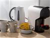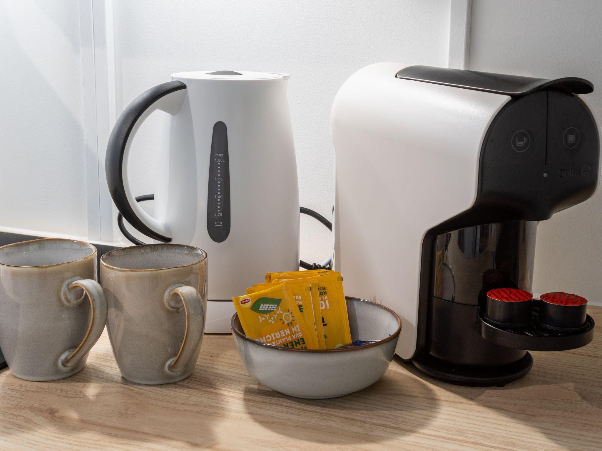 The spacious kitchen has essential appliances, including a stove, a fridge, a water kettle, a coffee machine, etc.