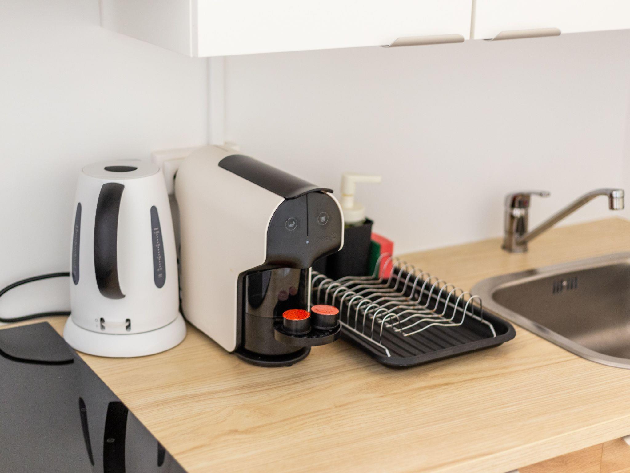 The spacious kitchen has essential appliances, including a stove, a fridge, a water kettle, a coffee machine, etc.