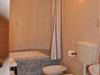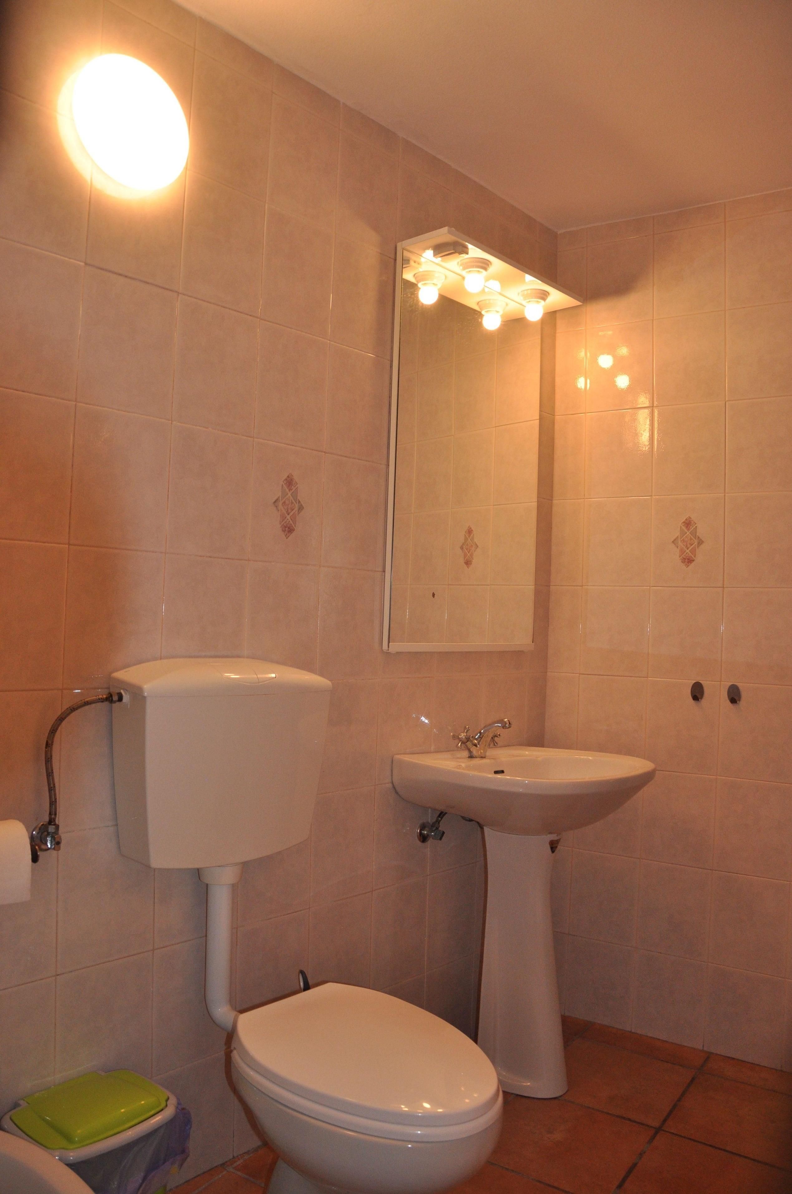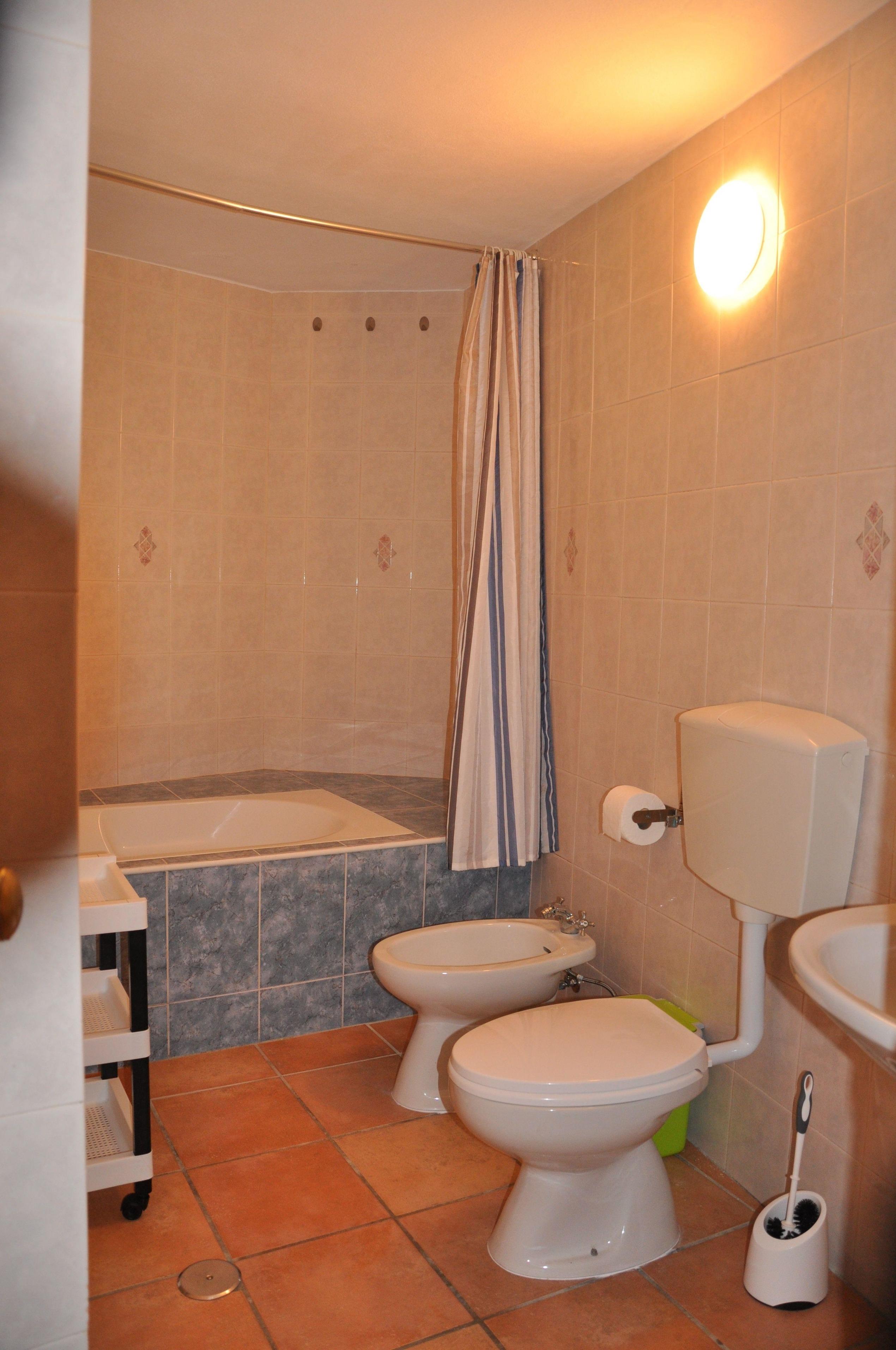 Badezimmer mit Waschbecken, Toilette und Dusche. Wäscheständer vorhanden