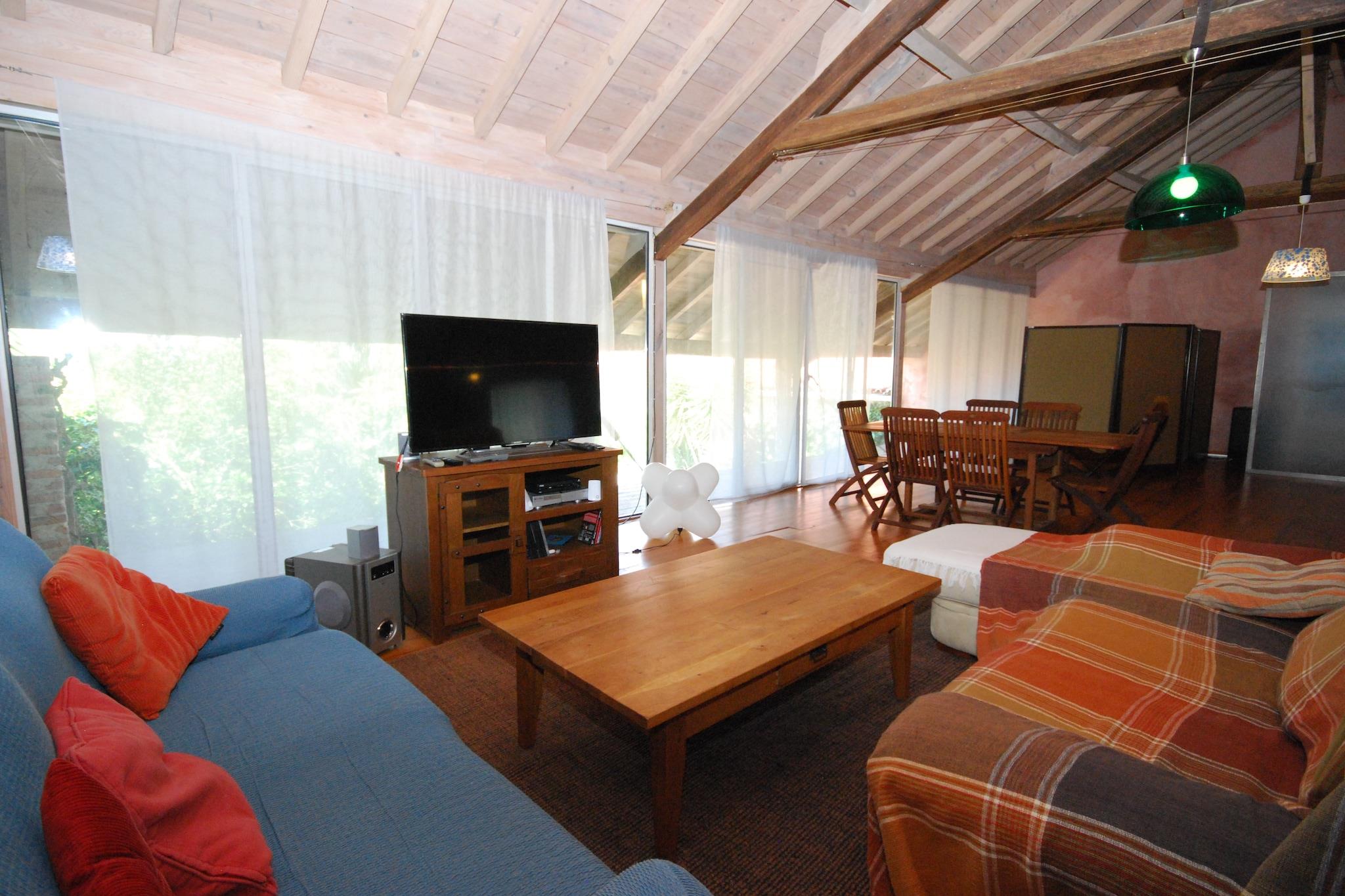 Stueetage: (Stue(dobbeltsovesofa, pejs), åbent køkken(spisebord, elkedel, brødrister, komfur(Komfur med fire kogeplader, gas), kaffemaskine(kaffetragt), ovn, mikrobølgeovn, køle-fryseskab), Soveværelse med badeværelse(dobbeltseng(130 x 180 cm), bruser, håndvask, toilet)) På 1. etage: (Stue(Fjernsyn(fladskærm), spisebord, sofahjørne, DVD-afspiller), soveværelse med gennemgang(3x dobbeltseng(135 x 180 cm, 140 x 180 cm, 140 x 190 cm)), badeværelse(bruser, håndvask, toilet)) bruser(udendørs), vaskemaskine, varme, terrasse(overdækket), have, havemøbler, grill, swimmingpool(privat, 8 x 4 m., opened from May upto and including Oct), bordtennisbord, fitnessapparater, barneseng, barnestol