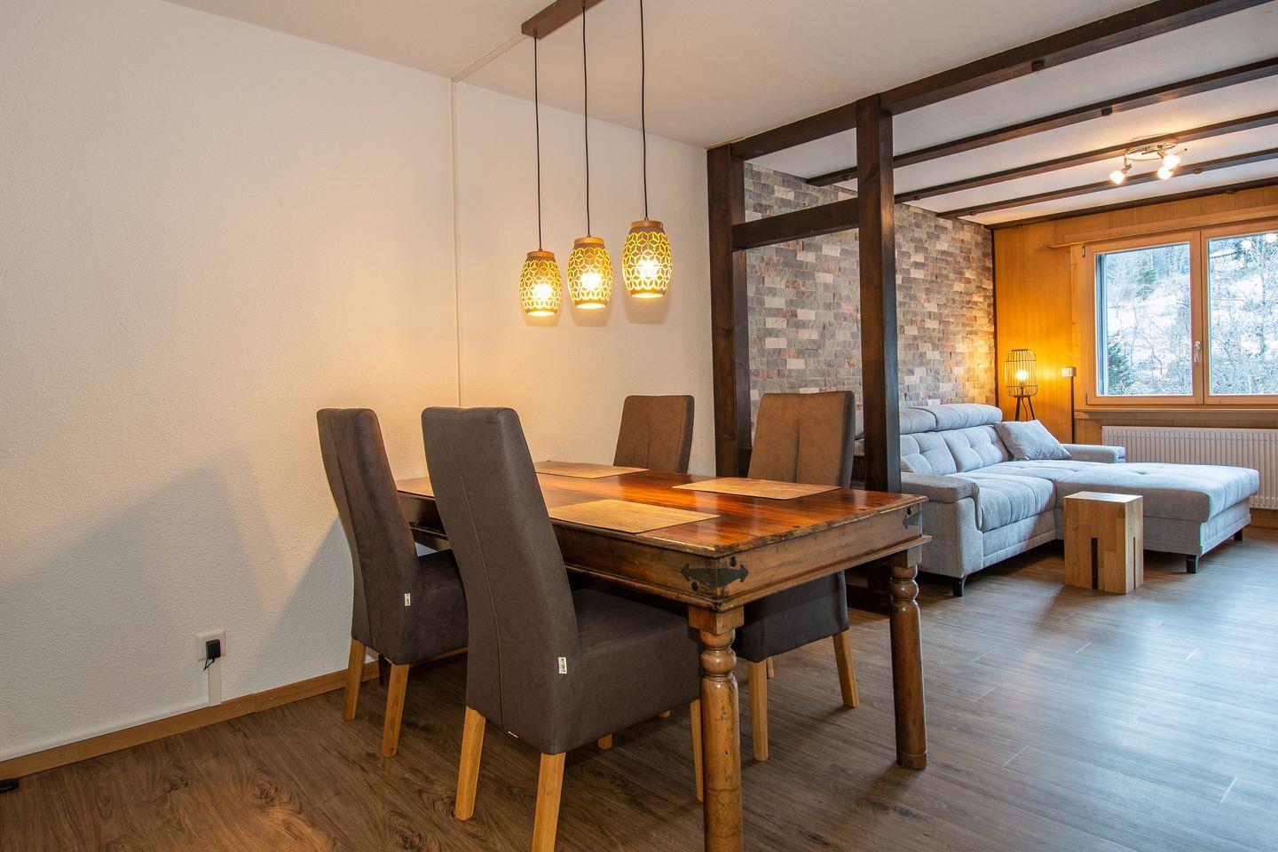 Die Bushaltestelle direkt vor dem Haus ermöglicht eine unkomplizierte Anbindung an die umliegenden Skigebiete und Wanderwege. Ein Parkplatz gehört ebenfalls zur Wohnung. Nichtraucher Wohnung / Haustiere erlaubt CHF 100.00