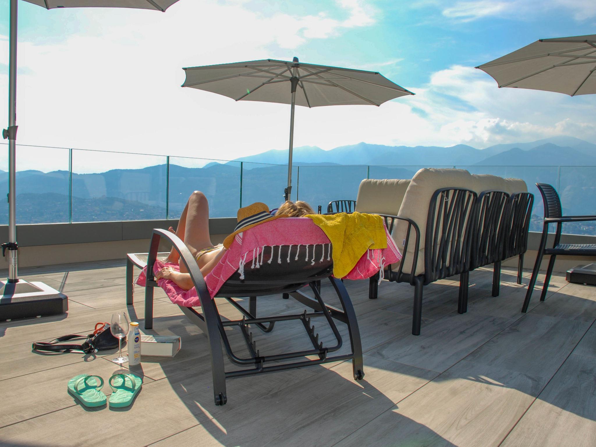 "Residenza Monte Brè - Apt. 203 Haus2", 1-room apartment 28 m2 on 2nd floor, south-west facing position. Fully renovated in 2025, comfortable and modern furnishings: open living/sleeping room with 1 sofabed (140 cm, length 200 cm), 1 double bed (160 cm, length 200 cm). Open kitchen in the entrance (oven, dishwasher, 4 induction hot plates, toaster, kettle, microwave, electric coffee machine, Capsules for coffee machine (Nespresso) extra). Shower/WC. Heating. Small balcony 4 m2, south-west facing position. Balcony furniture. Marvellous panoramic view of the lake, the mountains, the countryside and the city. Facilities: children's high chair, baby cot for up to 2 year olds (extra), hair dryer. Internet (WiFi, free, Bandwidth: 1'000 Mbit/s). Parking (extra) at the house. Please note: non-smokers only. NL-00012843