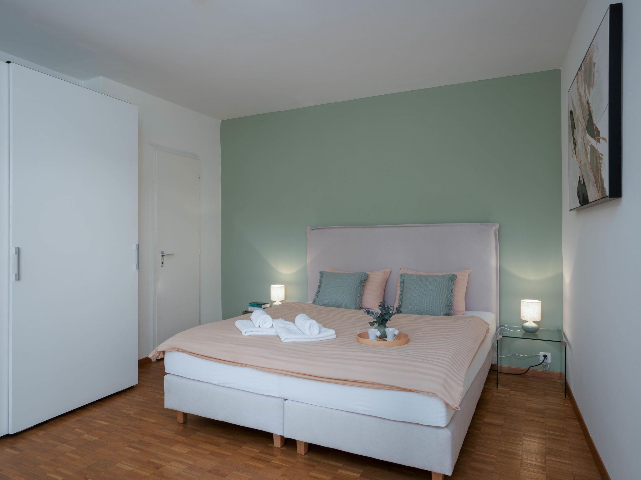 "Suite Modern", 2-room apartment 60 m2 on 1st floor, west facing position. Renovated: living/dining room with 1 double sofabed (1 x 160 cm, length 200 cm), TV and radio. 1 room with 1 double bed (1 x 180 cm, length 200 cm). Open kitchen (oven, electric coffee machine, Capsules for coffee machine (Nespresso) extra). Bath/WC. Oil heating. 2 balconies, west facing position. Partial view of the lake, the mountains and the resort. Facilities: Internet (WiFi, free). Please note: non-smoking house. Maximum 1 pet/ dog allowed. NL-00004951
