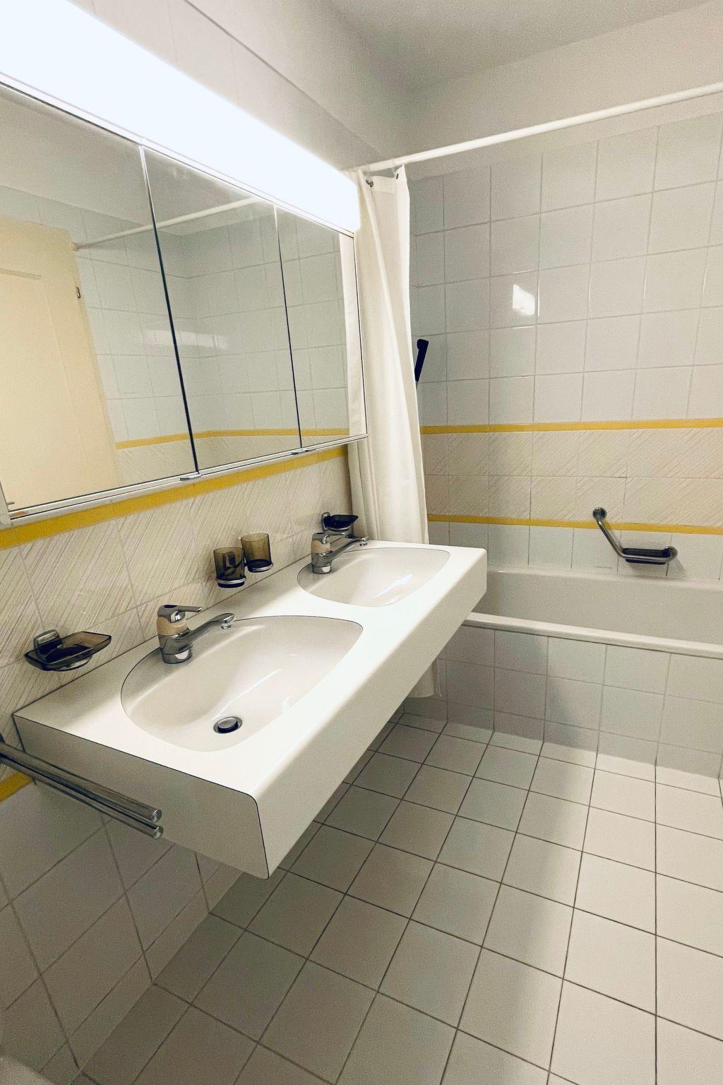 The interior of the south-facing flat will spoil you with spacious hospitality and well thought-out furnishings: from the inviting entrance area with cloakroom to the spacious living room and the fully equipped kitchen - you will find everything your heart desires here. This includes a 220 litre fridge, a ceramic hob with visible oven, microwave oven, dishwasher and plenty of cupboards for your provisions. Two comfortable bedrooms, each with its own bathroom, WC with double washbasin or shower/WC with washbasin as well as washing machine and tumble dryer, round off the offer.