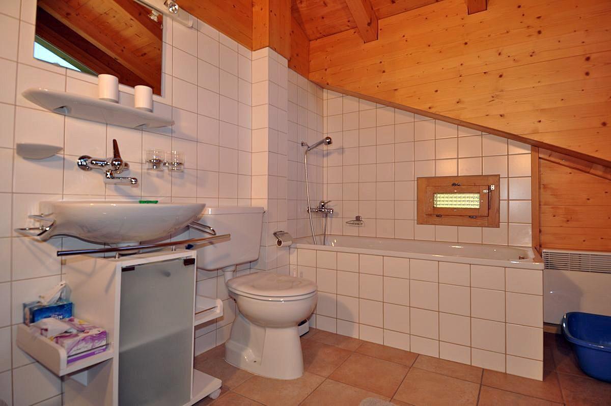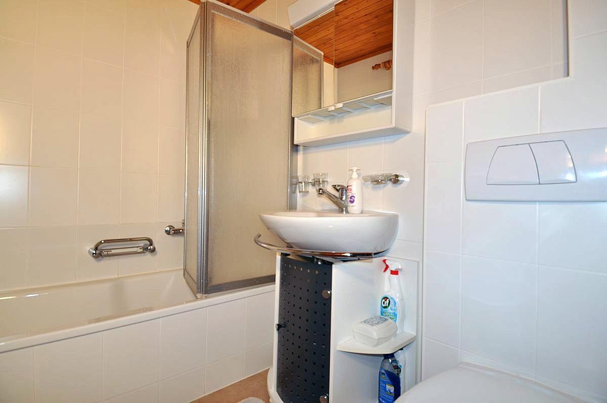 Badezimmer mit Badewanne, Dusche, Waschbecken und WC