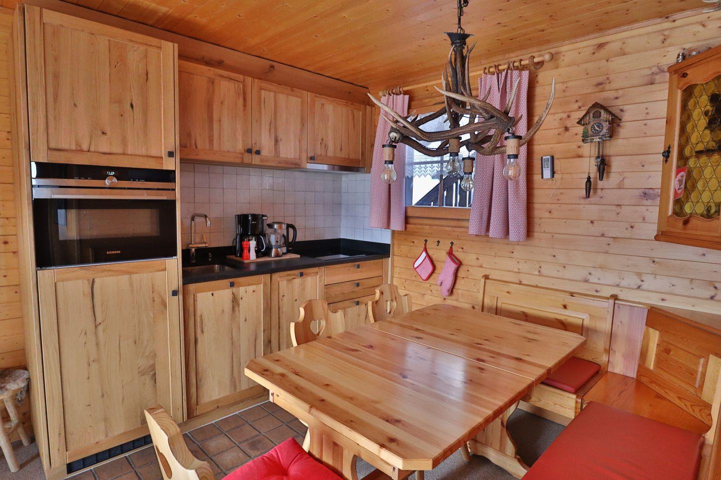 Das große Wohnzimmer verfügt über eine komplett renovierte Eichenküche (2018) mit modernen Geräten und einem traditionellen Specksteinofen sowie einer geräumigen, gemütlichen Sitzecke. Genießen Sie die Sonne auf dem Balkon im Süden und Westen.