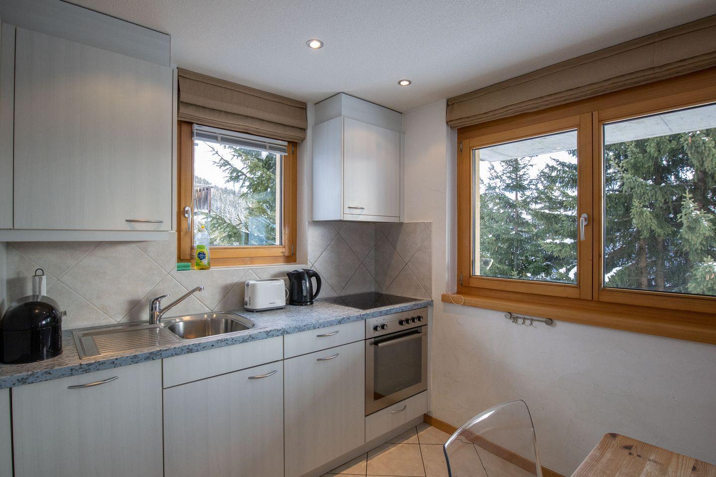 Der Zugang zum Chalet erfolgt über mehrere kurze Treppen, die sowohl hinauf als auch hinunter führen. Im Winter werden diese Treppen geräumt, können jedoch bei Neuschnee teilweise schneebedeckt sein. Die Lage des Chalets ist etwas abgelegen, was bedeutet, dass der Zugang möglicherweise mehr Aufmerksamkeit erfordert.