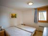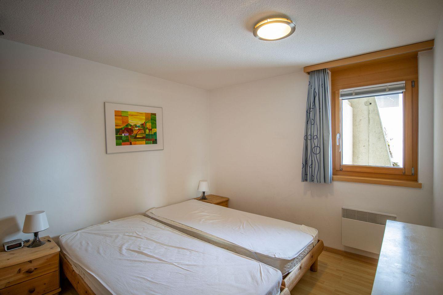 Wohnung mit Aussenzugang, Wohnzimmer mit offener Küche, 1 Schlafzimmer mit 2 Einzelbetten, 1 Schlafzimmer mit Doppelbett, 1 Schlafzimmer mit Etagenbett, Badezimmer mit Dusche / WC / Waschbecken, umgeben von 2 Terrassen, Garten und Liegewiese.