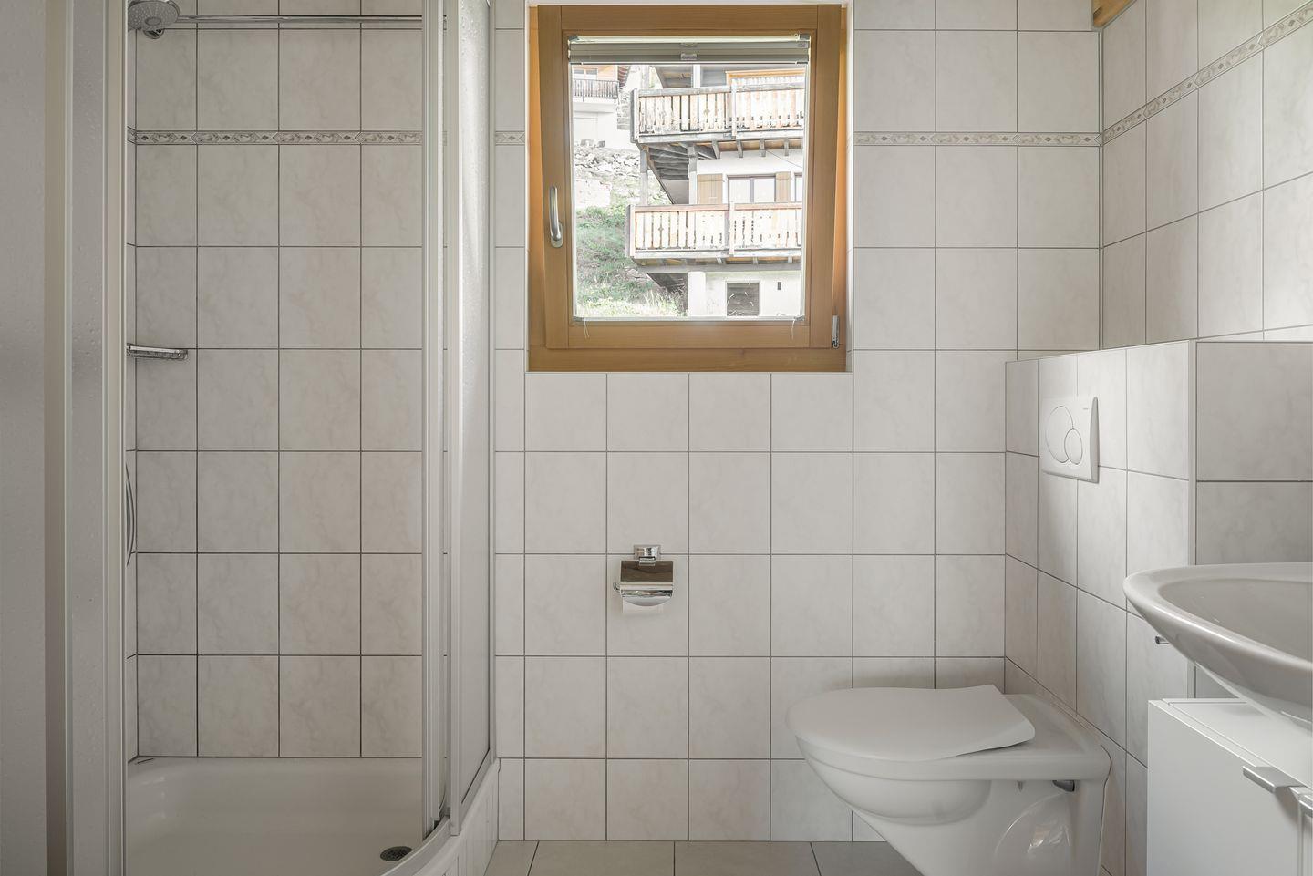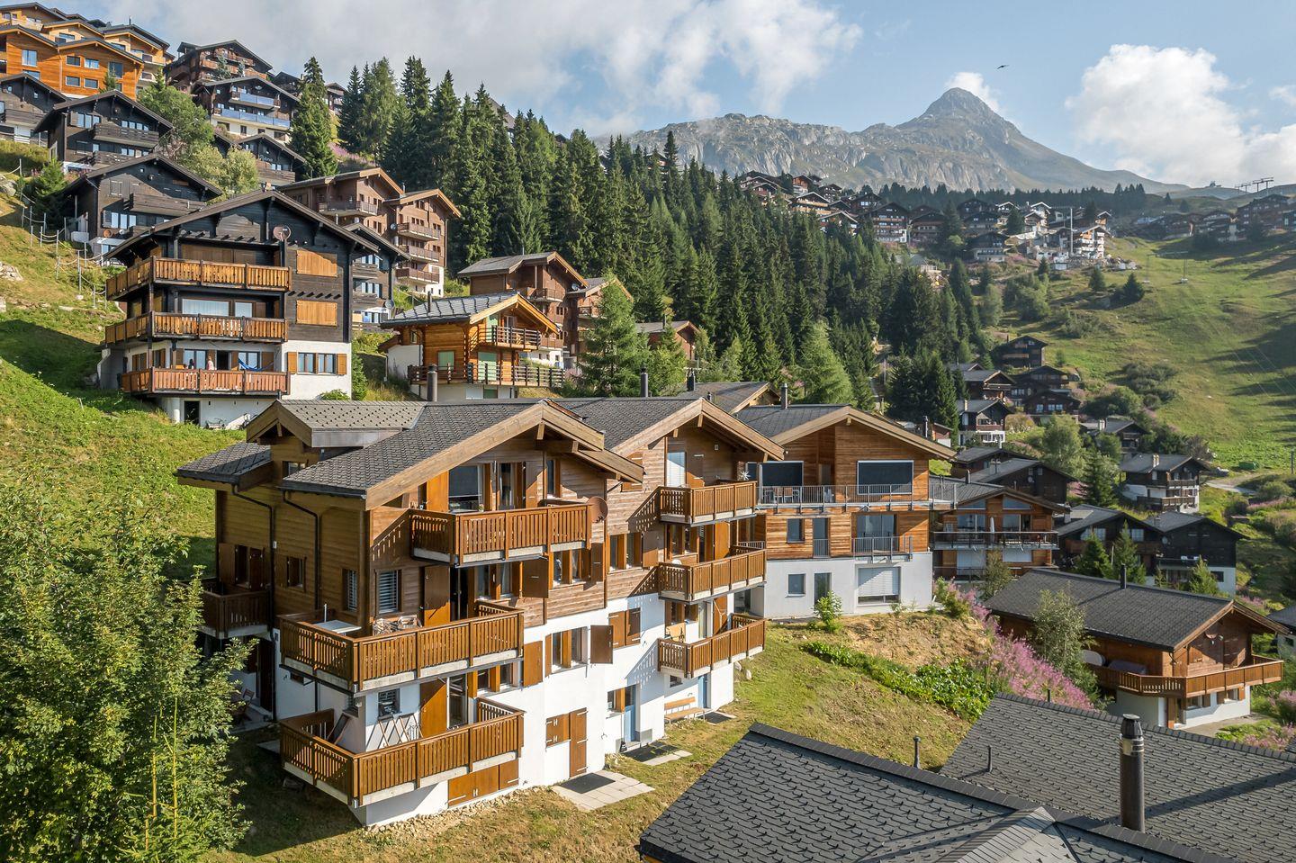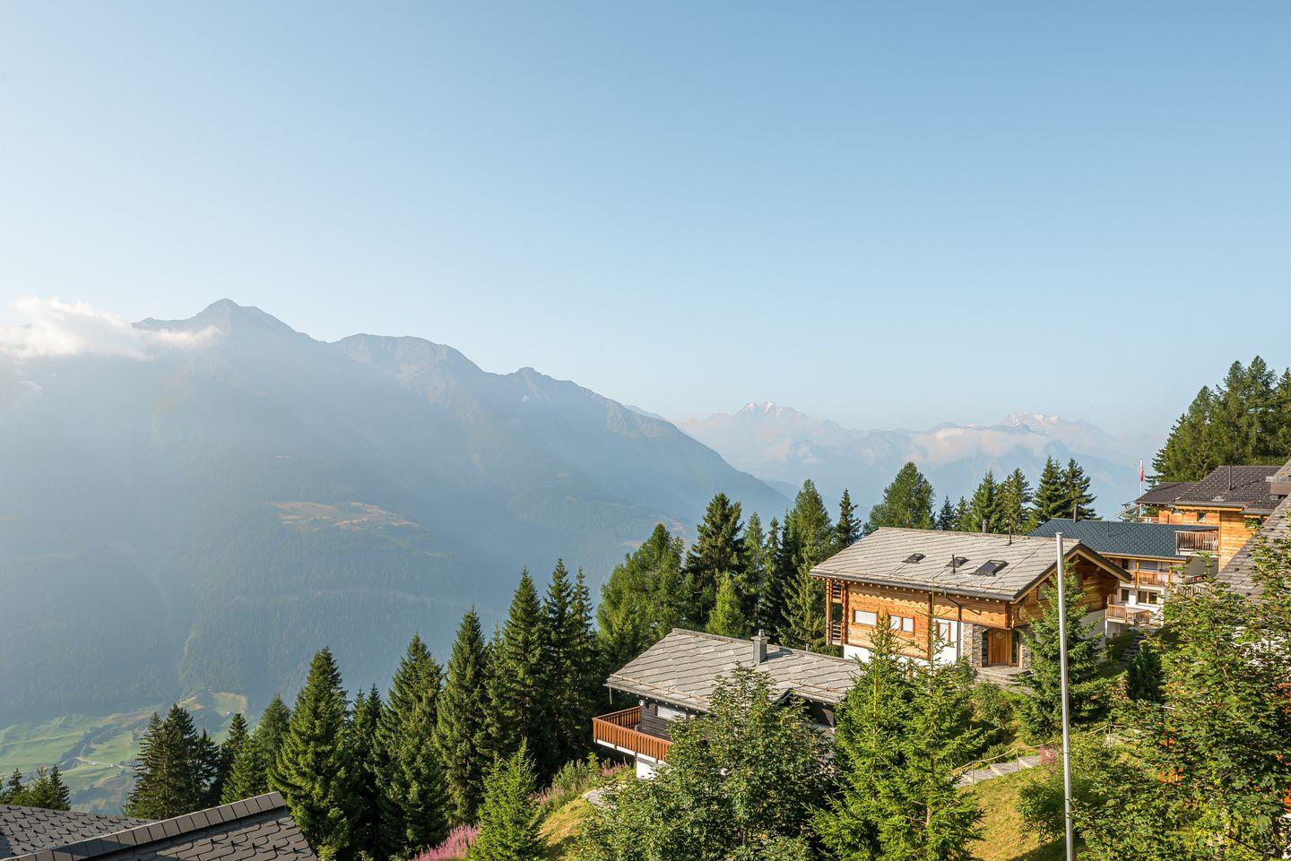 Das Haus ist nach Süden ausgerichtet und bietet einen freien Blick auf die gegenüberliegenden Gomser Berge bis hin zu den beeindruckenden Walliser Alpen (Mischabel-Gruppe mit dem Dom, 4.545 m). Die Wohnung umfasst 3,5 Zimmer und verfügt über sowohl einen Süd- als auch einen Nordbalkon.