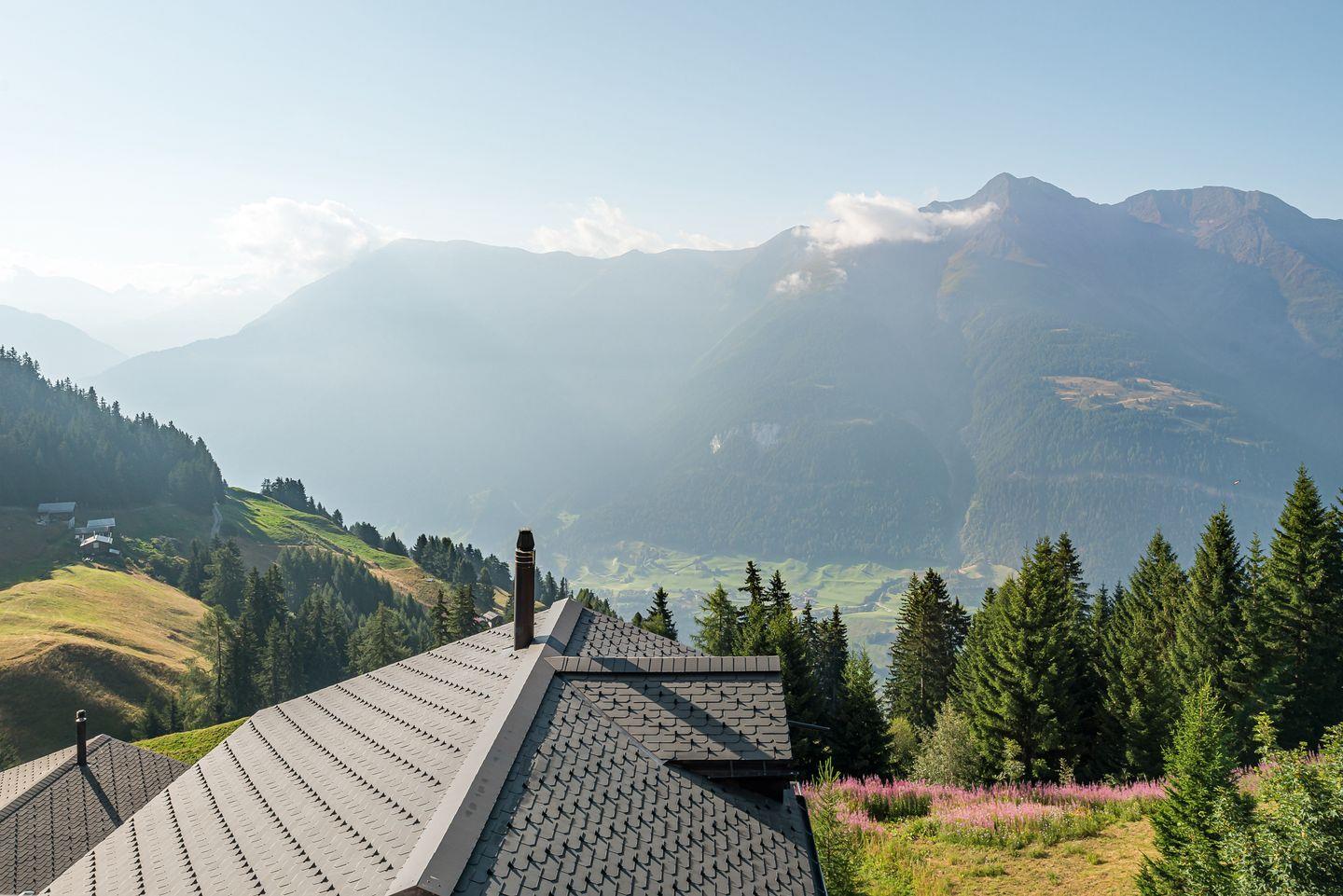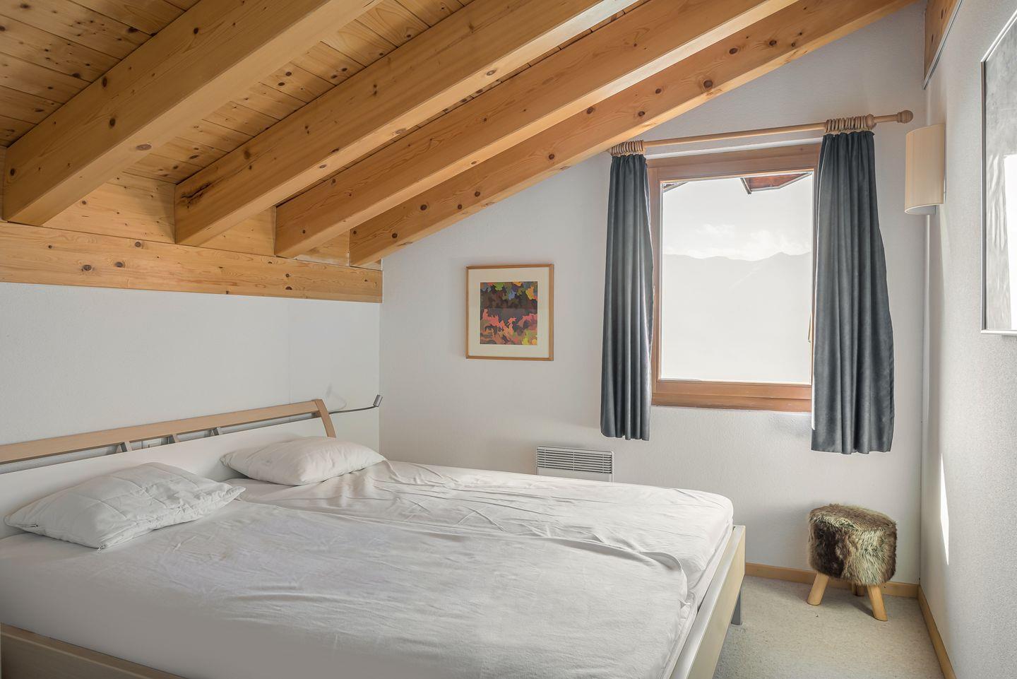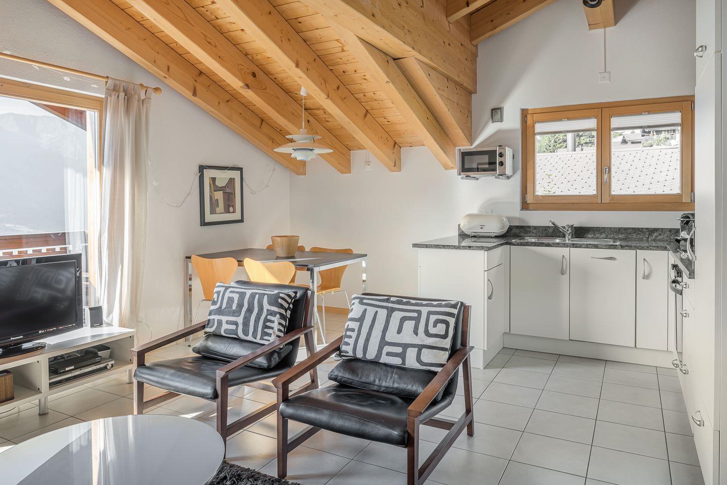 Das Haus ist nach Süden ausgerichtet und bietet einen freien Blick auf die gegenüberliegenden Gomser Berge bis hin zu den beeindruckenden Walliser Alpen (Mischabel-Gruppe mit dem Dom, 4.545 m). Die Wohnung umfasst 3,5 Zimmer und verfügt über sowohl einen Süd- als auch einen Nordbalkon.