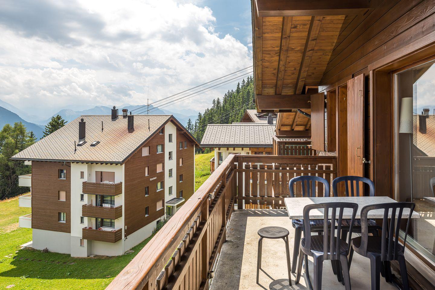 Das Haus, mit Abstellraum/Skiraum im UG, richtet sich mit den Balkonen nach dem ruhigen Süden aus, mit Aussicht auf die gegenüberliegenden Berge bis hin zu den Walliser Alpen.