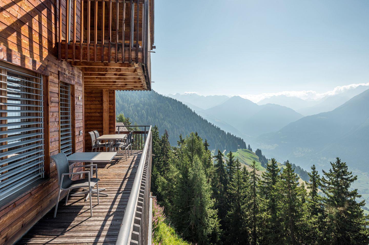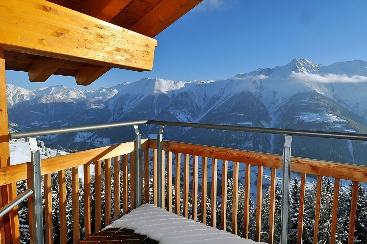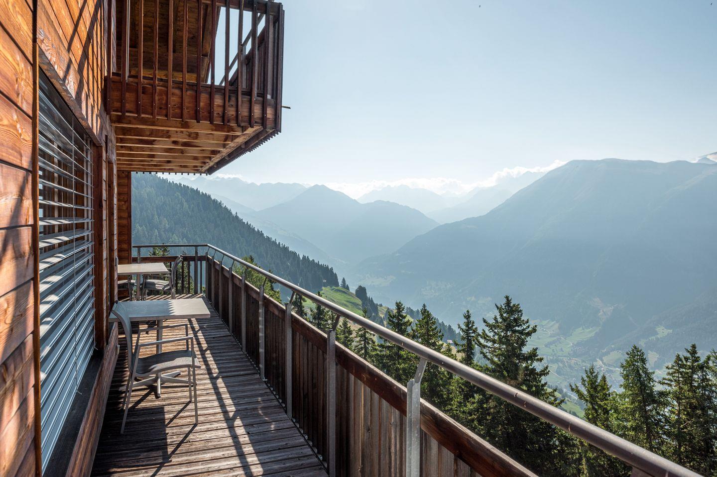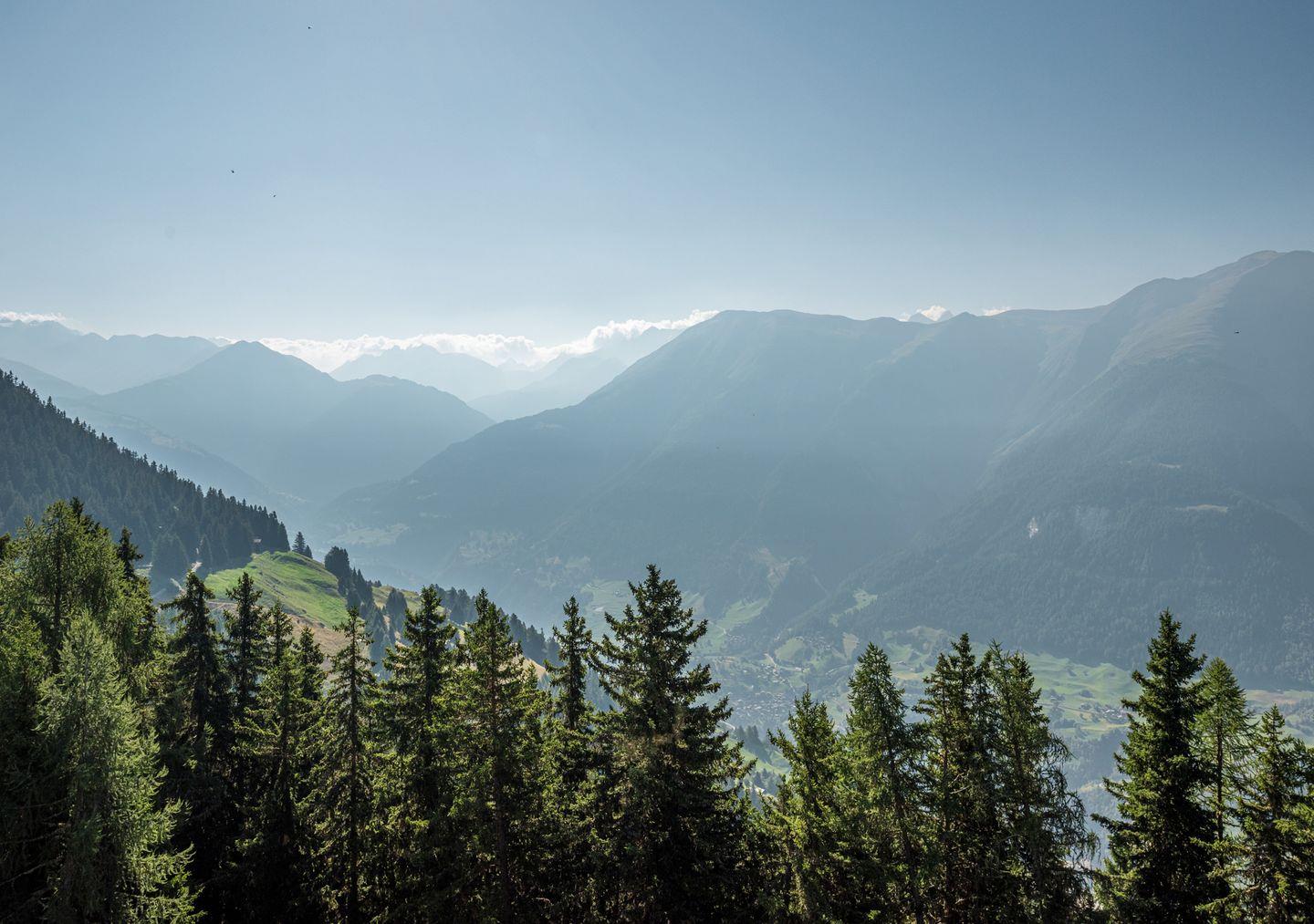 Geniessen Sie auf dem Sonnenplateau die herrliche Aussicht auf die Walliser Berge.