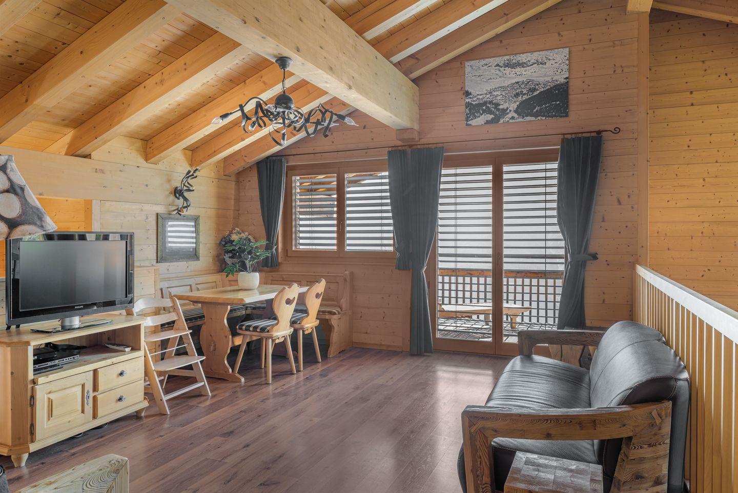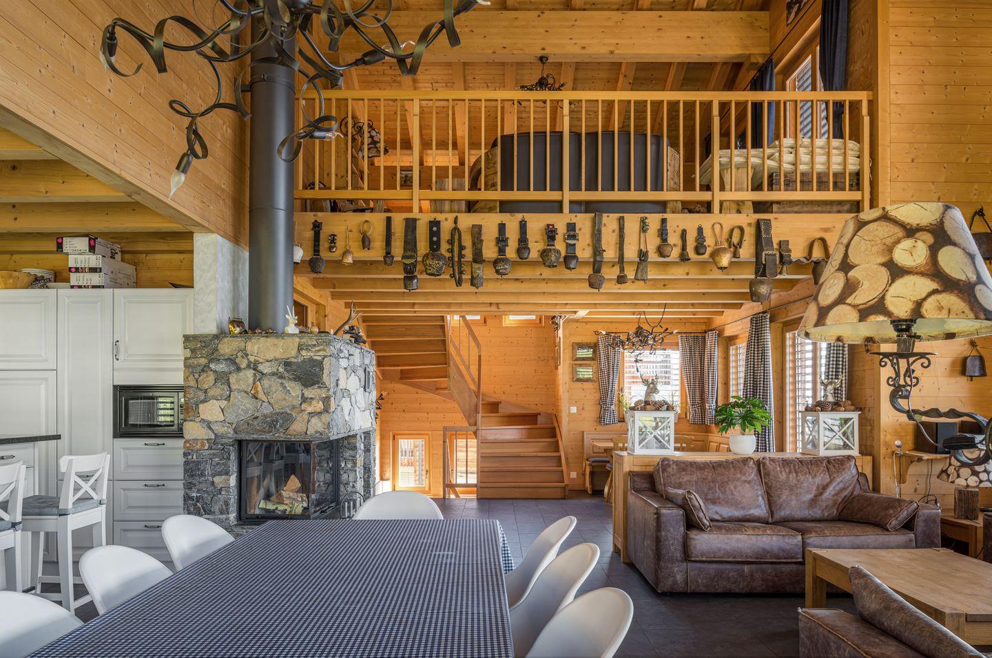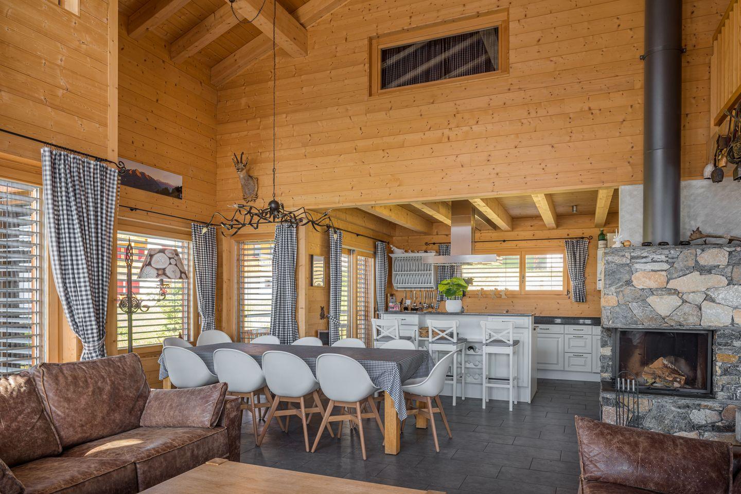 Auf großzügigen 300 m² erwartet Sie eine Wohlfühloase, in der bis zu 12 Personen den Alltag hinter sich lassen können. Nach einem langen Tag voller unvergesslicher Eindrücke aus dem Skigebiet oder von Wanderungen können Sie sich im geräumigen Wohnzimmer entspannen. Genießen Sie einen Roman, schauen Sie einen Film oder gönnen Sie sich ein Glas Wein in familiärer Atmosphäre, während das Knistern des Kaminfeuers im Hintergrund für Gemütlichkeit sorgt. Dank Internetverbindung haben Sie die Möglichkeit, Ihre Erlebnisse des Tages mit Freunden zu teilen.
