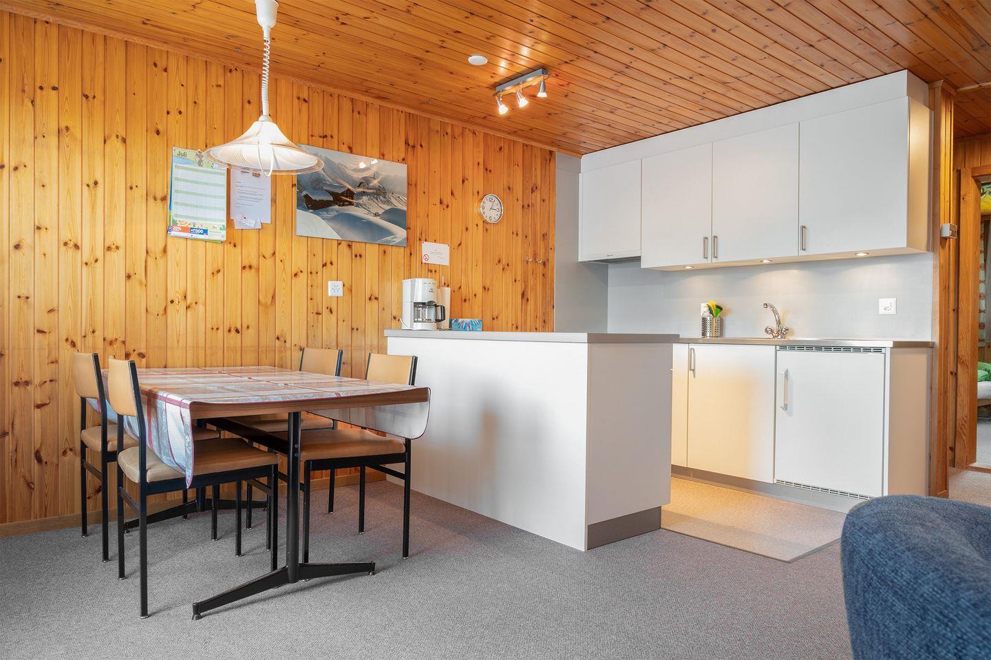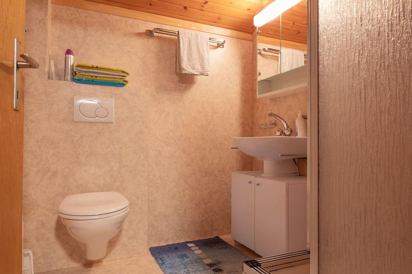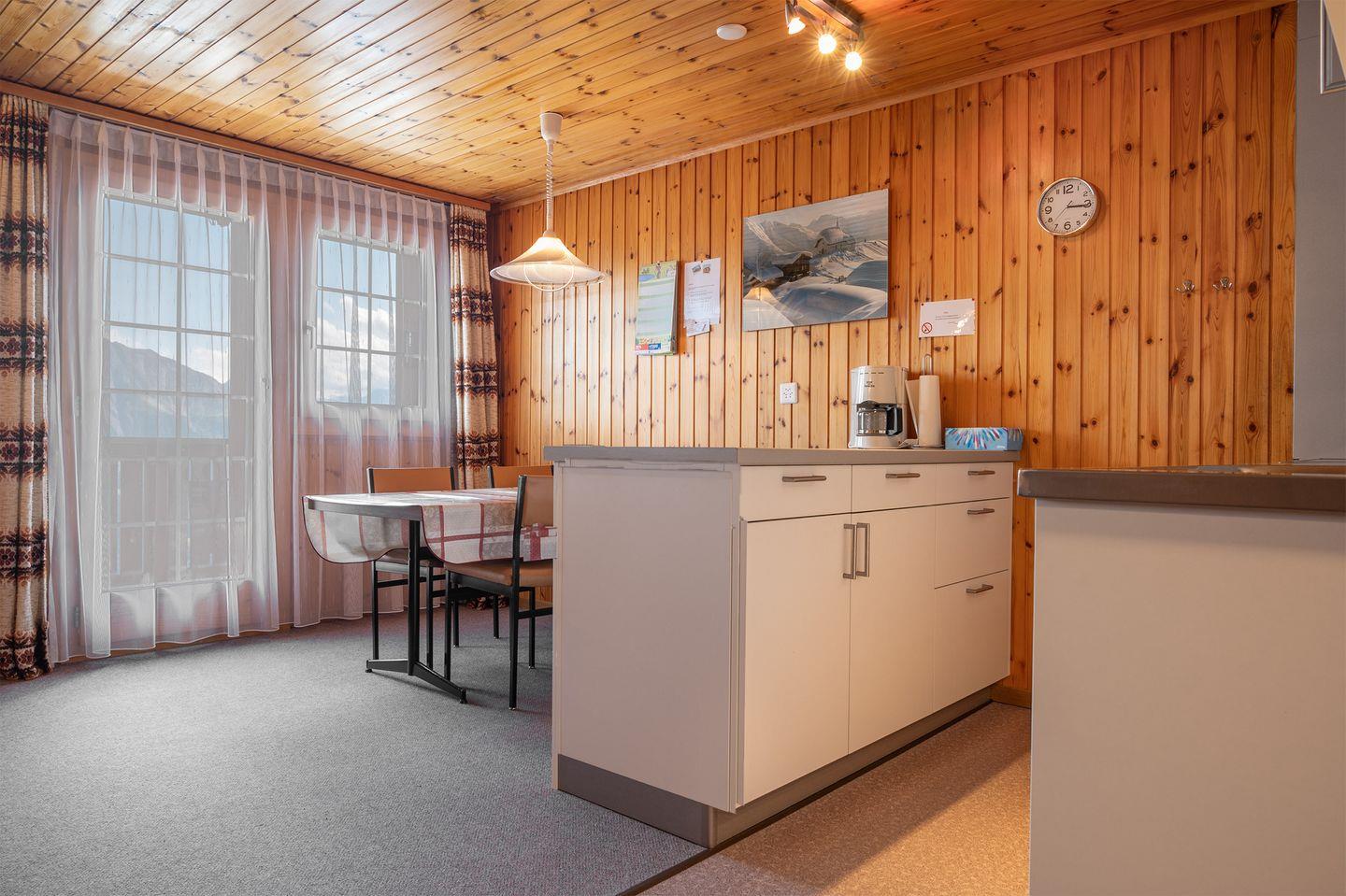 Wohn, Esszimmer mit offener Küche, 1 Doppelbettzimmer 1.60 x 2.00, ein Doppelbettzimmer mit 2 Einzelbetten, im Wohnzimmer 1 Auszugsofa / 1.40 breit geeignet für 1 Erwachsene oder 2 Kinder,1 Badezimmer mit Dusche, Lavabo und Toilette.