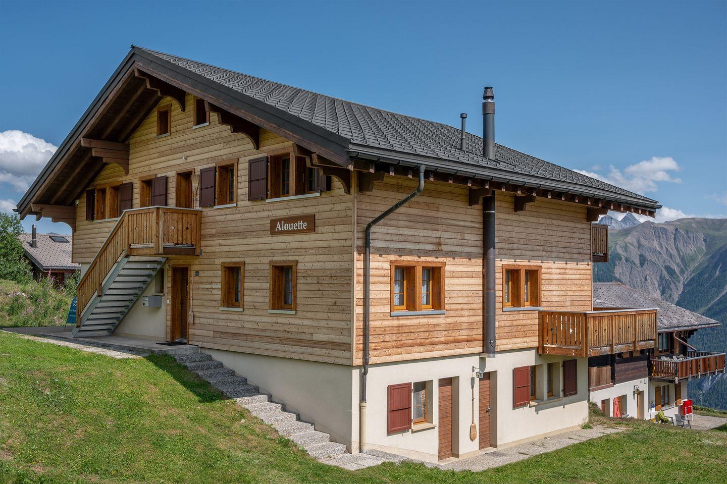 Unser Chalet Alouette ist an bester Lage gelegen, direkt beim Trainerlift, mit Aussicht auf die schöne Walliser Bergwelt.