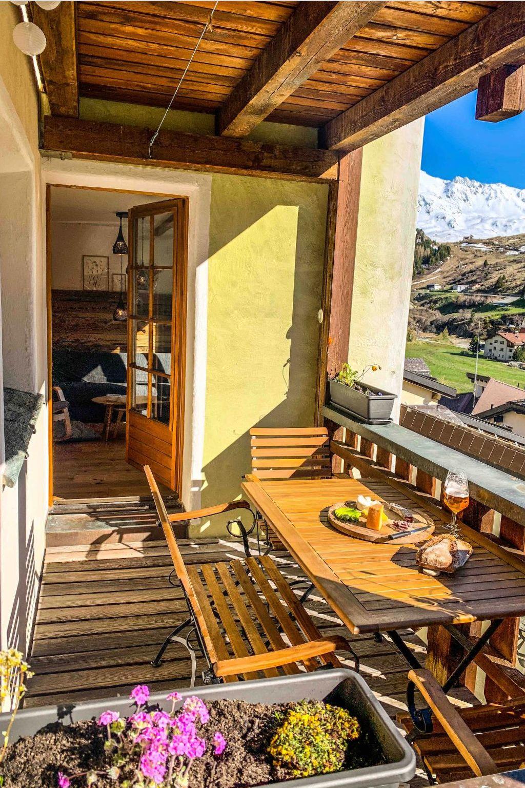We rent out a newly renovated holiday flat with a view of the idyllic village of Bivio and the surrounding mountain landscape. The ski lift, shops, bus station, several restaurants and a large playground are all within a 4-minute walk (approx. 200 metres). The holiday flat comprises a bedroom with double bed, an open-plan kitchen with modern kitchen appliances, a dining area with a cosy corner bench and a living room area with TV. Wifi and Smart TV are free of charge. The flat is rounded off with a 20m2 sunny terrace with a view of the mountains and the ski piste. There are up to 4 sleeping places (double bed, foldaway bed, sofa bed). The flat is easily accessible from the underground car park via a lift and is located on the 8th floor.