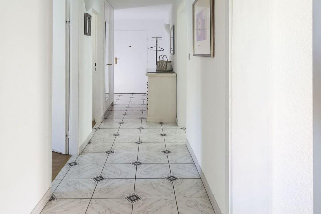 Lejligheden er beliggende i den hævede stueetage i et flerfamiliehus og har et boligareal på 90 m². En lys, rummelig entré fører til badeværelset med badekar og vindue, ved siden af hvilket det funktionelt udstyrede køkken ligger. Der er også et stort, rummeligt soveværelse, en stue med en overdækket, generøs vestvendt altan og to separate værelser, der kan bruges som gæsteværelser, kontor eller børneværelser. Alle værelser er lyse og udstyret med loftsvarme. Lejligheden er beliggende i et smukt, velholdt boligkompleks med et rummeligt grønt område, der er tilgængeligt for alle beboere.