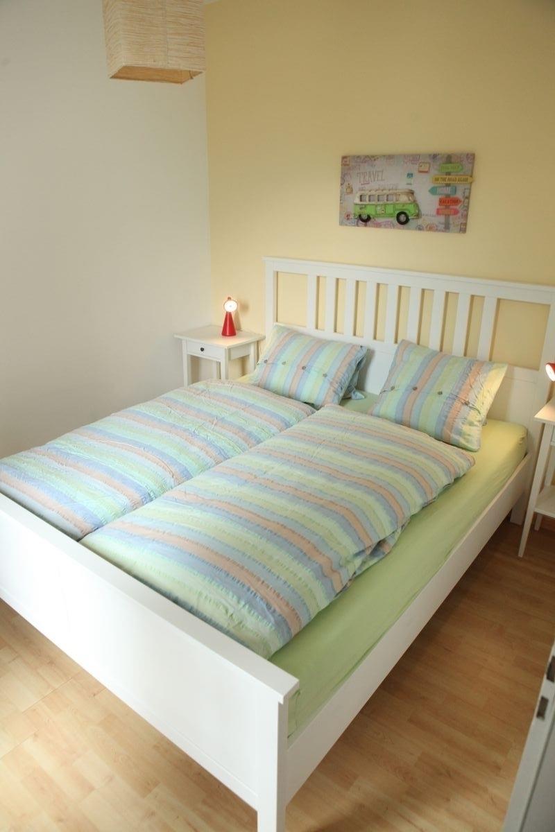 Ein weiteres kleines Schlafzimmer bietet ein breites Bett von 160 cm, ebenfalls mit 2 Matratzen.