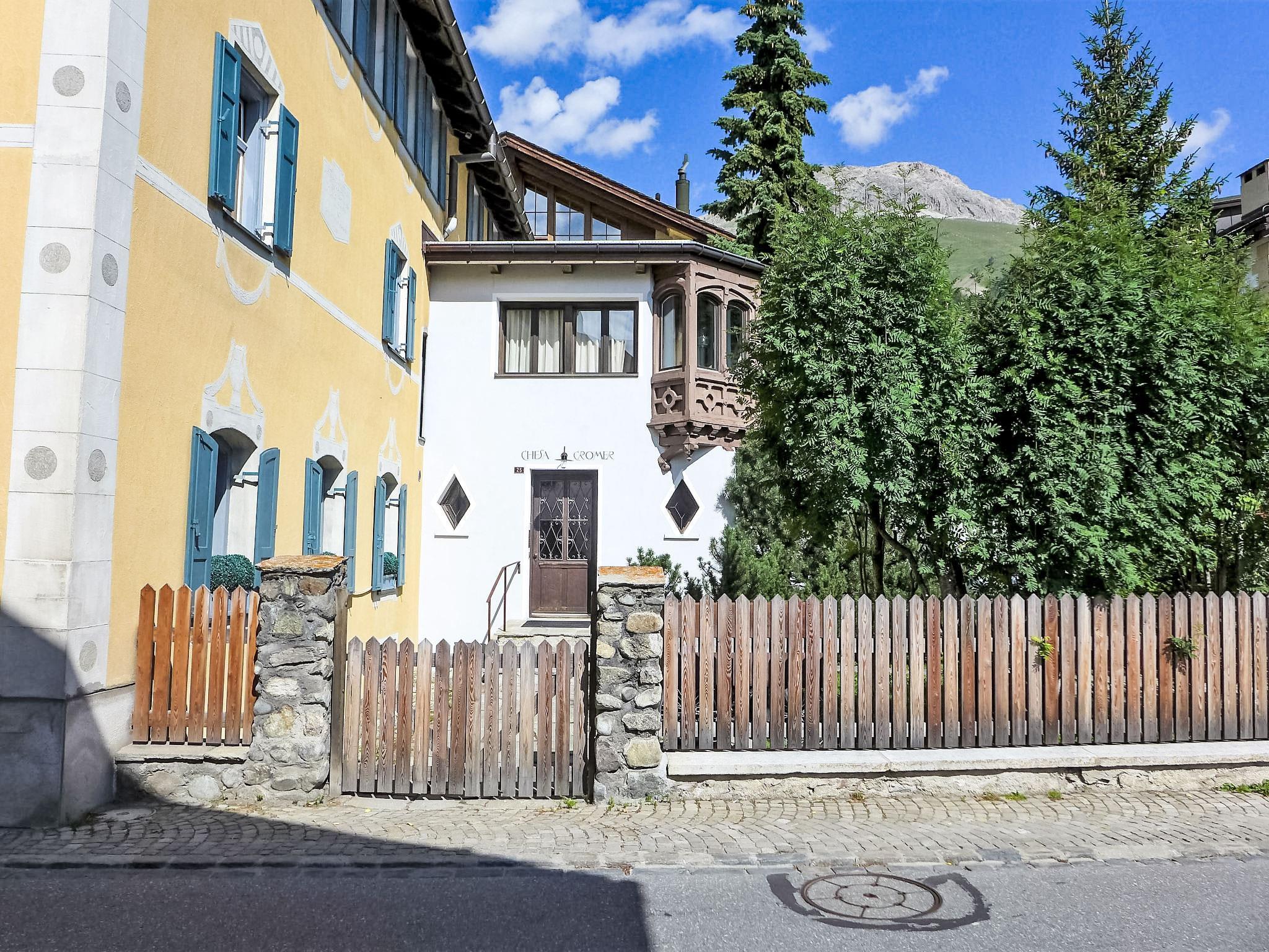 Celerina 4 km from St. Moritz: Historical apartment house "Chesa Cromer", 2 storeys, semi-detached. On the outskirts, in the residential district, 2.9 km from the lake, 800 m from the skiing area. In the house: storage room for skis, central heating system, washing machine (extra), tumble dryer (for shared use, extra). Parking space n 2. Shop 190 m, supermarket 500 m, restaurant 280 m, bakery 500 m, bicycle rental 260 m, bus stop "Celerina, Cresta Kulm" 170 m, railway station "Celerina" 700 m, indoor swimming pool 4.9 km, lake St. Moritzer See 2.9 km. Golf course (18 hole) 3.5 km, surf school 9 km, tennis 500 m, indoor tennis centre 5.1 km, minigolf 4.9 km, riding stable 5.4 km, walking paths from the house 500 m, cycle lane 500 m, cable car, mountain railway, ski lift, slopes 800 m, ski rental 190 m, ski bus stop 170 m, ski school 800 m, children's ski school 800 m, sled run 2.6 km, cross country ski track 1.5 km, ice rink 500 m, children's playground 600 m. Nearby attractions: Olympia Bob Run mit Bobmuseum 1.8 km, Kirche San Gian 1.7 km, Segantini Museum in St. Moritz 3.3 km, Museum Alpin in Pontresina 6.1 km, Bernina Express UNESCO Welterbe. Well-known ski regions can easily be reached: Corviglia Piz Nair 800 m, Corvatsch - Furtschellas 10.8 km, Diavolezza - Lagalb 16.5 km. Well-known lakes can easily be reached: St. Moritzer See 2.9 km, Silvaplaner See 8.5 km, Silser See 12.3 km. Hiking paths: Stazerwald & Stazersee, Corviglia Piz Nair, Muottas Muragl. Please note: no lift. Ski bus (free of charge). Free ski bus service to the ski region Parkplatz Talstation Marguns (Corviglia). Please note: Loading and unloading of baggage is possible at the holiday house.