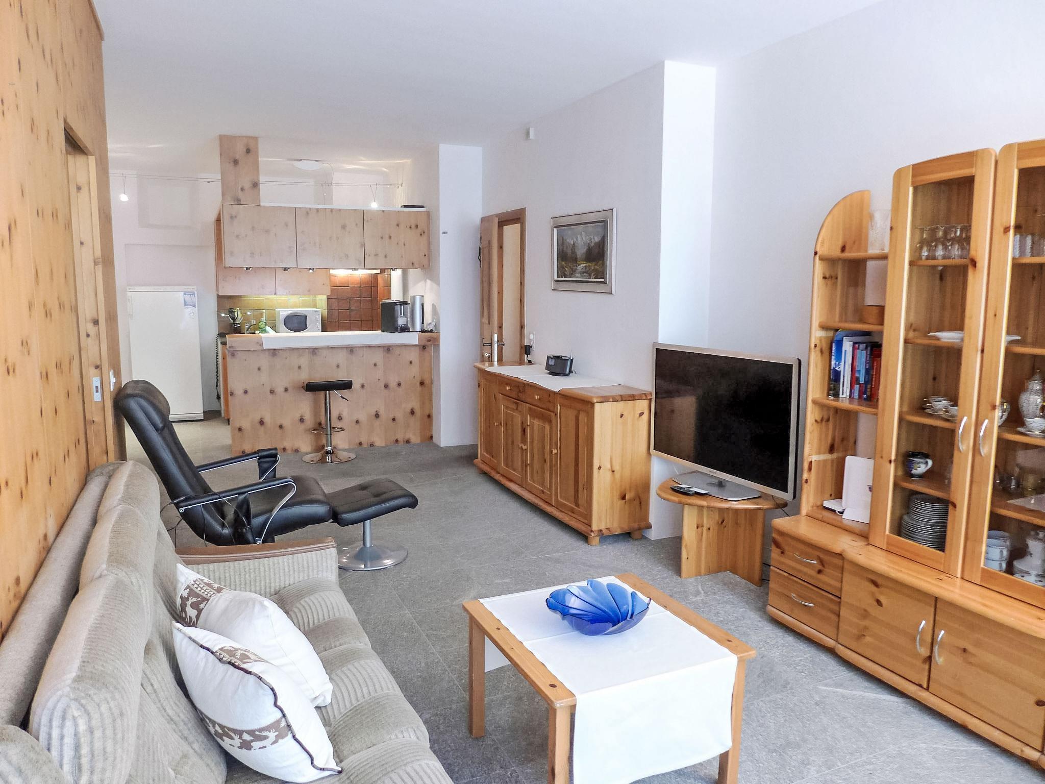 "Chesa Cromer", 3-room apartment 80 m2, on the upper ground floor. Spacious, simple and cosy furnishings: open living/dining room, window onto the courtyard with TV (flat screen), radio. Exit to the balcony, west facing position. 1 large double bedroom with 1 double bed (2 x 90 cm, length 200 cm), shower/WC. Exit to the balcony. 1 room with sliding door with 1 x 2 bunk beds (140 cm, length 200 cm). Open kitchen (oven, dishwasher, 4 ceramic glass hob hotplates, toaster, kettle, microwave, electric coffee machine, Capsules for coffee machine (Nespresso) extra, raclette grill, fondue Set (chinoise, cheese)). Bathroom, sep. WC. Heating. Natural stone floors. Balcony furniture. Side view of the mountains and the resort. Facilities: iron, hair dryer. Internet (WiFi, free). Parking space n 2. Please note: suitable for families apartment carpark side. Non-smokers only. Maximum 1 pet/ dog allowed. No lift.