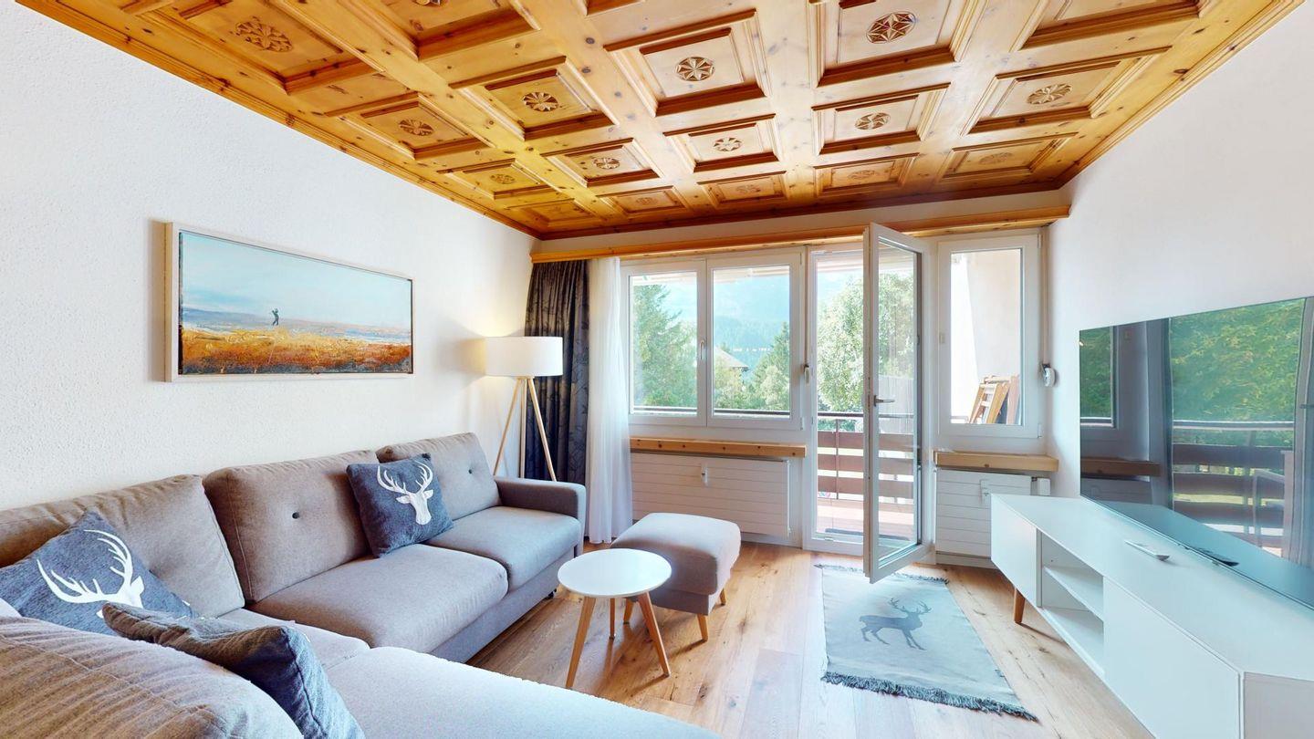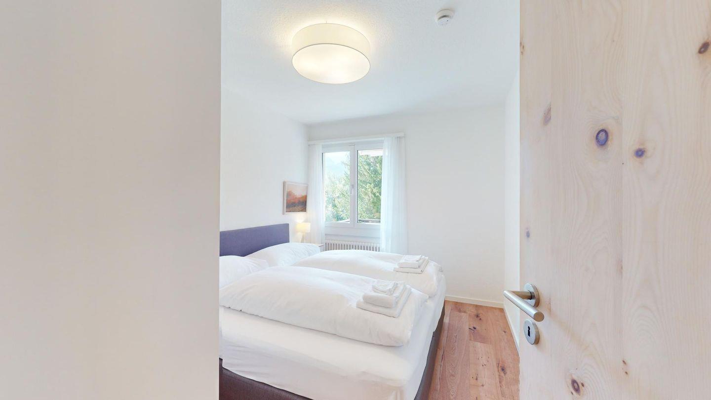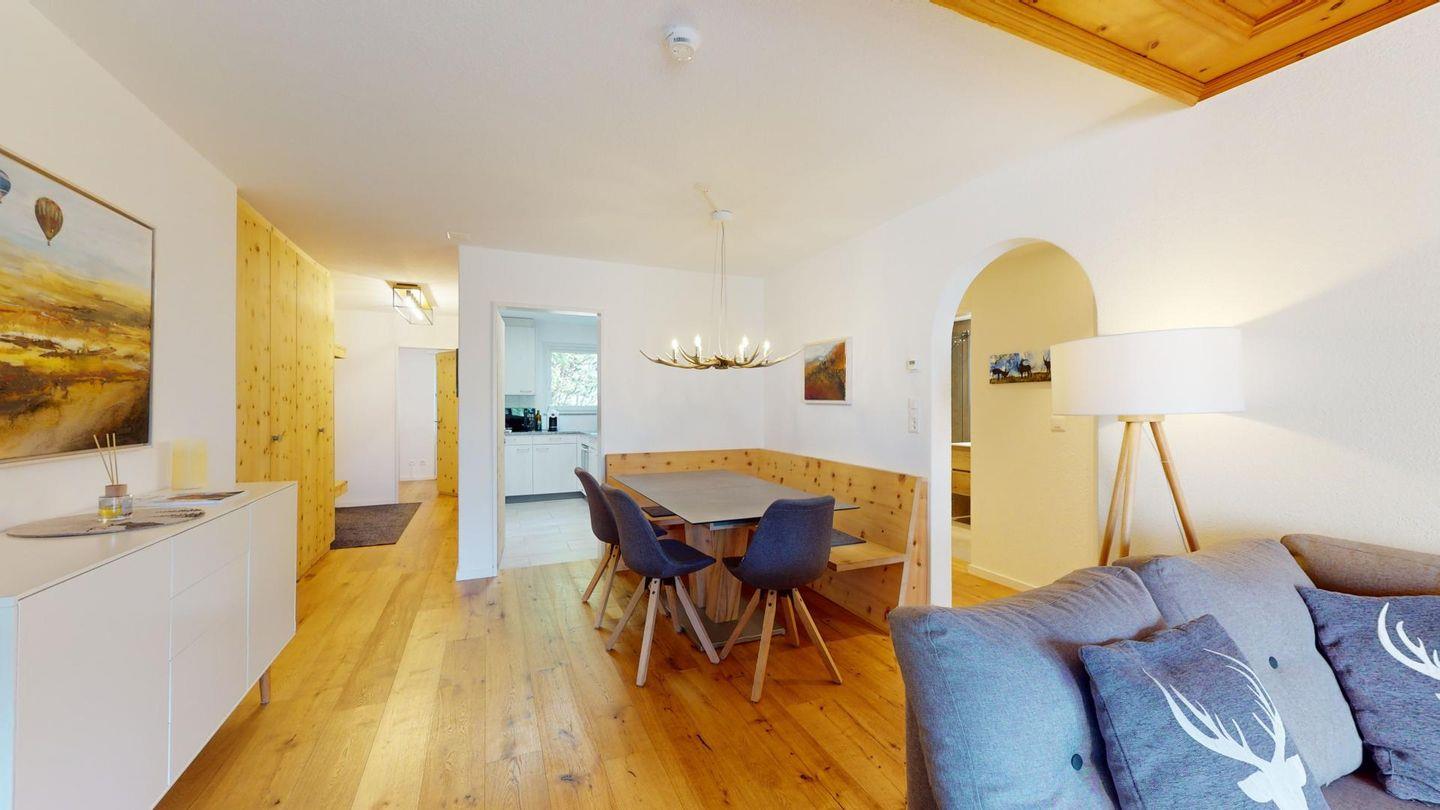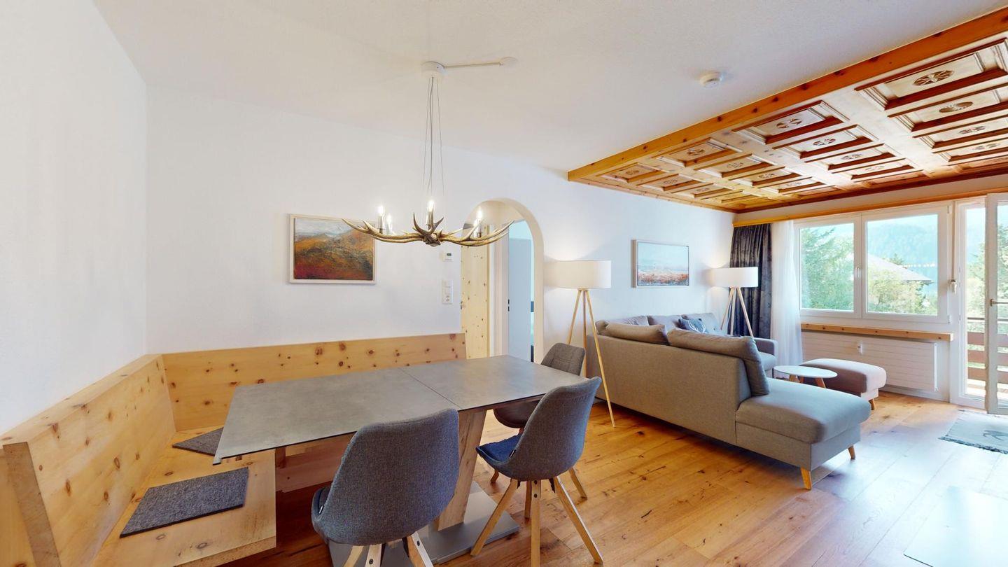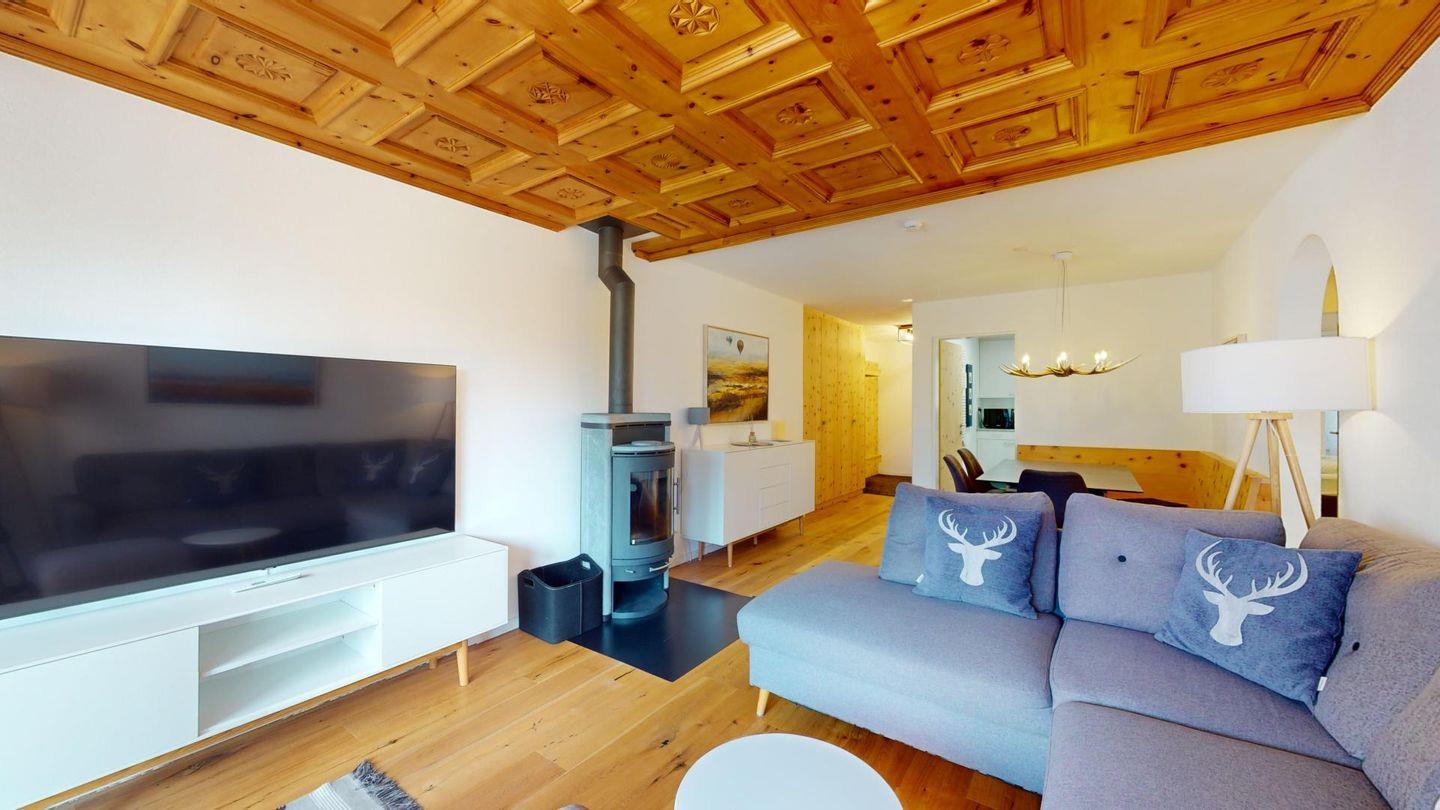 4-Zimmerwohnung im erhöhten Erdgeschoss, 80m². Entree mit Garderobe. Wohn-/ Esszimmer mit Kamin. Südbalkon mit Bergsicht. Separate Küche mit Backofen, Kühlschrank, Chicco d'Oro Kaffeemaschine und Geschirrspülmaschine. Schlafzimmer mit zwei Einzelbetten. Ein Schlafzimmer mit einem Doppelbett. Bürozimmer. Dusche/WC/Lavabo. Bad/WC/Lavabo. TV, Radio und Internet. Erstklassige und moderne Einrichtung. Holzböden in den Schlaf- und Wohnzimmern. Zur Wohnung gehört auch eine private Garagenbox (Einfahrt max. 2.2m breit, 1.9m hoch) für ein Fahrzeug. Ski und Skischuhe können im Skiraum oder in der Garage deponiert werden. Haustiere und Rauchen sind nicht erlaubt.