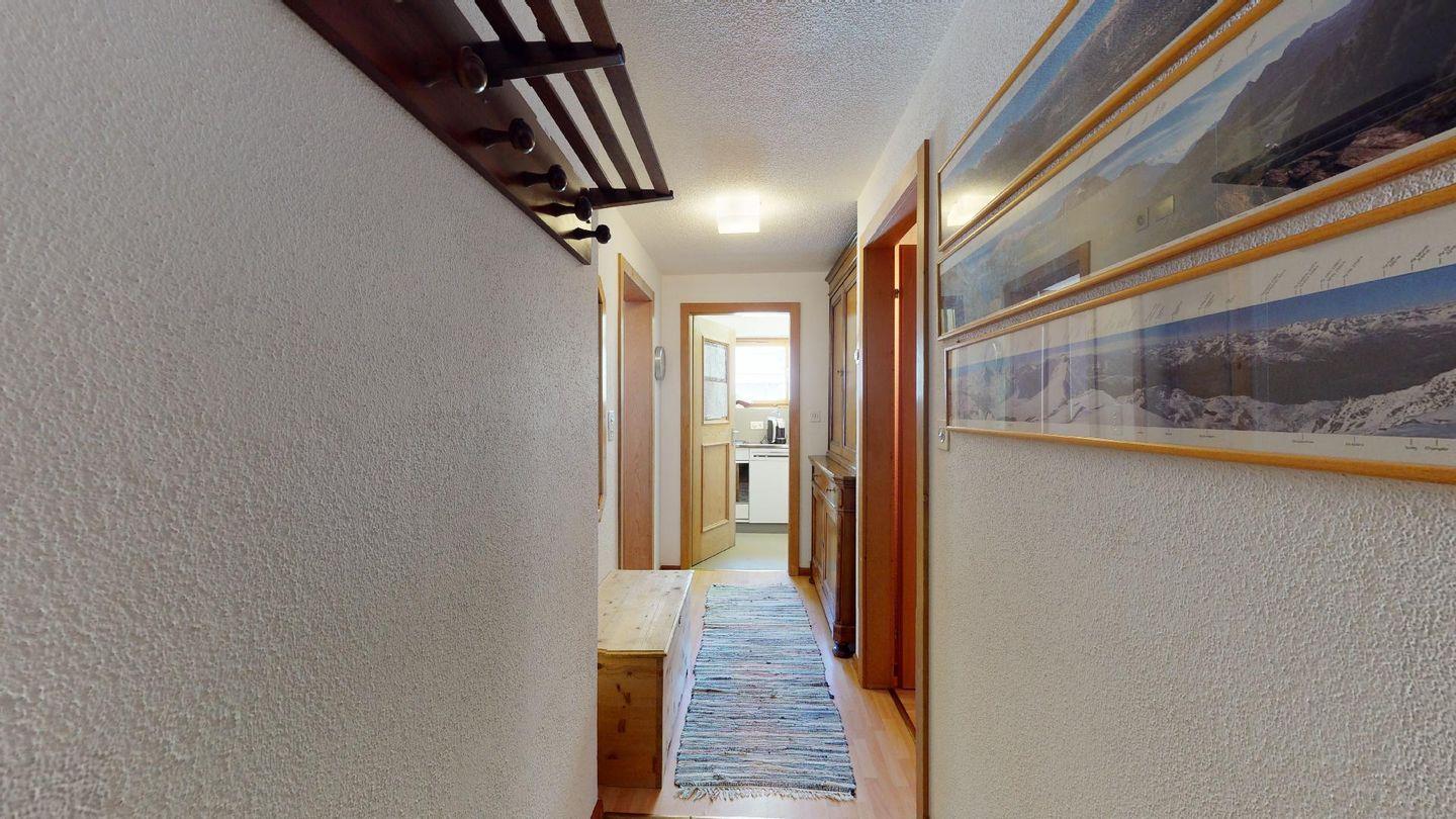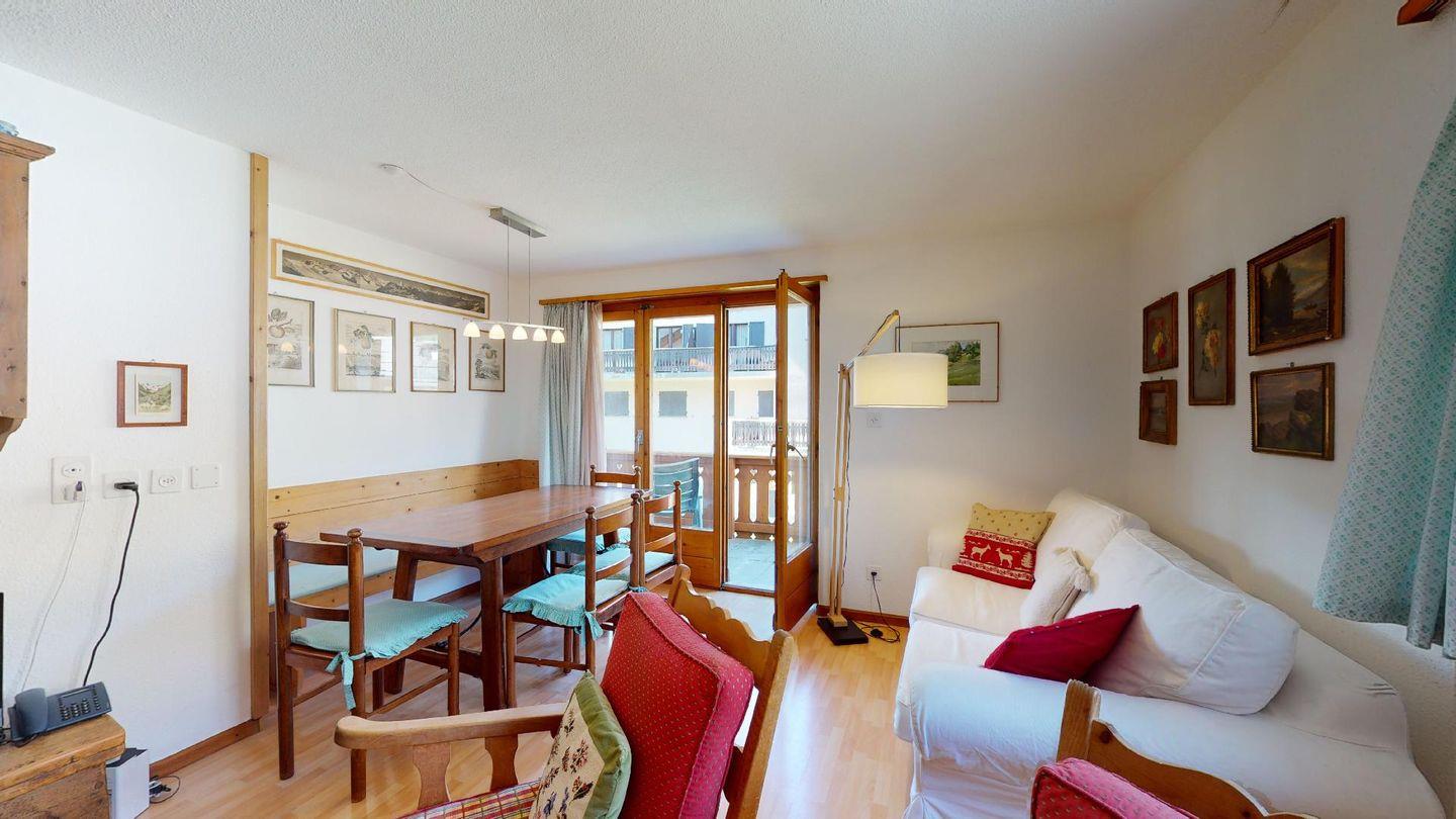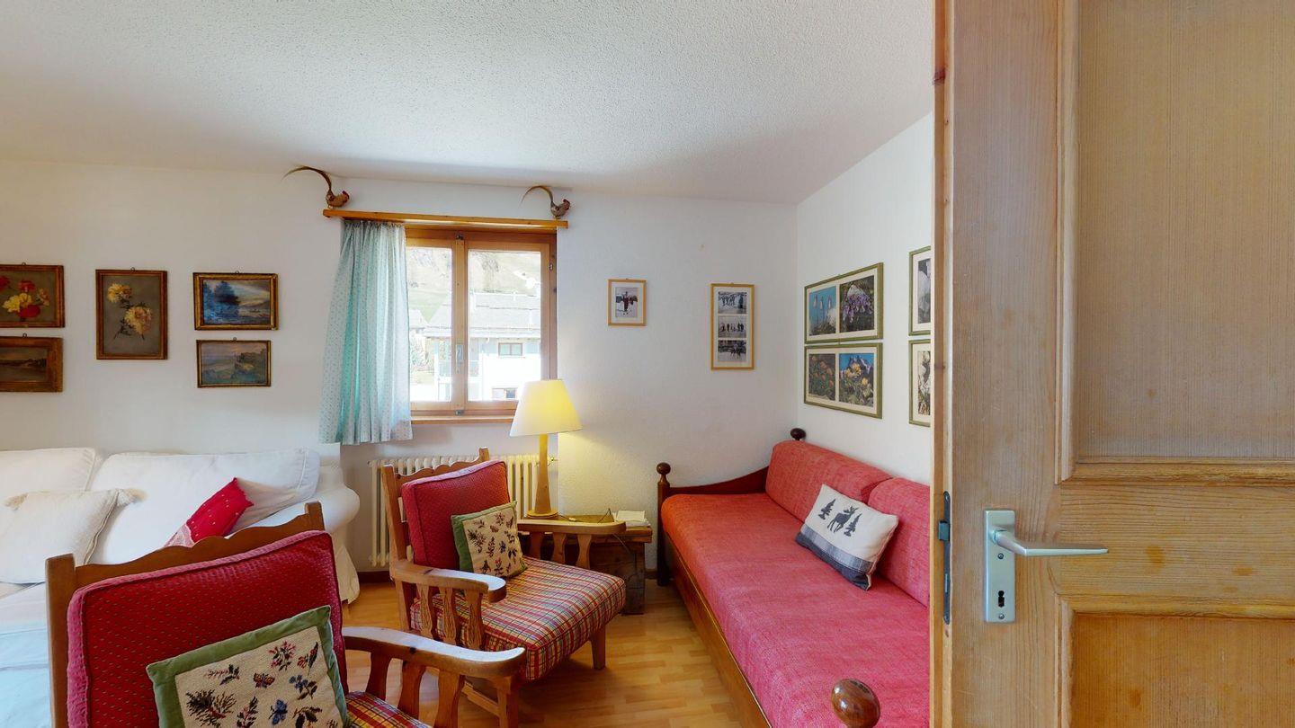 2-Zimmerwohnung, ca. 55 m2, im 2. Stock. Eingang mit Garderobe. Separate Küche mit Fenster, Backofen, Kühlschrank, Filterkaffeemaschine und Geschirrspüler. Wohnzimmer mit Schlafsofa (150x180), Essecke und Ausgang zum (Süd-)Balkon. Fernseher, Radio, Telefon und Internet. 1 Doppelzimmer (2x90x200). Bügeleisen und Bügelbrett. Parkettboden. Einfache, rustikale Einrichtung. Skiraum und Waschküche zur gemeinsamen Benützung. Keine Garage und kein Aussenparkplatz. Haustiere sind nicht erlaubt.