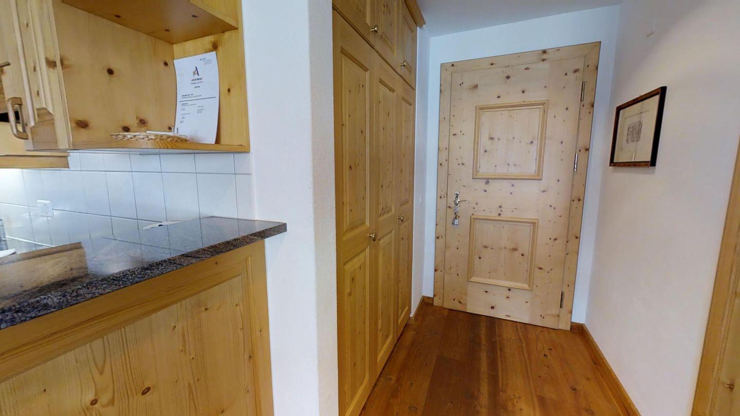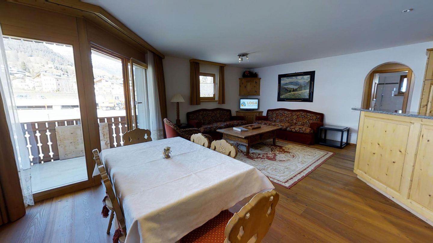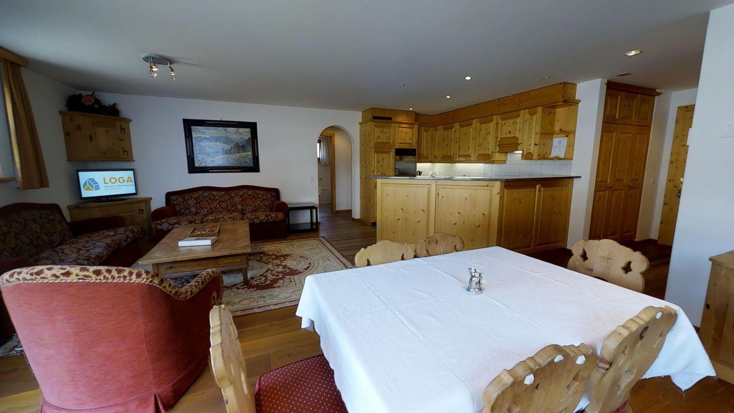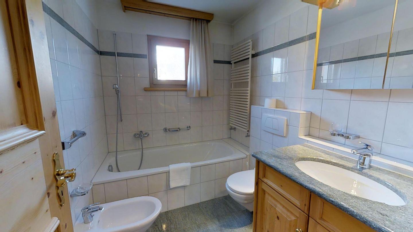 3½-Zimmerwohnung im 1. Stock, ca. 105 m2. Entree mit Garderobe. Wohn-/Esszimmer, Radio und TV. Offene Küche mit Backofen, Kühlschrank, Geschirrspüler und Kaffeemaschine (Chicco d'Oro). Doppelschlafzimmer (2x90x200). Ein Bad/WC/Bidet/Lavabo mit Fenster. Zimmer mit einem Einzelbett (90x200) und einem Etagenbett (90x200). Dusche/WC und Lavabo. Bügeleisen und Bügelbrett. Tiefgarage. Skiraum und Waschküche zur allgemeinen Benützung. Haustiere sind nicht erlaubt. Anreise Samstag