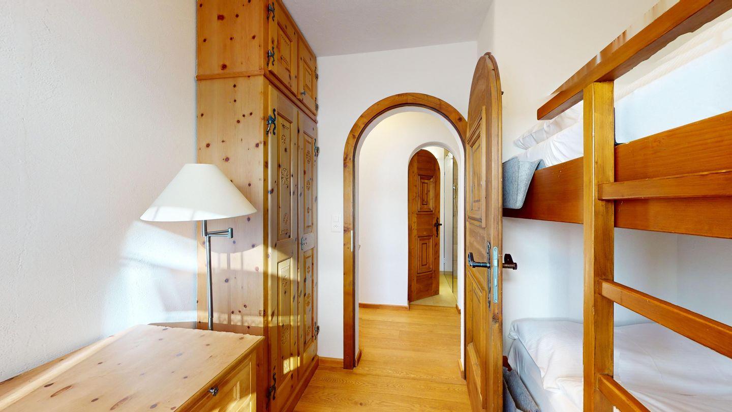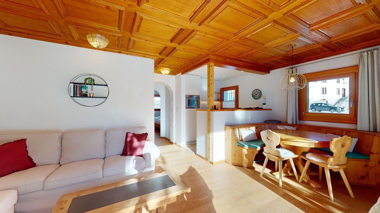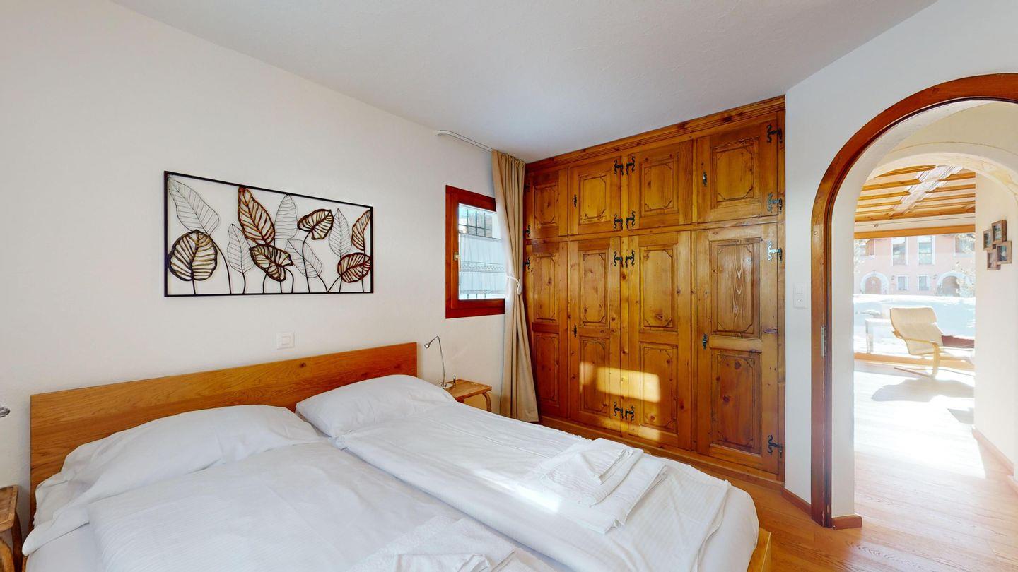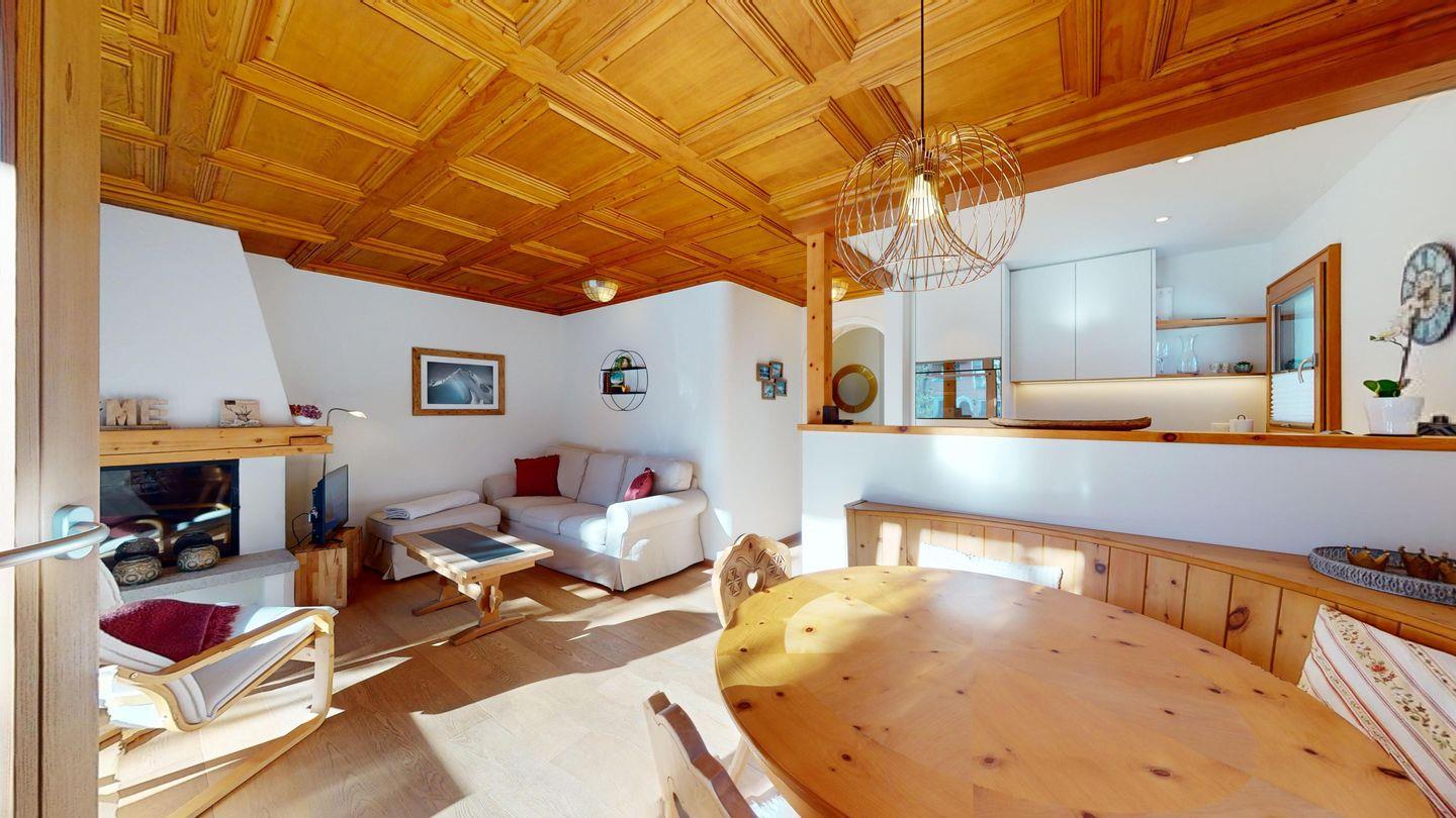 3-Zimmerwohnung im Hochparterre. Eingang mit Garderobe. Offene Küche mit Kühlschrank, Backofen, Geschirrspülmaschine, Chicco d'Oro Kaffeemaschine und Fondue. Wohn-/ Esszimmer mit Balkon und TV. Cheminée kann nicht benutzt werden. Ein Doppelschlafzimmer (160x200) und ein Kinderschlafzimmer mit Etagenbett (80x200). Bad/WC/Lavabo. Ein Garagenplatz. Neue komfortable Einrichtung. Waschküche und Skiraum zur Mitbenützung. Nichtraucherwohnung. Haustiere sind nicht erlaubt.