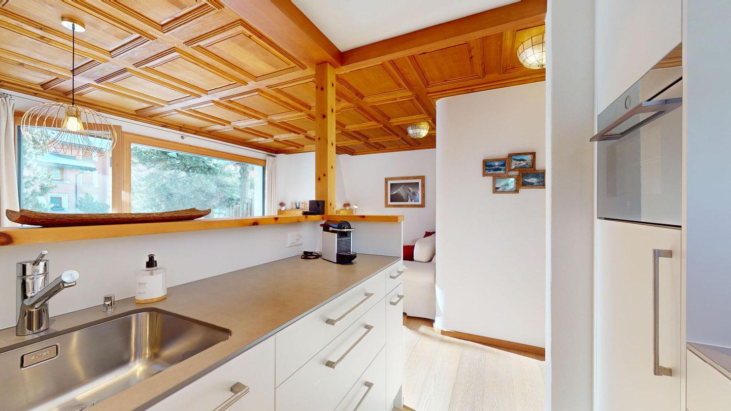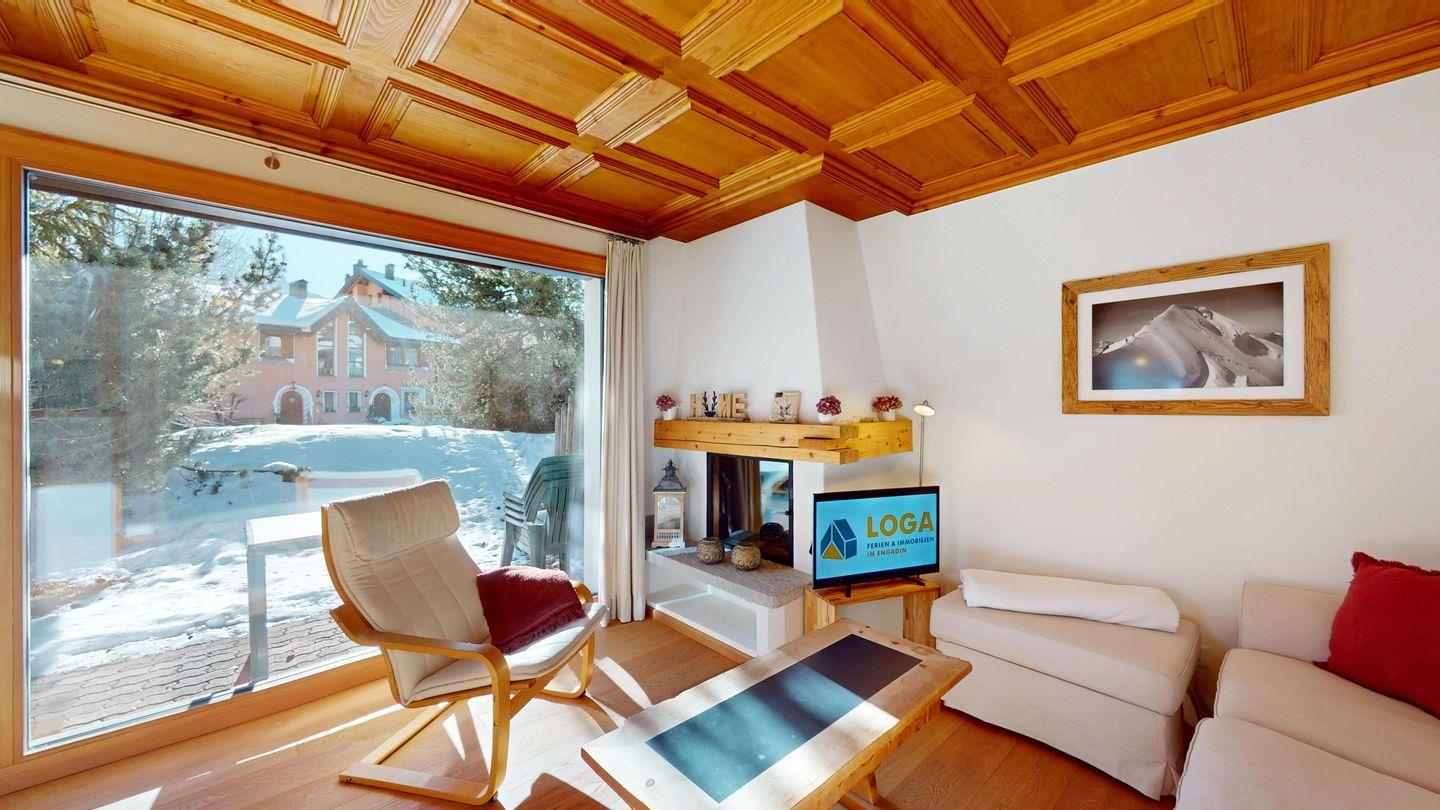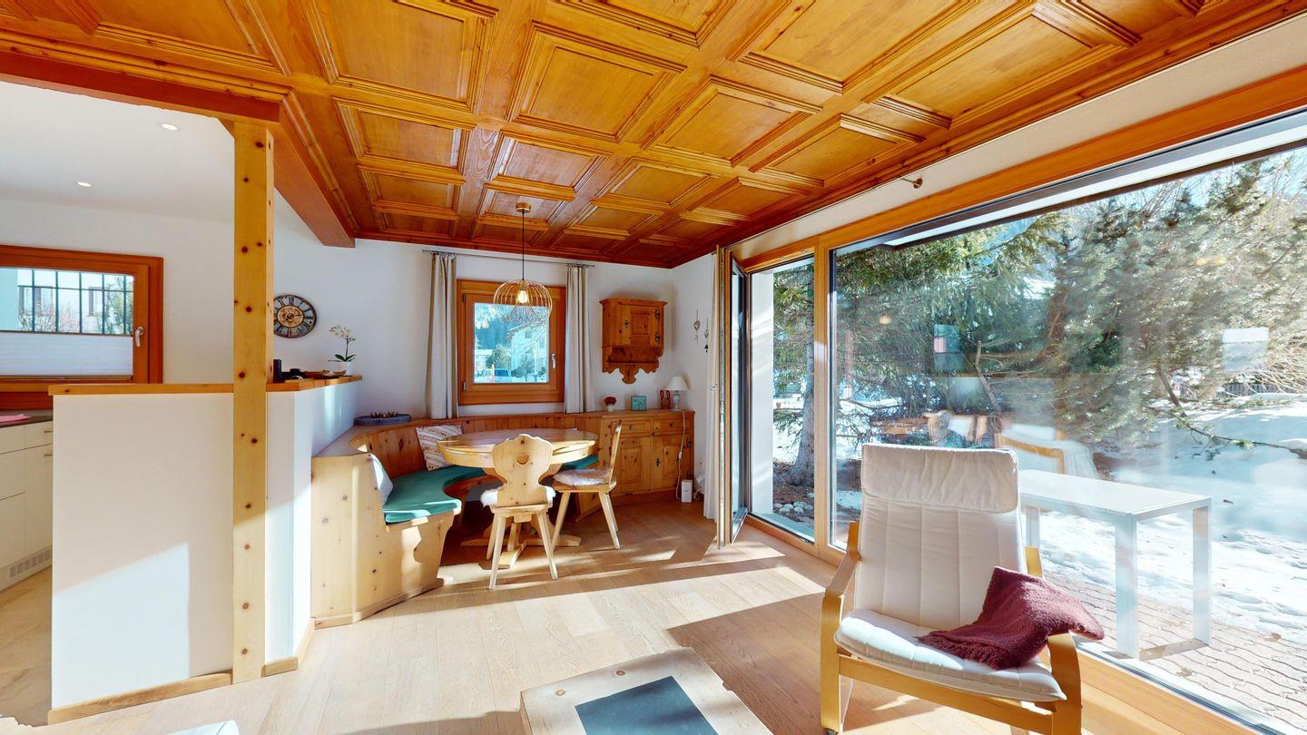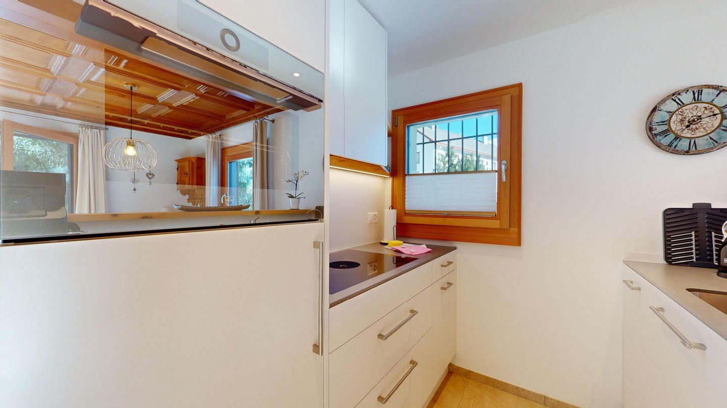 3-Zimmerwohnung im Hochparterre. Eingang mit Garderobe. Offene Küche mit Kühlschrank, Backofen, Geschirrspülmaschine, Chicco d'Oro Kaffeemaschine und Fondue. Wohn-/ Esszimmer mit Balkon und TV. Cheminée kann nicht benutzt werden. Ein Doppelschlafzimmer (160x200) und ein Kinderschlafzimmer mit Etagenbett (80x200). Bad/WC/Lavabo. Ein Garagenplatz. Neue komfortable Einrichtung. Waschküche und Skiraum zur Mitbenützung. Nichtraucherwohnung. Haustiere sind nicht erlaubt.